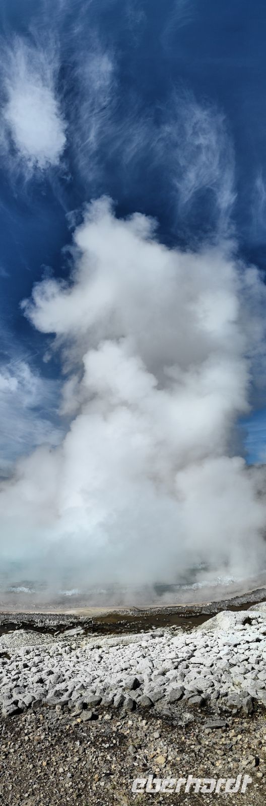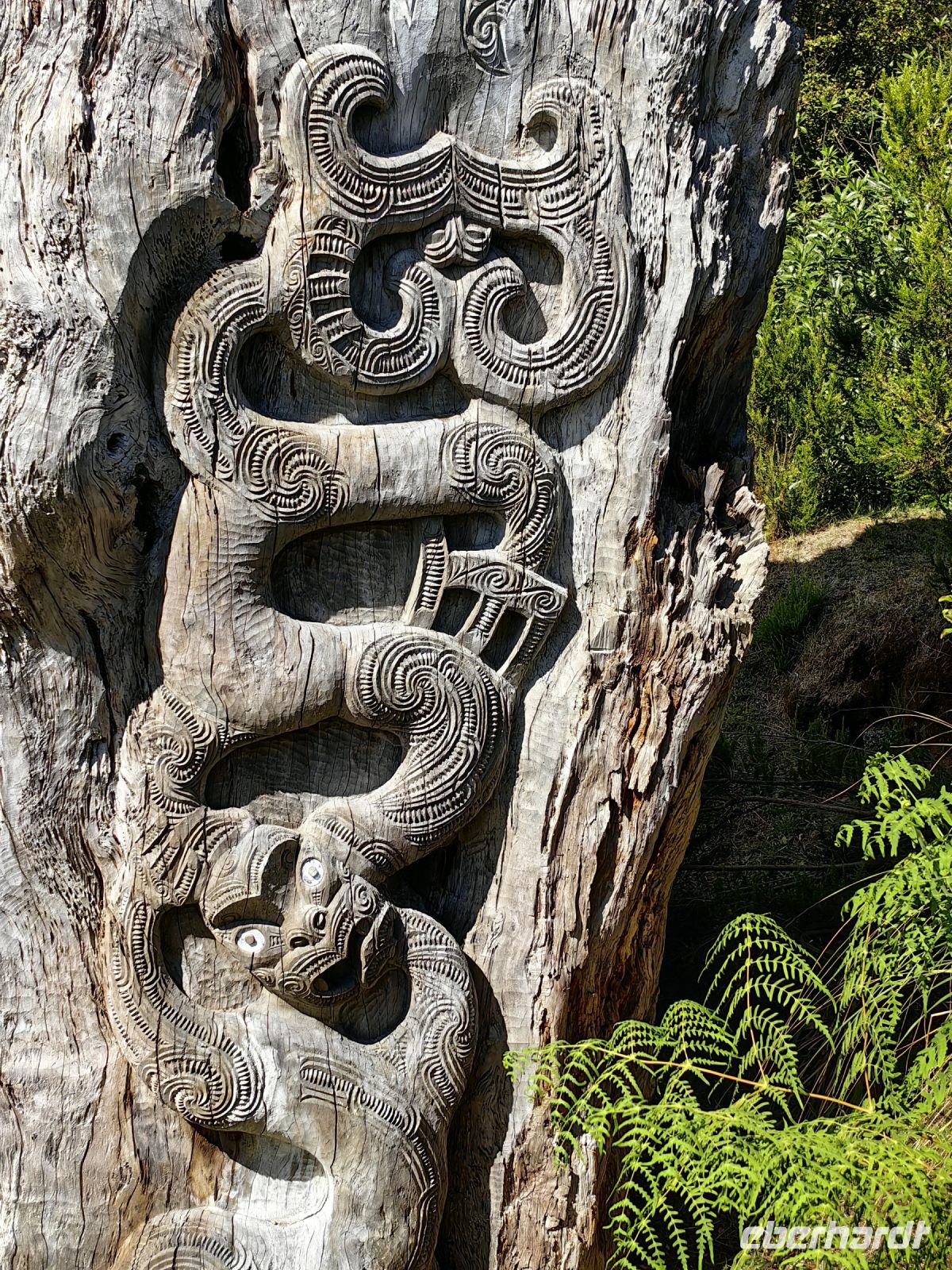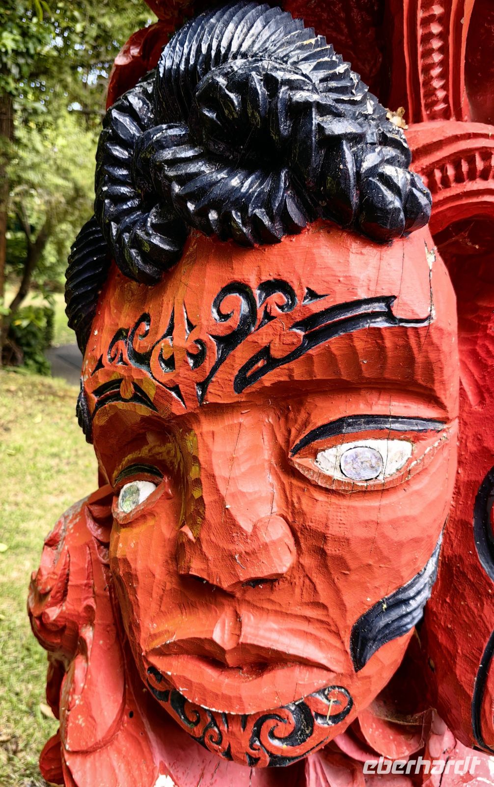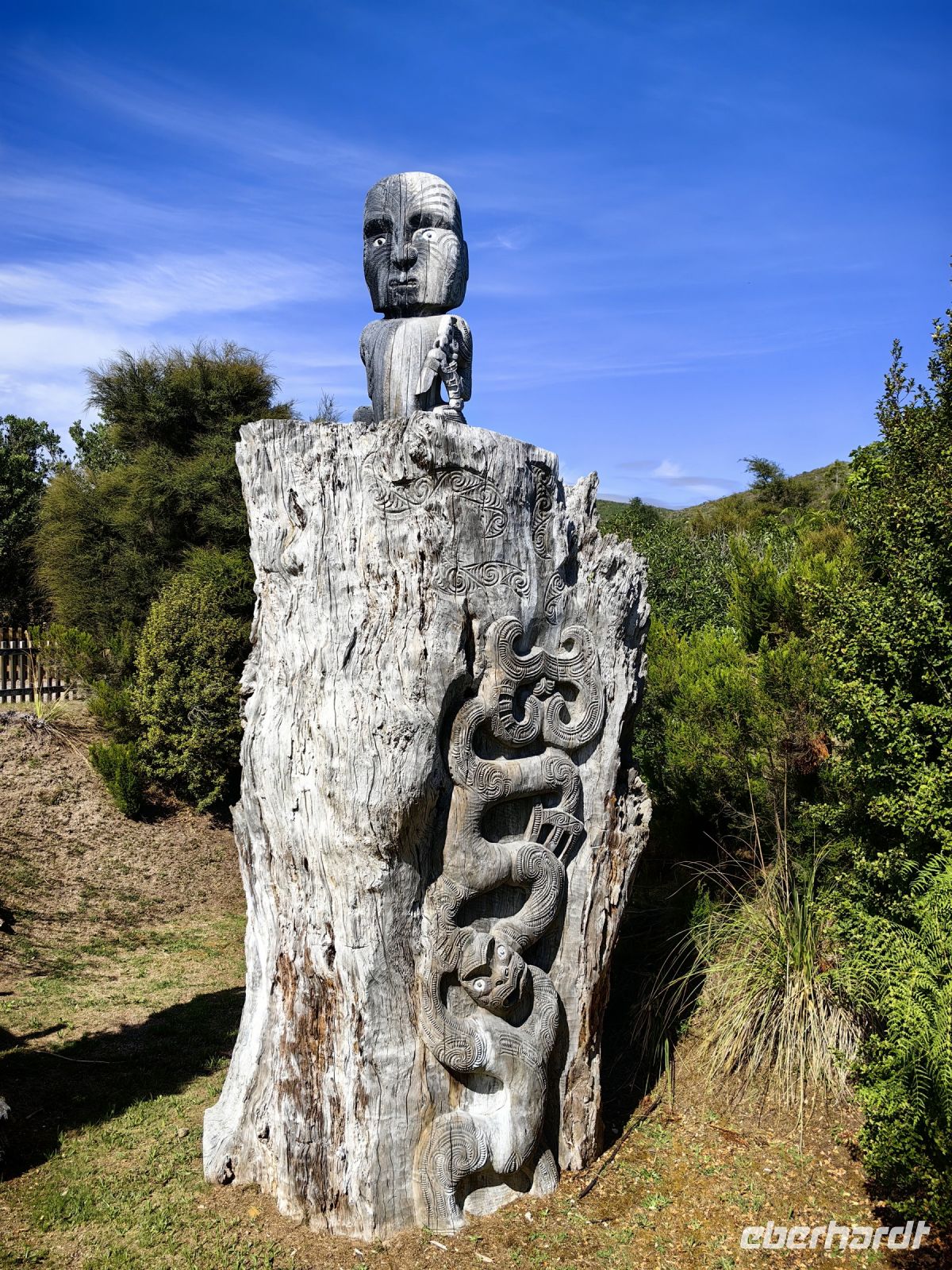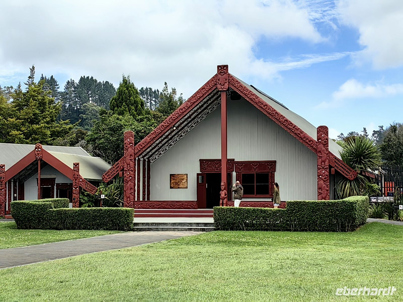 Te Puia ist unser nächstes Ziel. Gelegen im Whakarewarewa-Valley, ist diese Geothermalzone mit etwa 500 Geysiren und heißen Quellen ein Besuchermagnet und als wir ankommen, haben wir das Glück, den Ausbruch eines Geysirs live mitzuerleben. Es sprudelt meterhoch, daneben blubbert graubrauner Schlamm und über allem liegt der Geruch von Schwefel. Im Gelände gibt es seit einigen Jahren ein Ausbildungszentrum für Maori, wo das traditionelle Schnitzen und Weben und die Veredlung von Jade vermittelt werden. Wir können den Handwerkern über die Schultern schauen und die wunderschönen Werke kann man im Laden am Ausgang für stattliche Summen gleich erwerben.