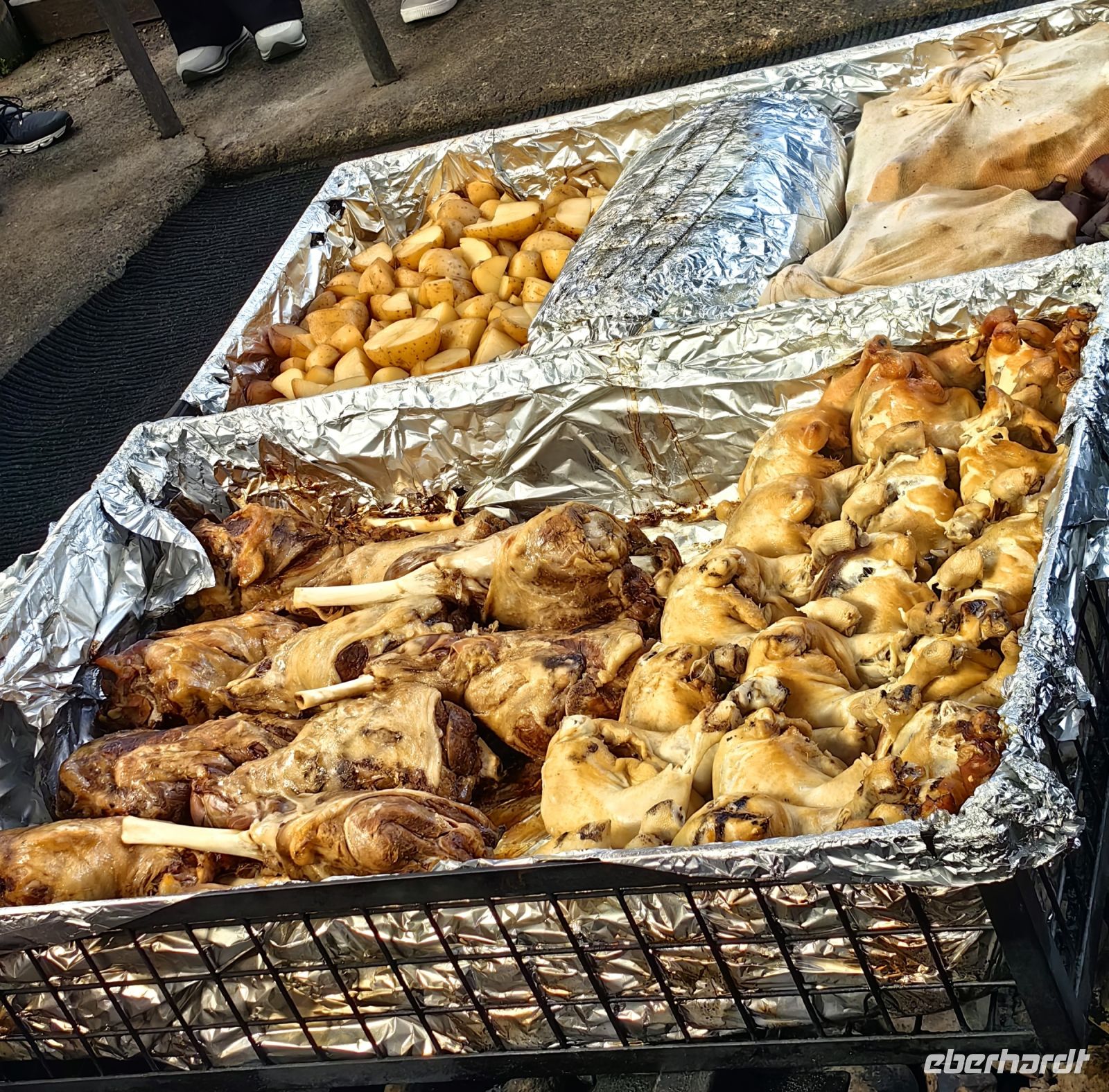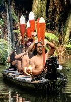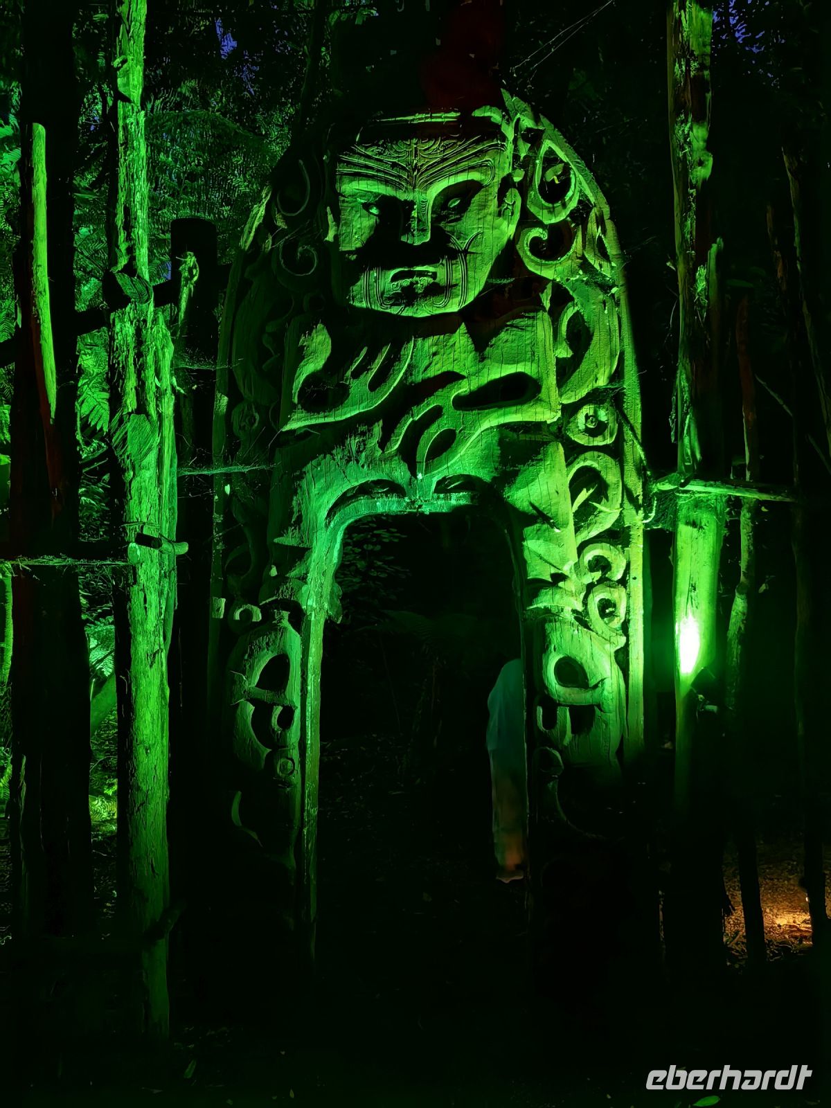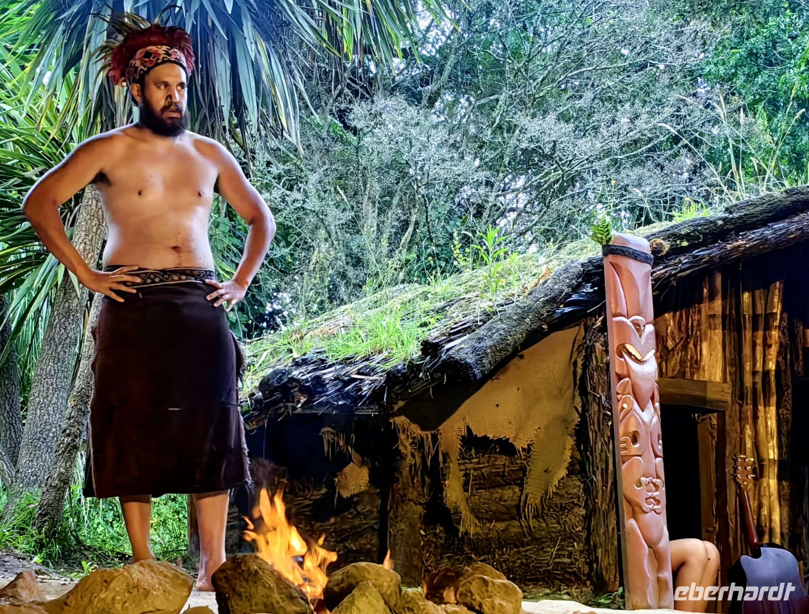 Nach einem kurzen Abstecher im Hotel treffen wir uns an der Rezeption wieder und fahren zum abendlichen Höhepunkt dieses Tages - einem Hangi. Bei diesem traditionellen Maoriessen wurden früher alle Speisen in Sisal und Blätter gewickelt und mehrere Stunden in einem Erdofen mit Hilfe von heißen Steinen gegart, Heute kommen Metallkörbe, Stoffe und Alufolie zum Einsatz. Daß das Ergebnis trotzdem immer noch fantastisch schmeckt, davon überzeugen wir uns, nachdem wir von einer Maorifamilie freundlich empfangen wurden. Wir beobachten ein mit Kriegern besetztes Kanu, sie kommen laut rufend und die Waffen über dem Kopf schwenkend auf uns zu und wir können uns gut vorstellen, was die ersten Europäer bei diesem Anblick gefühlt haben müssen, als sie einst hier in Neuseeland landeten.