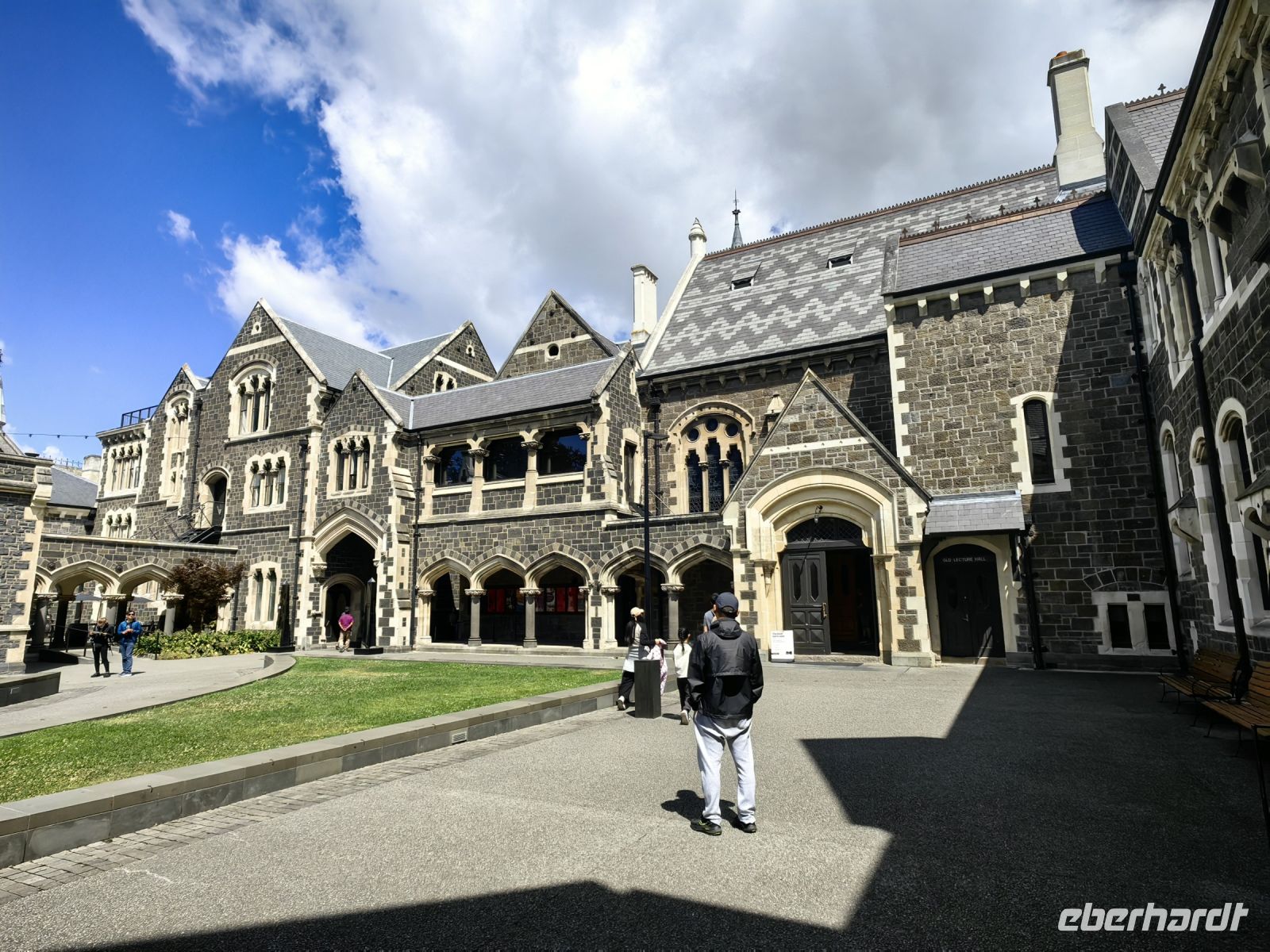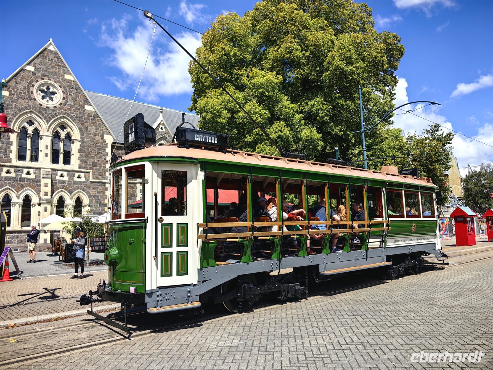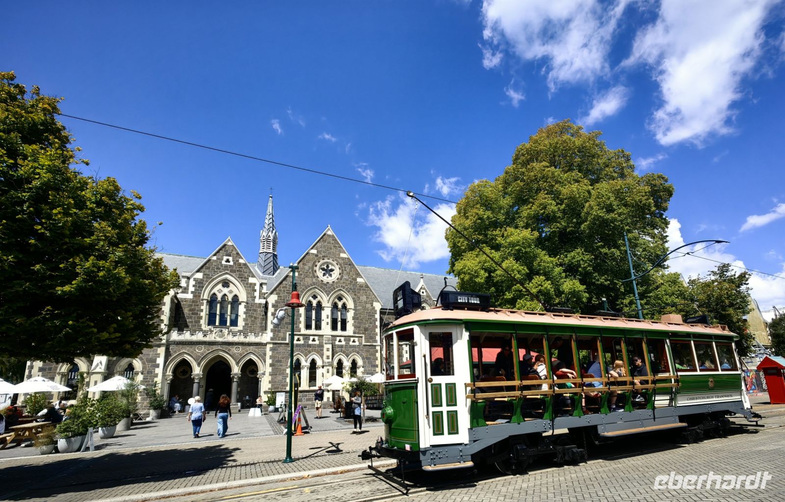 Wenig später setzen wir unsere Reise in Richtung Christchurch in der Region Canterbury fort. Diese Stadt mit 350.000 Einwohnern ist die größte der Südhalbinsel und wird bis heute mit dem verheerenden Erdbeben vom Februar 2011 in Verbindung gebracht. Noch immer sehen wir viele Gebäude, die renoviert oder repariert werden müssen. Wir halten in der Nähe des Art Centers, in dem sich auch die Christchurch Cathedral und die Great Hall befinden. Allesamt erinnern vom Baustil an England und die Harry Potter Filmkulisse. Hier befinden sich Teile der Universität, Cafés, kleine Straßenrestaurants, und der Botanische Garten lädt gleich gegenüber zu einem Bummel an den Blumenbeeten entlang ein. Durch die Stadt fährt eine historische Straßenbahn, die Besucher anstatt der anderswo modernen Hop on Hop off Busse für eine Rundfahrt besteigen können.