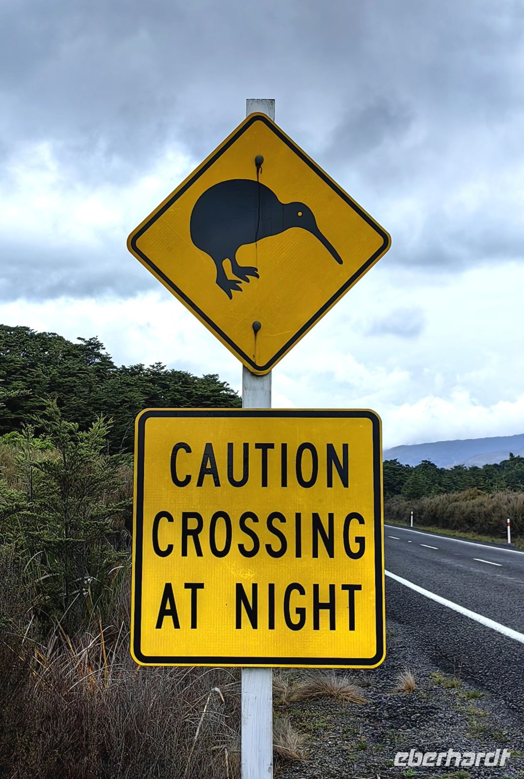 Im Tongariro Nationalpark, dem ältesten Nationalpark des Landes, halten wir am lang ersehnten Verkehrswarnschild mit einem Kiwi drauf und posieren alle eifrig daneben und davor. Solch ein Schild gibt es nur hier in Neuseeland.