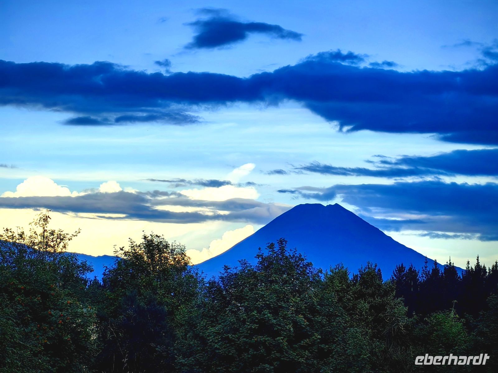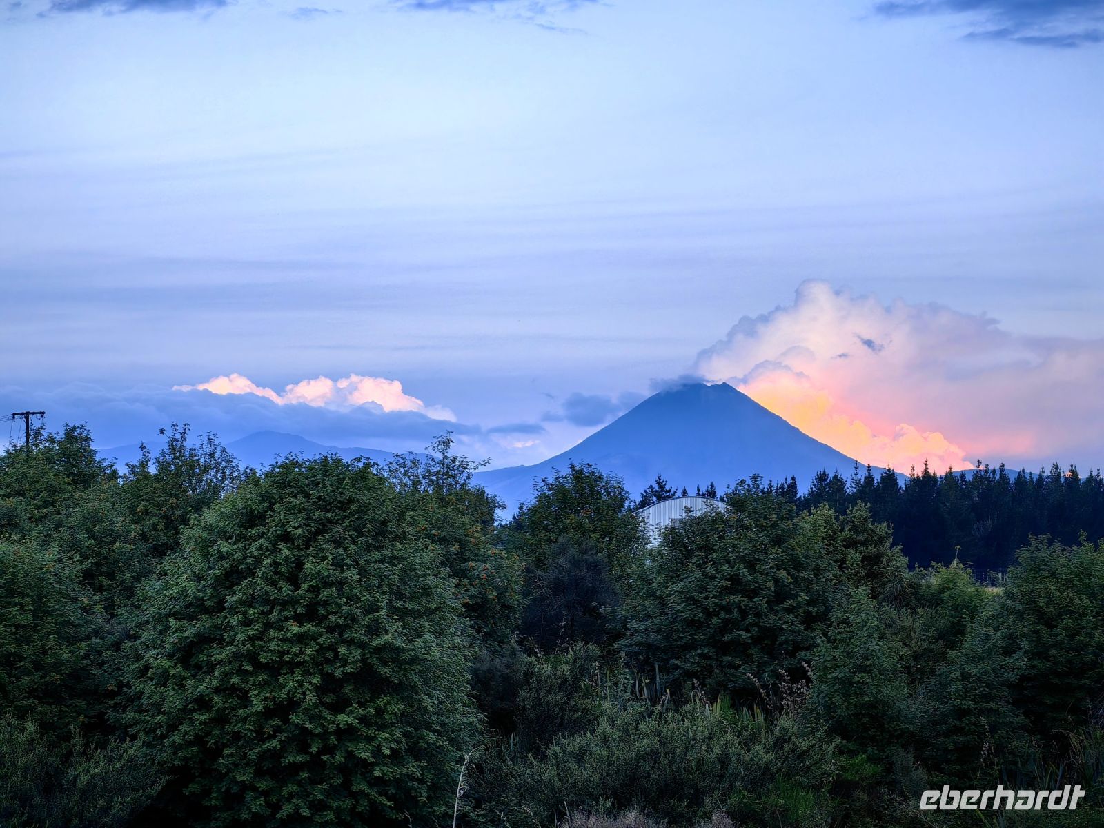 Als wir gerade beim Abendessen sitzen, zeigt sich endlich der Gipfel des Ngauruhoe im rosaroten Abendlicht und diese Szenerie bietet den wunderschönen krönenden Abschluß des heutigen Tages.