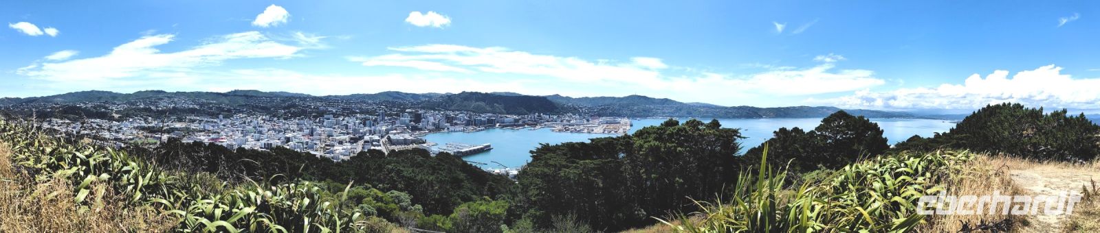 Am frühen Nachmittag erreichen wir die Hauptstadt, die ganz am Südende der Nordinsel liegt und fahren auf einen Aussichtspunkt weit oben auf dem sogenannten Queen Victoria Lookout. Von hier aus haben wir einen herrlichen Rundumblick über den alten Hafen, die neue Skyline der Stadt, die malerischen Buchten und die angrenzenden Städte Lower Hutt, Upper Hutt und Rorirua. Leben im Zentrum nur etwa 215.000 Einwohner, sind es im ganzen Ballungsgebiet etwa zwei Millionen. Vor der europäischen Besiedlung war die Bucht von dem Maoristamm der Ngati Tara besiedelt und wurde Whananui-a-Tara, der große Hafen von Tara genannt. Das einstige Maoridorf stand am heutigen Thordon Quay. Um 1819 fanden Siedlungskämpfe zwischen den Maoris statt, die durch die nach Süden drängenden Stämme aus Taranaki ausgelöst wurden.