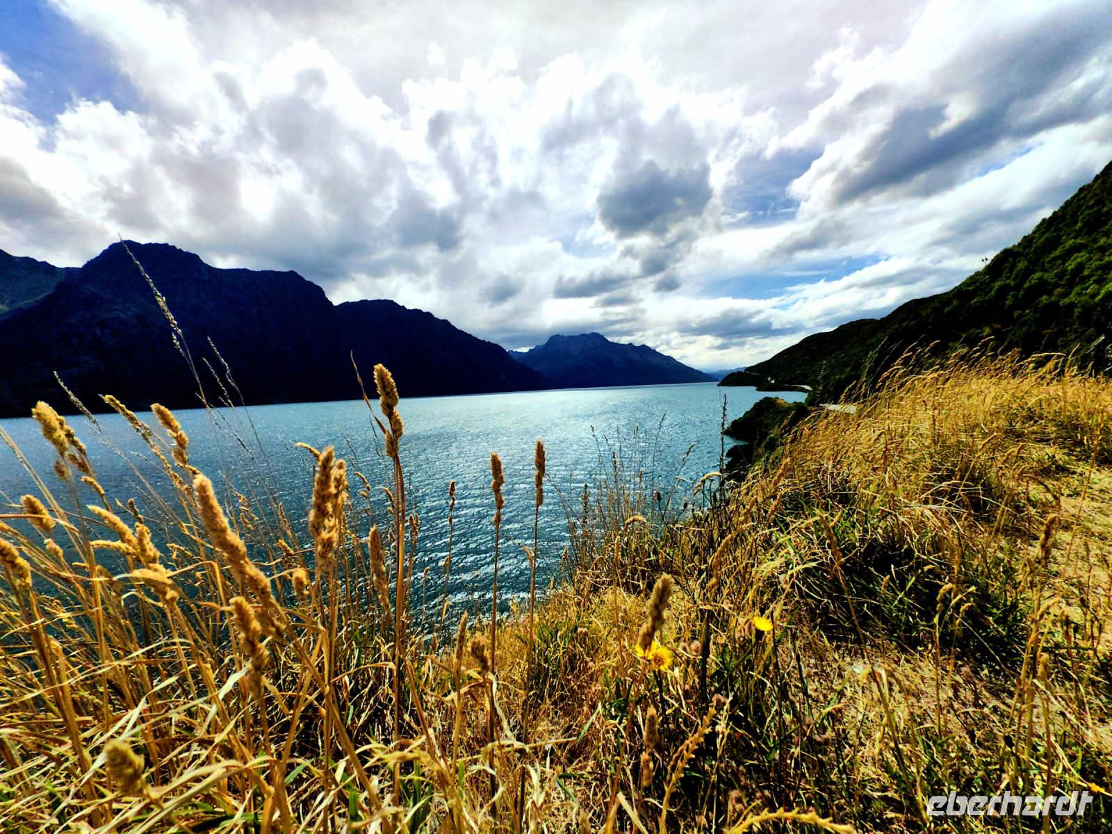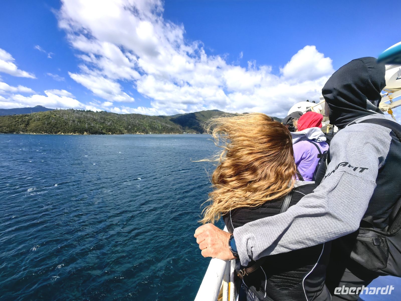 Alec fährt uns ans Terminal der großen Fähre, die die Nord- mit der Südinsel, verbindet und wir müssen Abschied von ihm und dem faszinierenden Nordteil Neuseelands nehmen. Er winkt uns ein letztes Mal zu und schon geht es aufs Schiff. Wir durchqueren die Tasmanische See und fahren danach durch die zerklüftete Flußtallandschaft des Marlborouh Sound in Richtung Picton. Die gesamte Passage dauert mehr als drei Stunden und wer aufs Oberdeck möchte, muß wind- und wetterfest sein. Die Landschaft ist atemberaubend und der Wettergott ist uns ebenfalls hold.