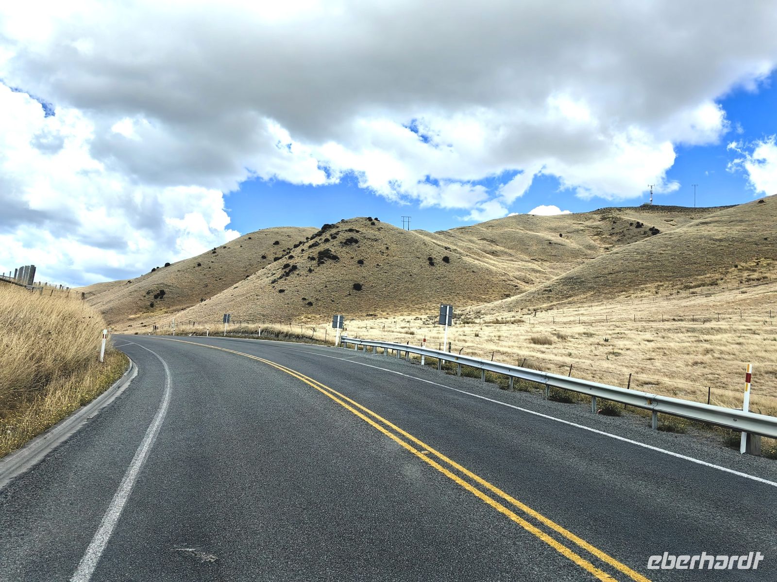 Als wir den Tongariro Nationalpark verlassen, haben wir gutes Wetter und können nochmals schöne Fotos vom Schicksalsberg aus dem Herr der Ringe Film (Mount Ngaruhoe) und dem schneebedeckten Mount Ruapehu machen. Als wir weiter fahren, verändert sich die Landschaft, wir durchqueren eine trockene Ebene, die vor allem von Büschen und Sträuchern bewachsen ist, ein wenig wie eine karge Steppe.