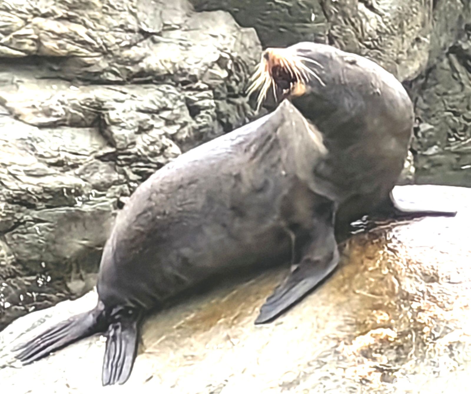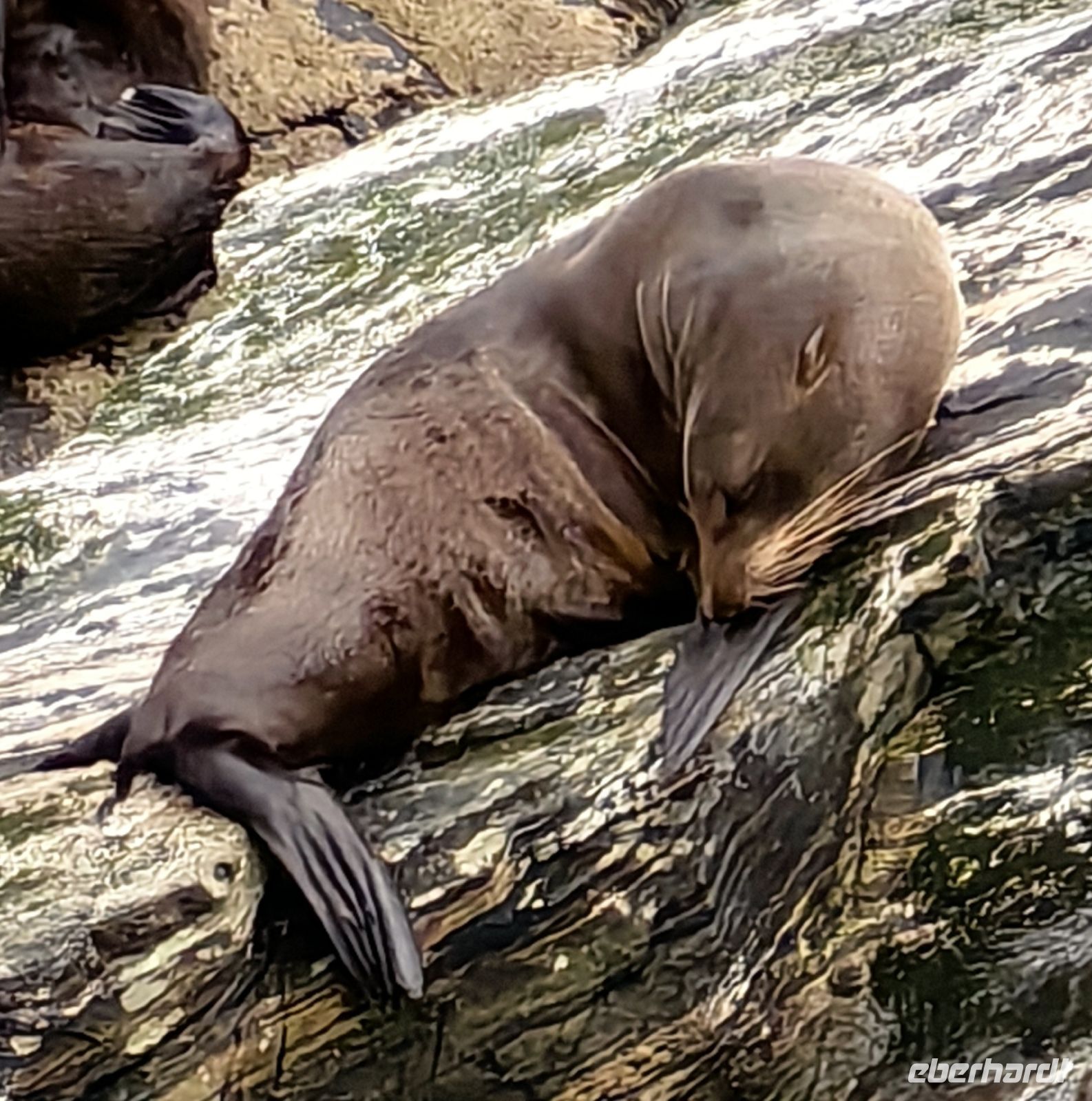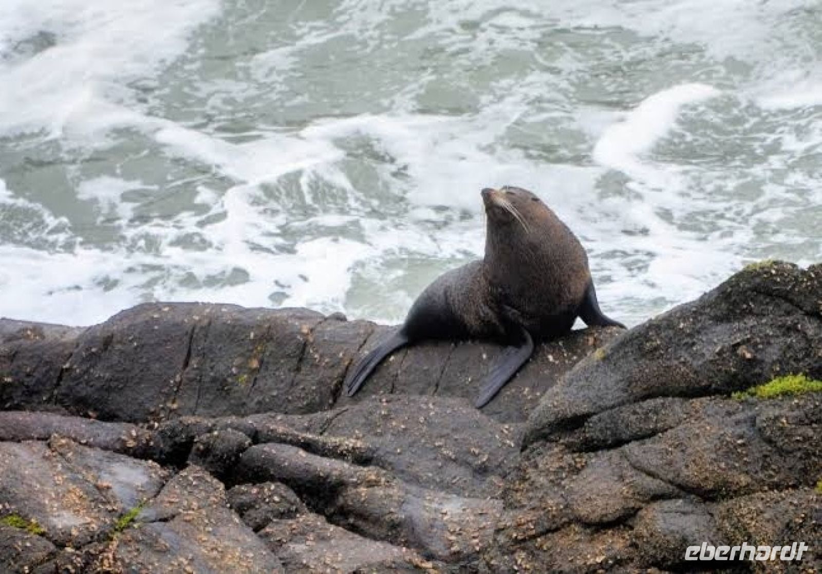 Früh am Morgen treffen wir uns alle zum Frühstück an Bord und wenig später lichtet der Kapitän die Anker und fährt mit uns an den Wasserfällen Lady Bowen und Stirling vorbei hinaus auf die Tasmanische See. Wir müssen uns gut festhalten, die Wellen sind bis zu zwei Meter hoch und die Strömungen wild. Aber wir halten das aus, da gleich neben dem Schiff zwei Delfine schwimmen und auf den nahen Felsen die Robben liegen. So etwas dürfen wir uns nicht entgehen lassen, auch wenn wir naß werden. Es ist wirklich ein ganz einmaliges Erlebnis, selbst einige Einheimische sind mit an Bord und geraten ins Schwärmen.
