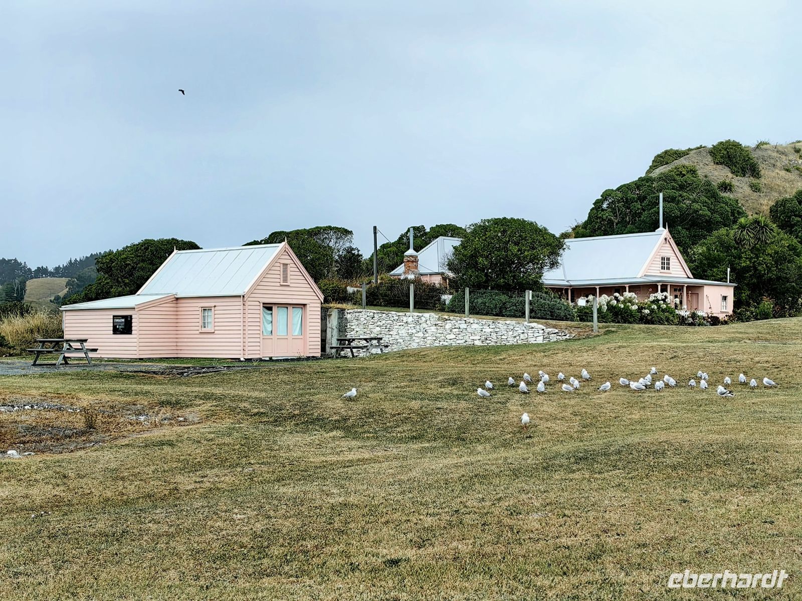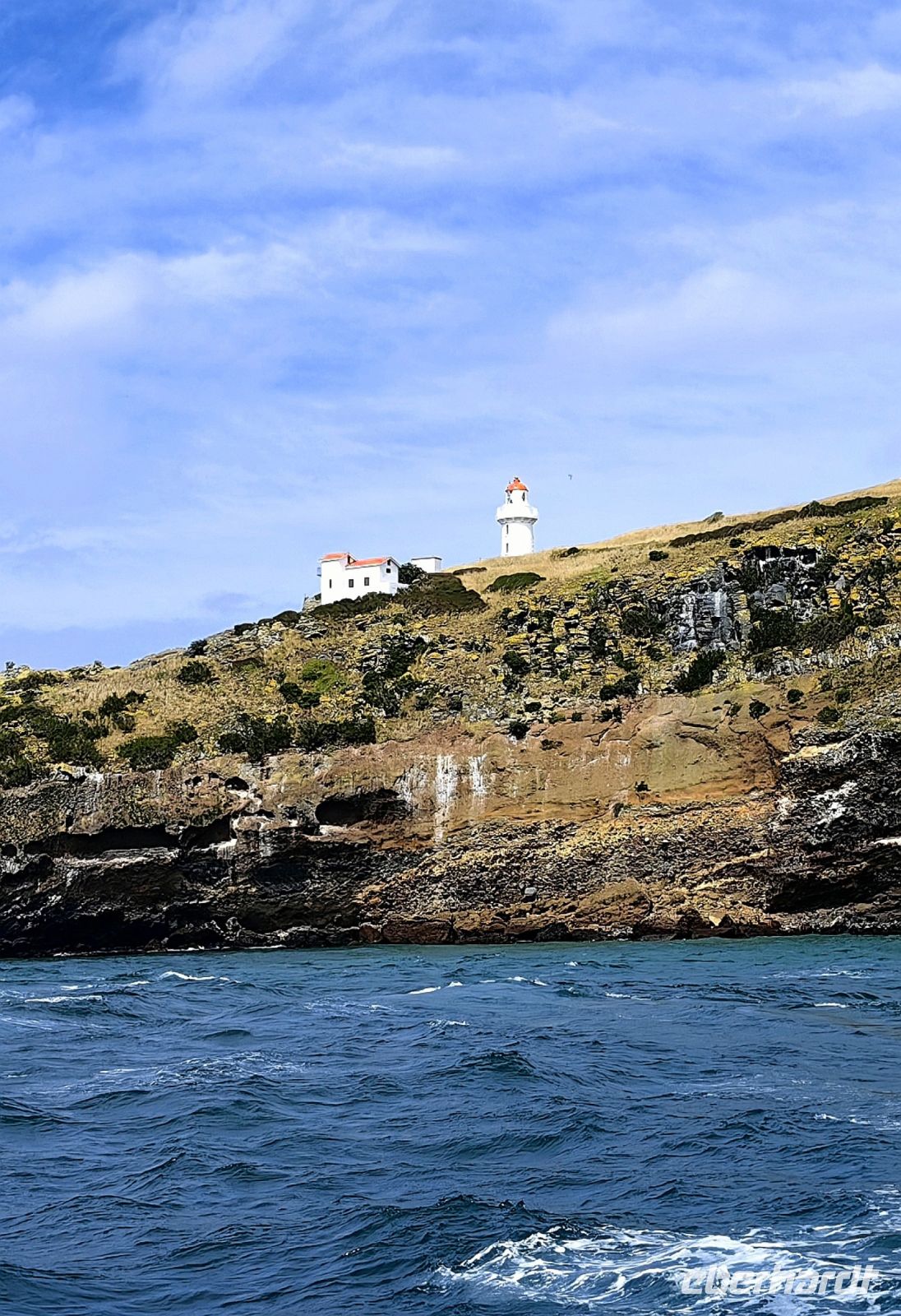 Nun erwartet uns ein kleines Schiff unweit des Wellers Rock, welches uns zur Otago Halbinsel bringen wird, die für ihre außergewöhnliche Vogelwelt bekannt ist. Gerade losgefahren, schaukeln wir bereits am ersten Seelöwen vorbei, der vor einer Hauseinfahrt quer auf dem Sand liegt. Am Leuchtturm liegen auf den Felsen unzählige Robben und über ihnen kreisen die majestätischen Albatrosse, deren Flügelspanne bis zu drei Meter betragen kann. Obwohl das Boot mächtig auf den Wellen schwankt, halten wir wacker unsere Ferngläser in den Himmel und sehen diesen riesigen Flugkünstlern zu. Hier am Taiaroa Head gibt es die weltweit einzige Brutkolonie der Königsalbatrosse auf dem Festland. Der erste hier geborene Jungvogel lernte 1938 das Fliegen. Mittlerweile hat sich die Kolonie fest etabliert und etwa 140 Vögel kommen regelmäßig her, einer davon schwimmt genau neben unserem Boot her und beäugt uns neugierig. Was für ein Erlebnis!
