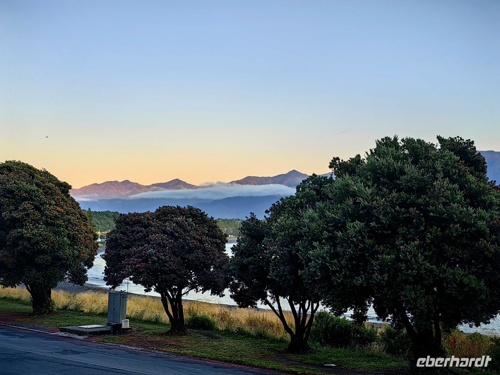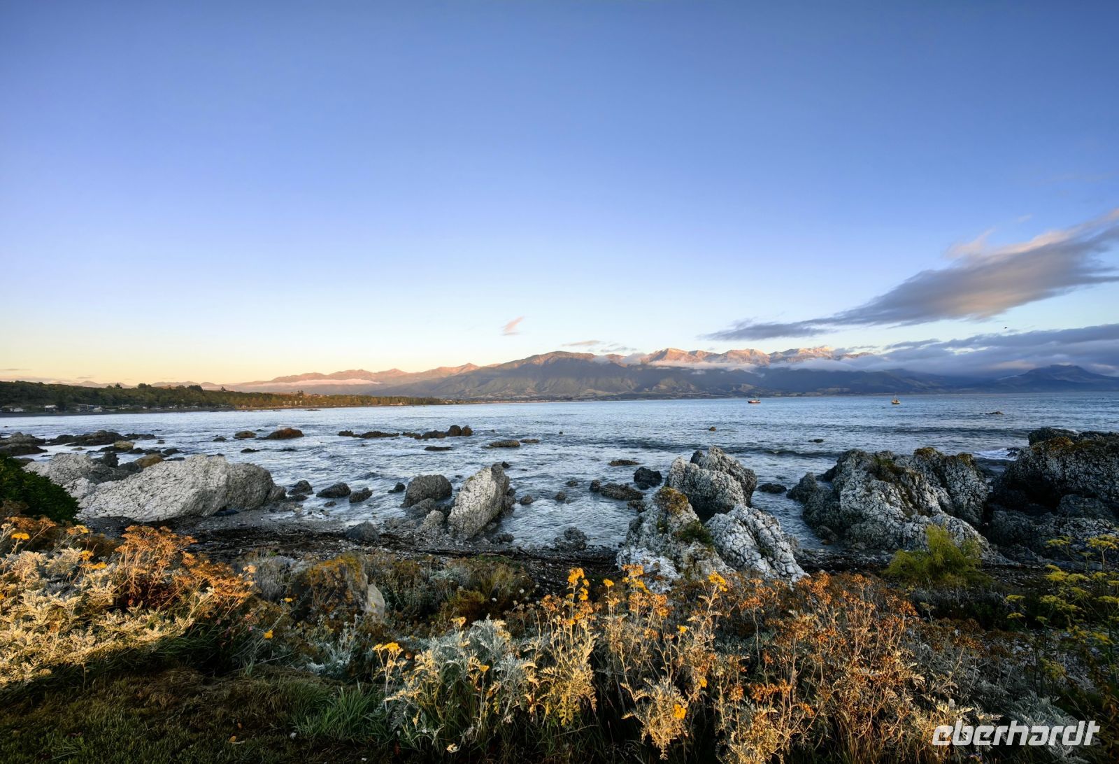 Nachdem es die ganze Nacht hindurch geregnet hat, liegt auf den Bergen, die Kaikoura umgeben, Schnee und es hat sich merklich abgekühlt. Uns wird erneut klar, wie entgegengesetzt die Bedingungen hier am anderen Ende der Welt sind. Richtet man seine Häuser und Balkone in Europa gern nach Süden aus, muß man es hier in Neuseeland nach Nordost oder Nordwest tun. Fahren wir in den Urlaub in den Süden, verbinden wir das in Gedanken mit Wärme, Sonne und üppigen Landschaften. Fährt der Neuseeländer von Nord nach Süd, muß er sich warme Sachen einpacken und die Vegetation wird merklich karger.