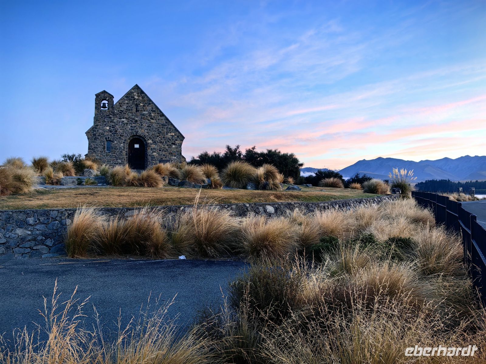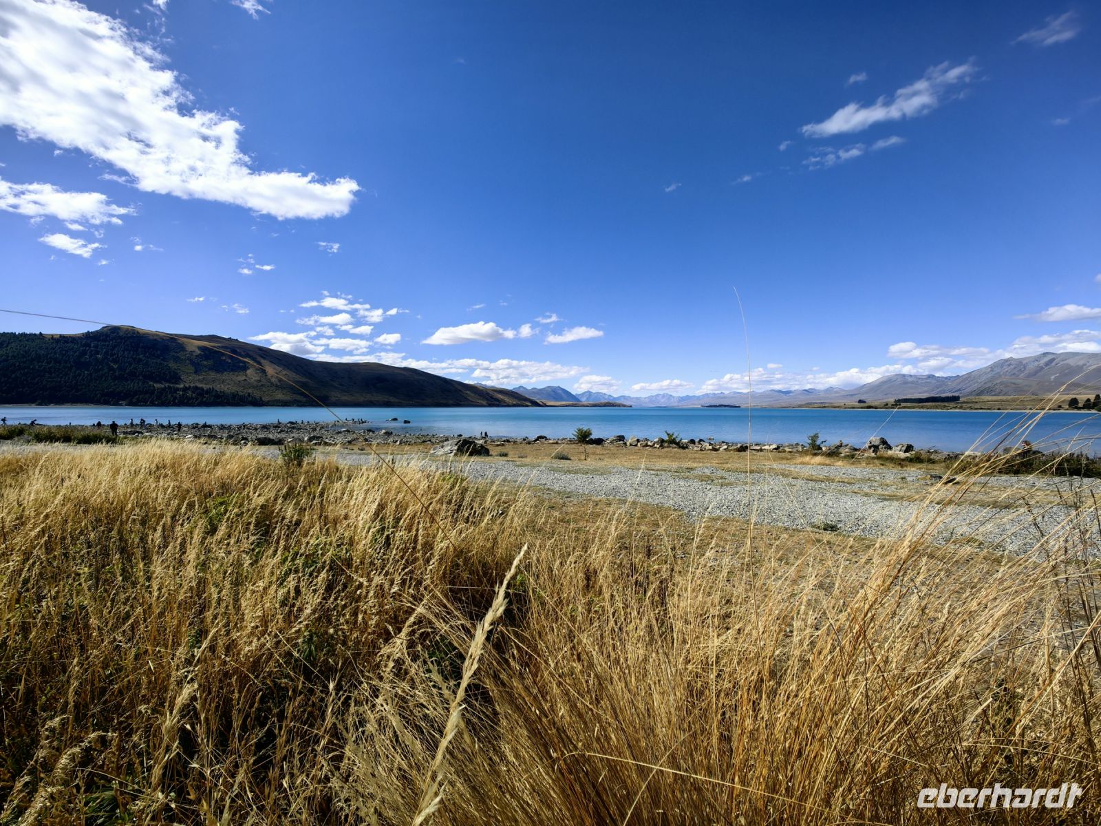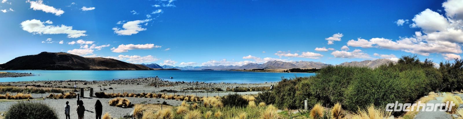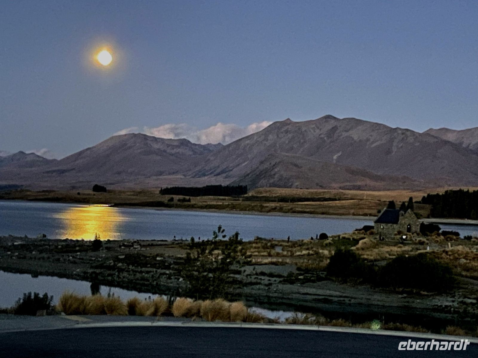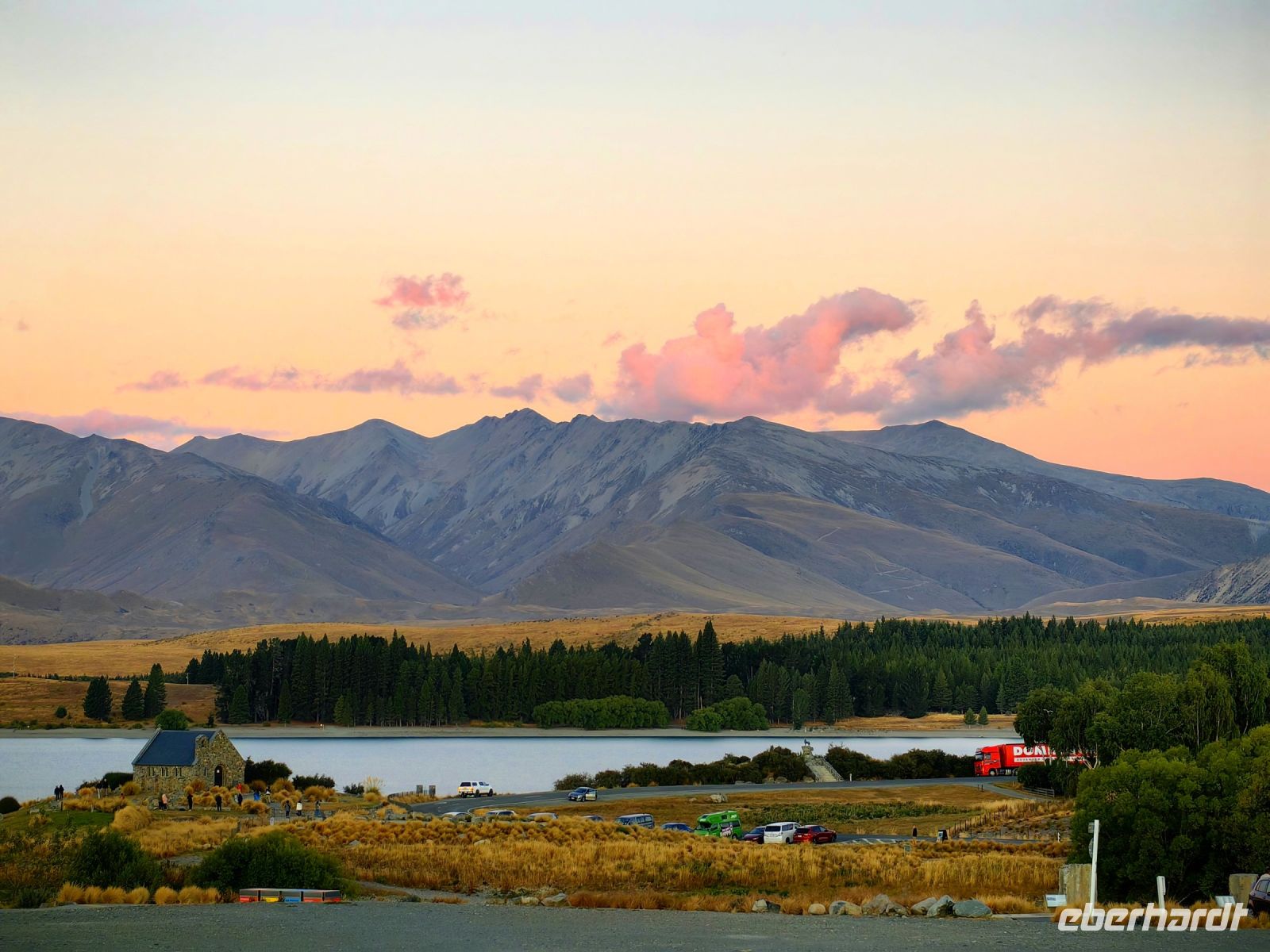 Wir genießen die Mittagspause hier und fahren danach weiter zum Lake Tekapo. Dieser Ort im Mackenzie District liegt direkt an einem türkisblauen Gletschersee, der wiederum von bis zu 1.900 Meter hohen Bergen umgeben ist. Mit 95 Quadratkilometern ist er der größte See der ganzen Südinsel. An seinem Ufer steht die kleine Kapelle des guten Schafhirten, die sich so malerisch in die Landschaft einfügt, daß sie die meistfotografierte Kirche Neuseelands ist. Vor dieser tollen Kulisse essen wir zu Abend und lassen den Tag gemütlich ausklingen.
