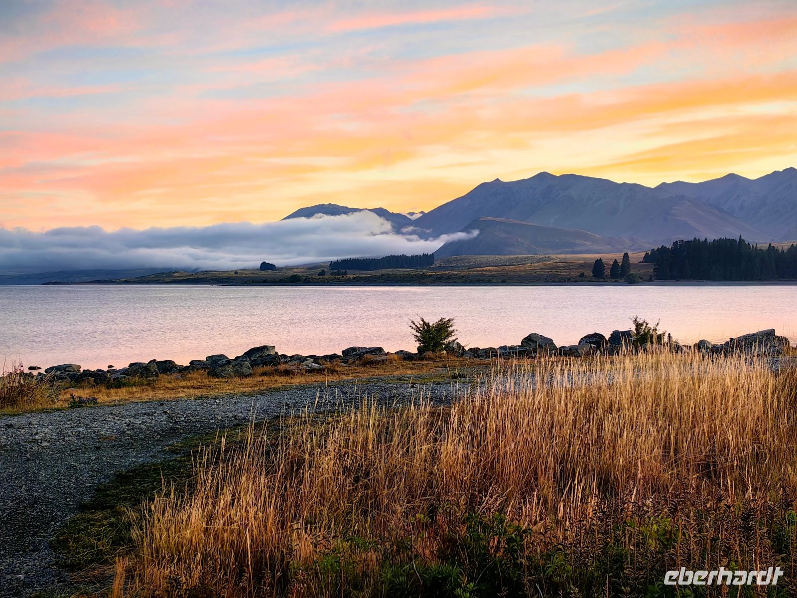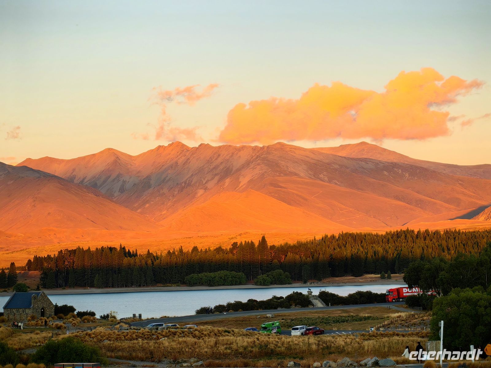 Der Sternenhimmel und der fast volle Mond in der Nacht über dem Lake Tekapo waren bereits spektakulär, der Sonnenaufgang allerdings, der alles in rosarotes Morgenlicht taucht, ist nochmal eine Steigerung. Die Szenerie sieht regelrecht unwirklich aus, so schön ist sie. Allerdings ist die Temperatur auf sechs Grad gesunken, und das im Hochsommer!