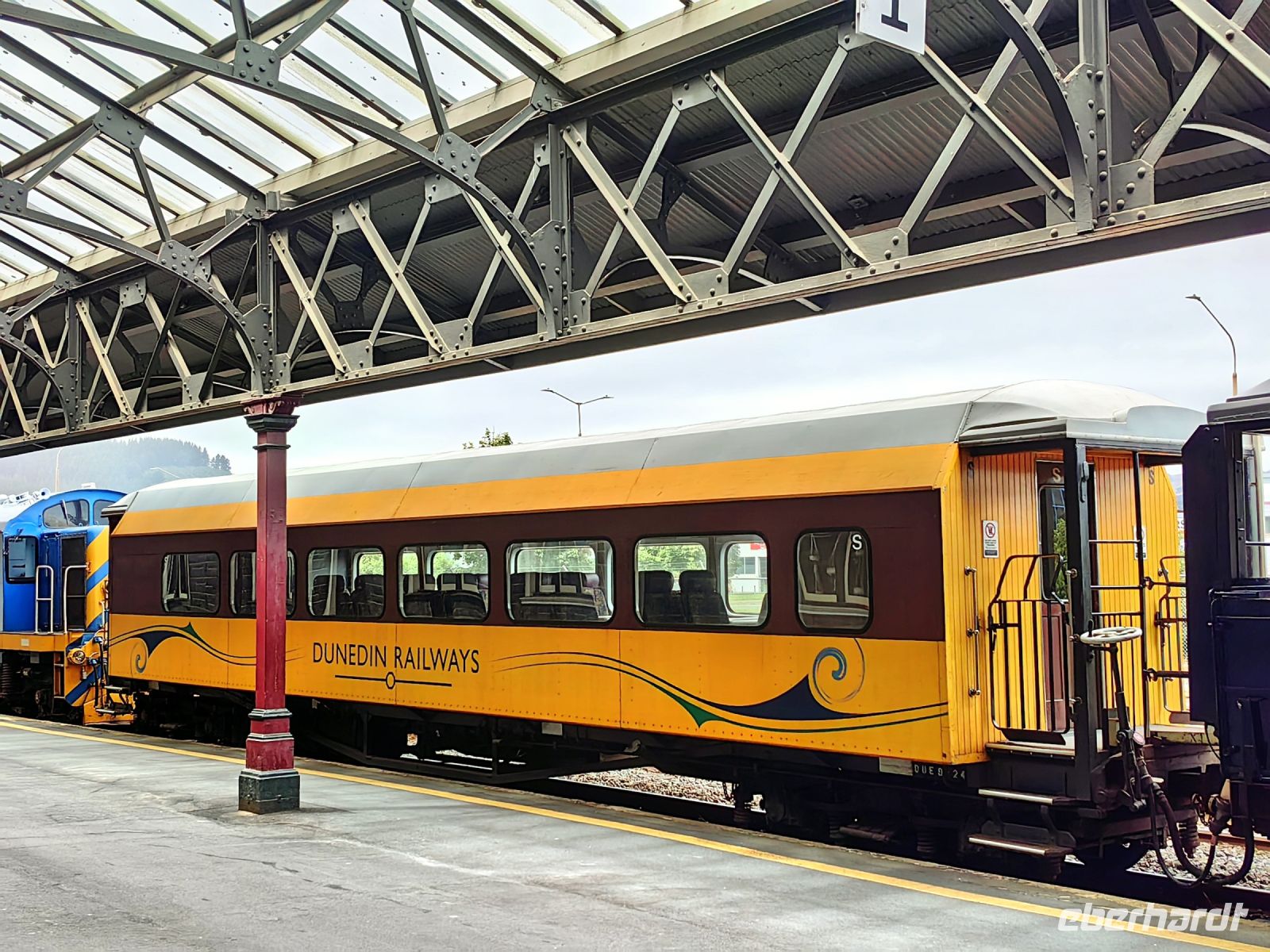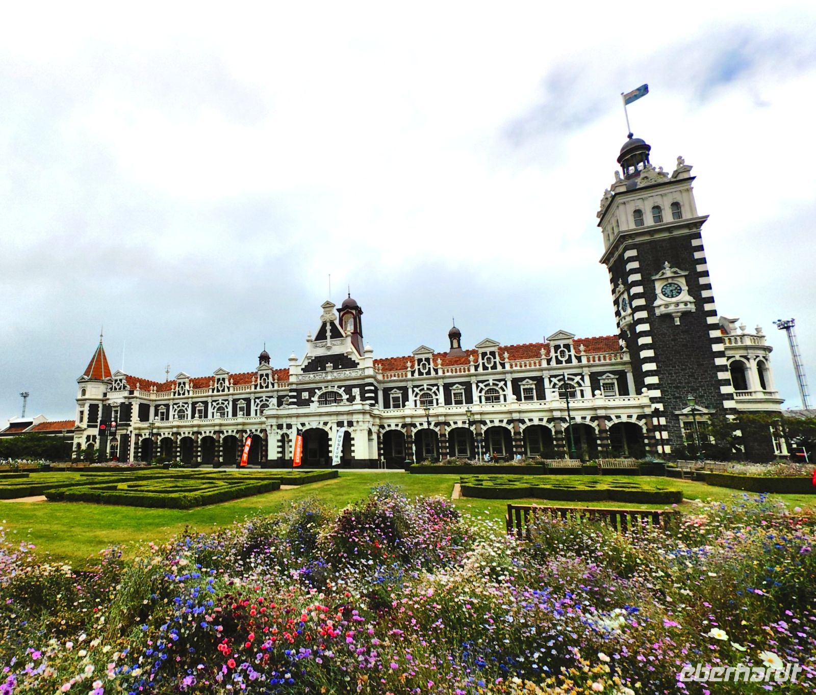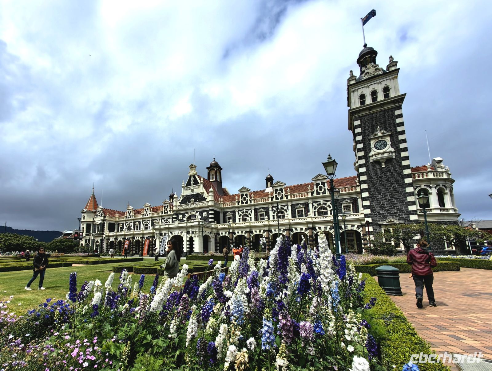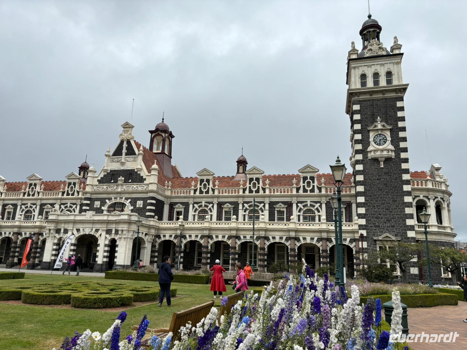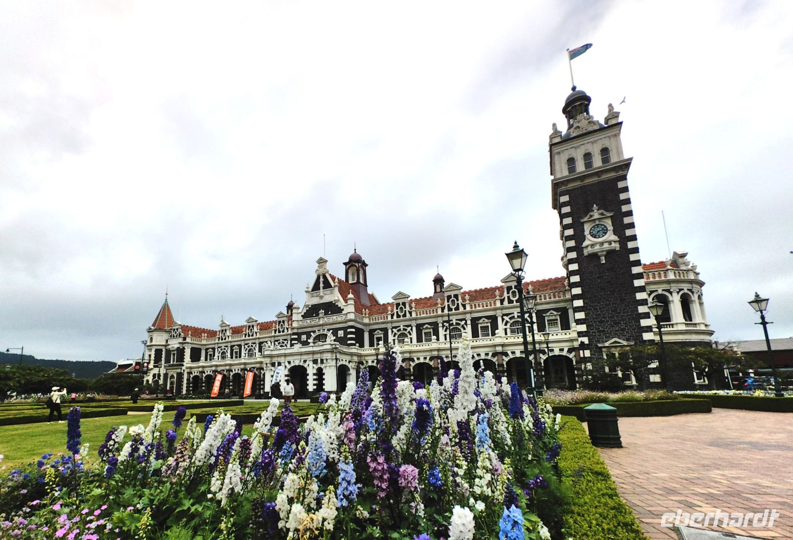 Wir finden diese rissigen "Bälle" einfach nur faszinierend und machen in allen Positionen Fotos von ihnen, bevor wir uns auf den Weg nach Dunedin machen. Nachdem wir uns etwas Leckeres zum Mittag gesucht haben, spazieren wir die Straßen mit den prachtvollen Bauwerken entlang. Besonders schön anzusehen ist der 1906 eröffnete Bahnhof im flämischen Renaissancestil. Der Boden der Fahrkartenhalle besteht aus sage und schreibe 750.000 Porzellanfliesen des Herstellers Royal Doulton. Der Bahnsteig ist einen Kilometer lang und damit Neuseelands längster. Der einzige Zug, der hier noch verkehrt, steht gerade auf den Gleisen und ist für ausländische Besucher gedacht. Die Waggons sehen bunt und flippig aus.