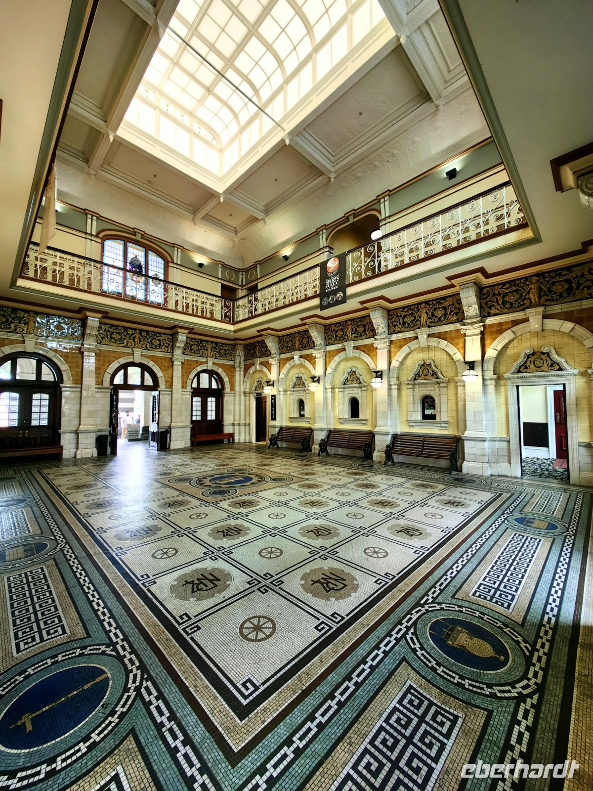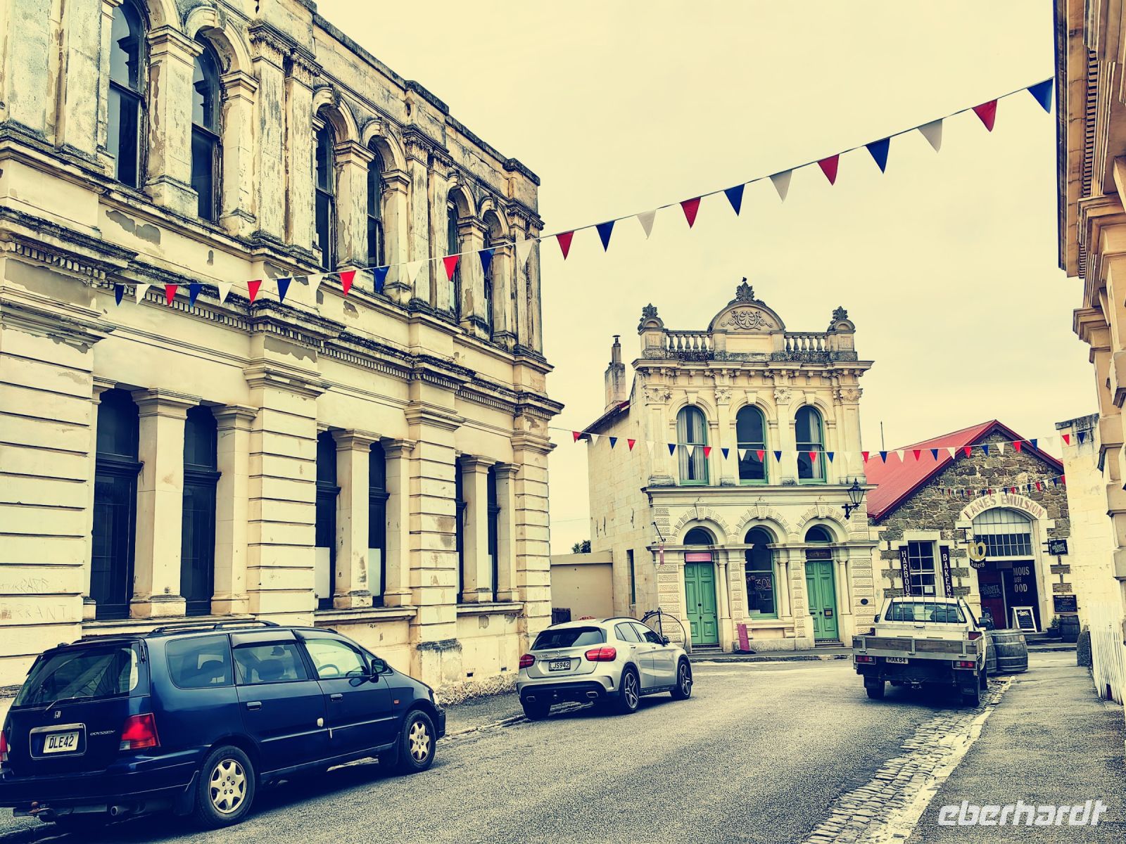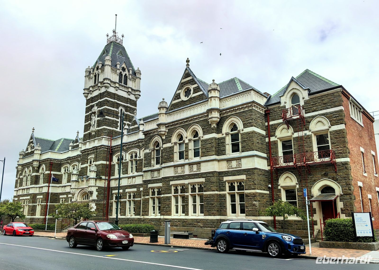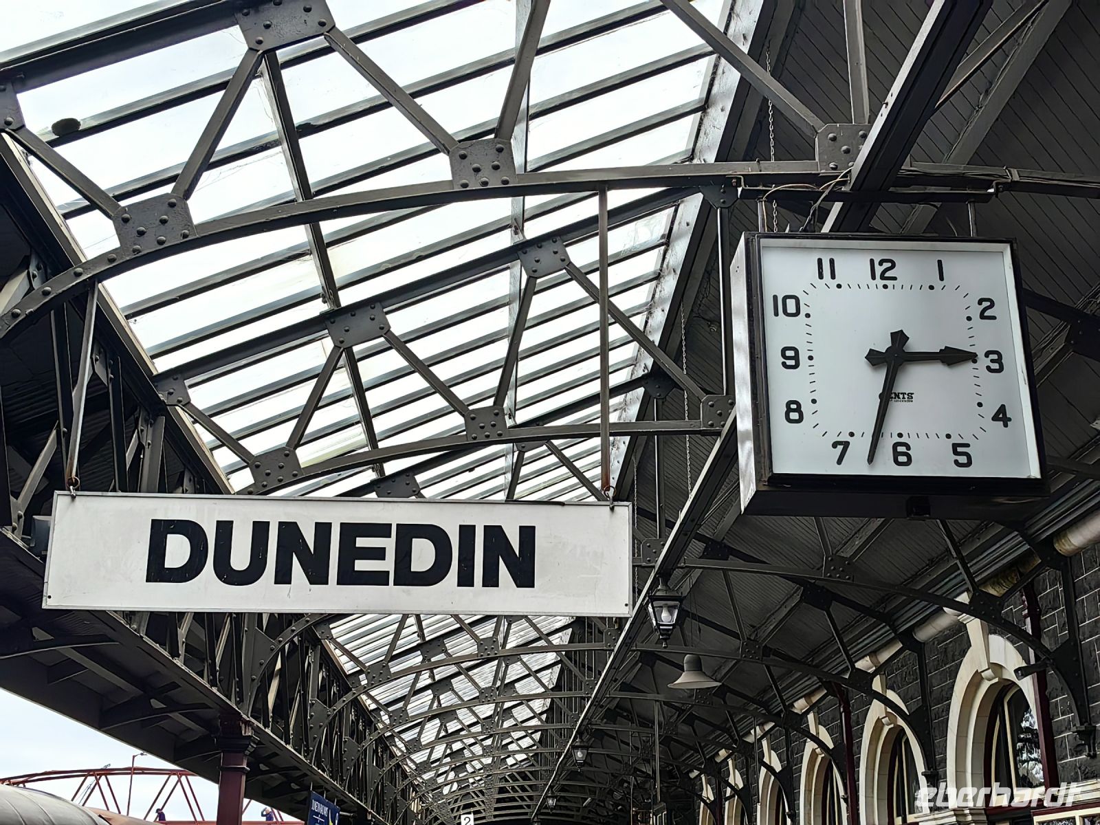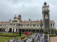 Wir finden diese rissigen "Bälle" einfach nur faszinierend und machen in allen Positionen Fotos von ihnen, bevor wir uns auf den Weg nach Dunedin machen. Nachdem wir uns etwas Leckeres zum Mittag gesucht haben, spazieren wir die Straßen mit den prachtvollen Bauwerken entlang. Besonders schön anzusehen ist der 1906 eröffnete Bahnhof im flämischen Renaissancestil. Der Boden der Fahrkartenhalle besteht aus sage und schreibe 750.000 Porzellanfliesen des Herstellers Royal Doulton. Der Bahnsteig ist einen Kilometer lang und damit Neuseelands längster. Der einzige Zug, der hier noch verkehrt, steht gerade auf den Gleisen und ist für ausländische Besucher gedacht. Die Waggons sehen bunt und flippig aus.