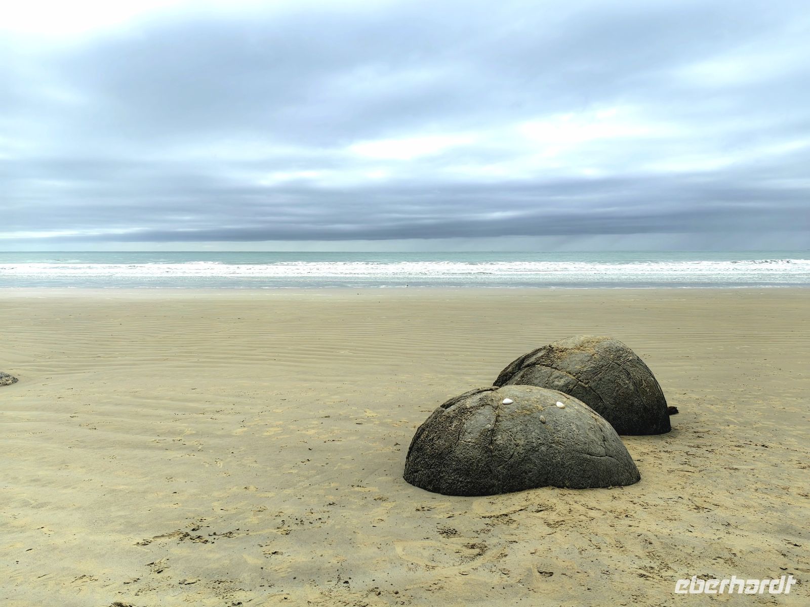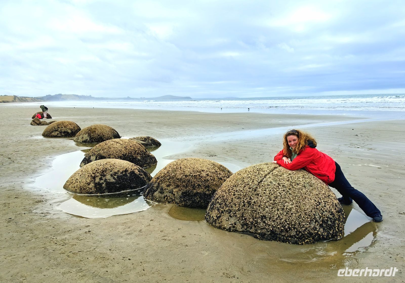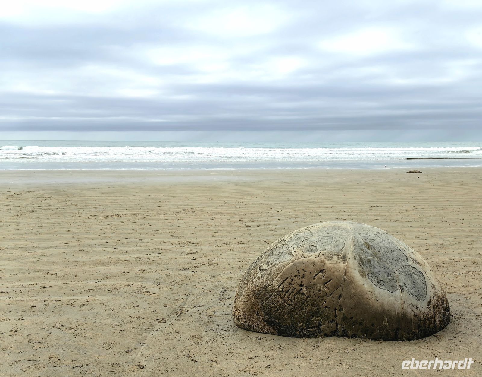 Am Moeraki Boulders Beach spazieren wir am berühmten Strand mit seinen mysteriösen kugelförmigen Felsen entlang. Jede dieser Kugeln wiegt mehrere Tonnen und ist bis zu zwei Meter hoch. Diese Steine sollen vor etwa 65 Millionen Jahren entstandene Calcit-Konkretionen sein. Die Maori berichten, daß sie vom großen Reisekanu Araiteuru an Land gespülte Flaschenkürbisse sind, als das Kanu vor hunderten von Jahren vor Neuseeland Schiffbruch erlitten hat.