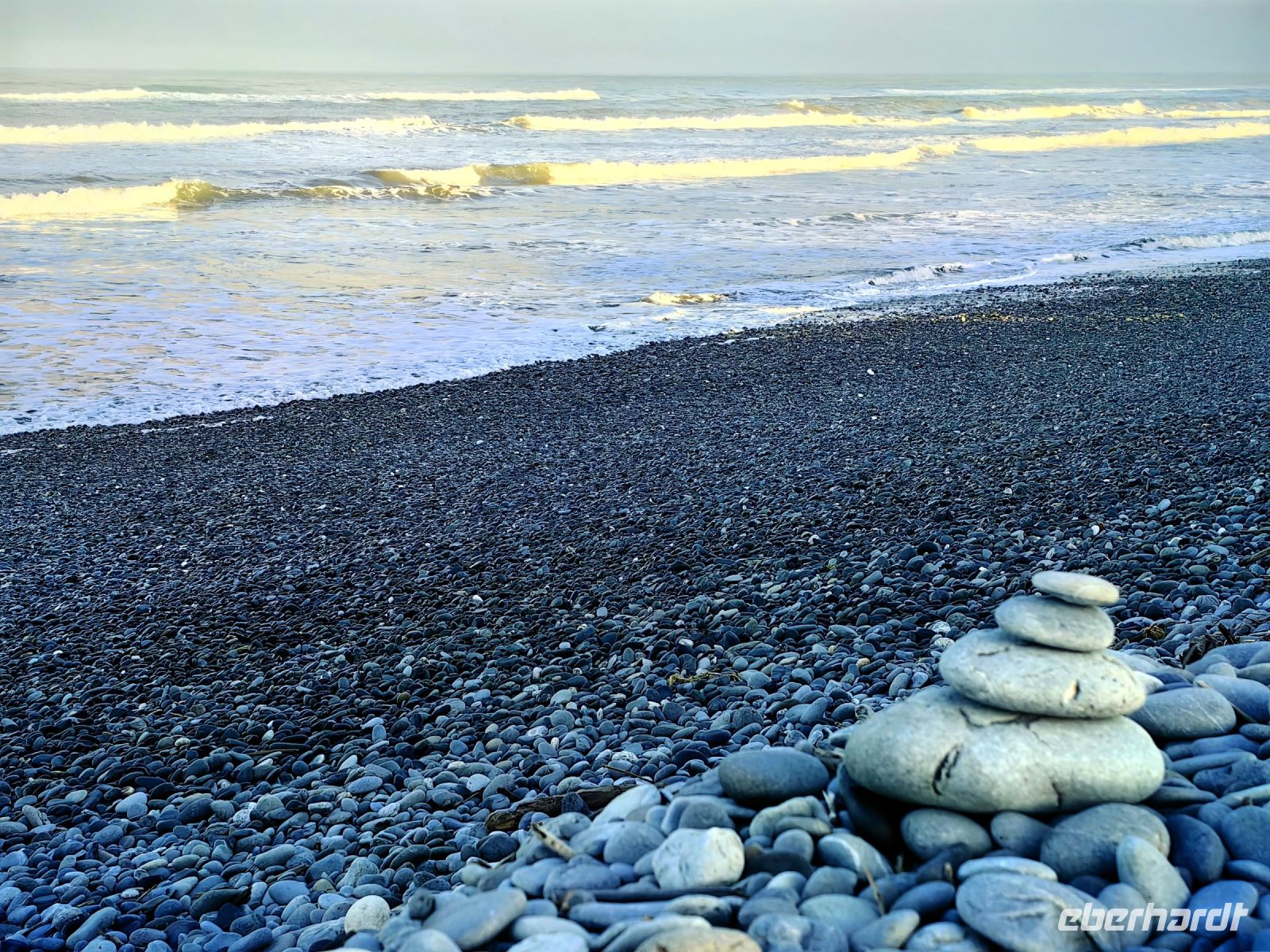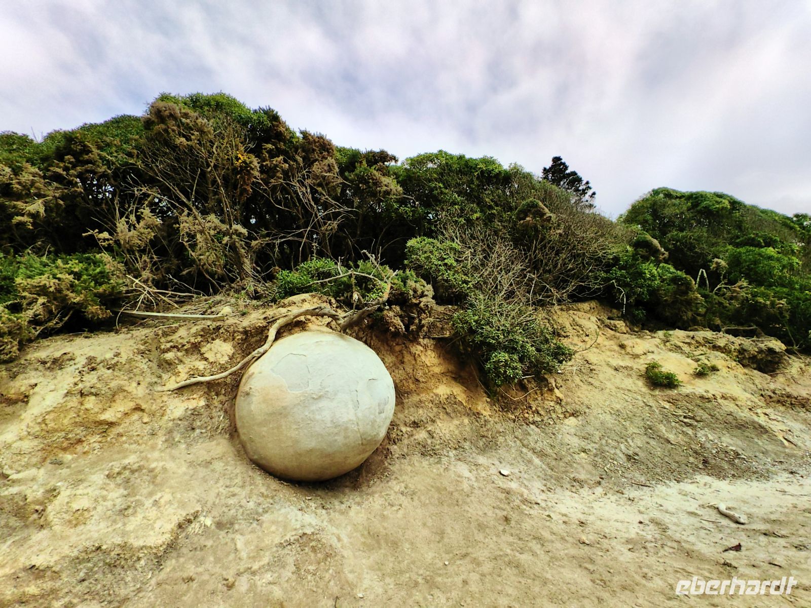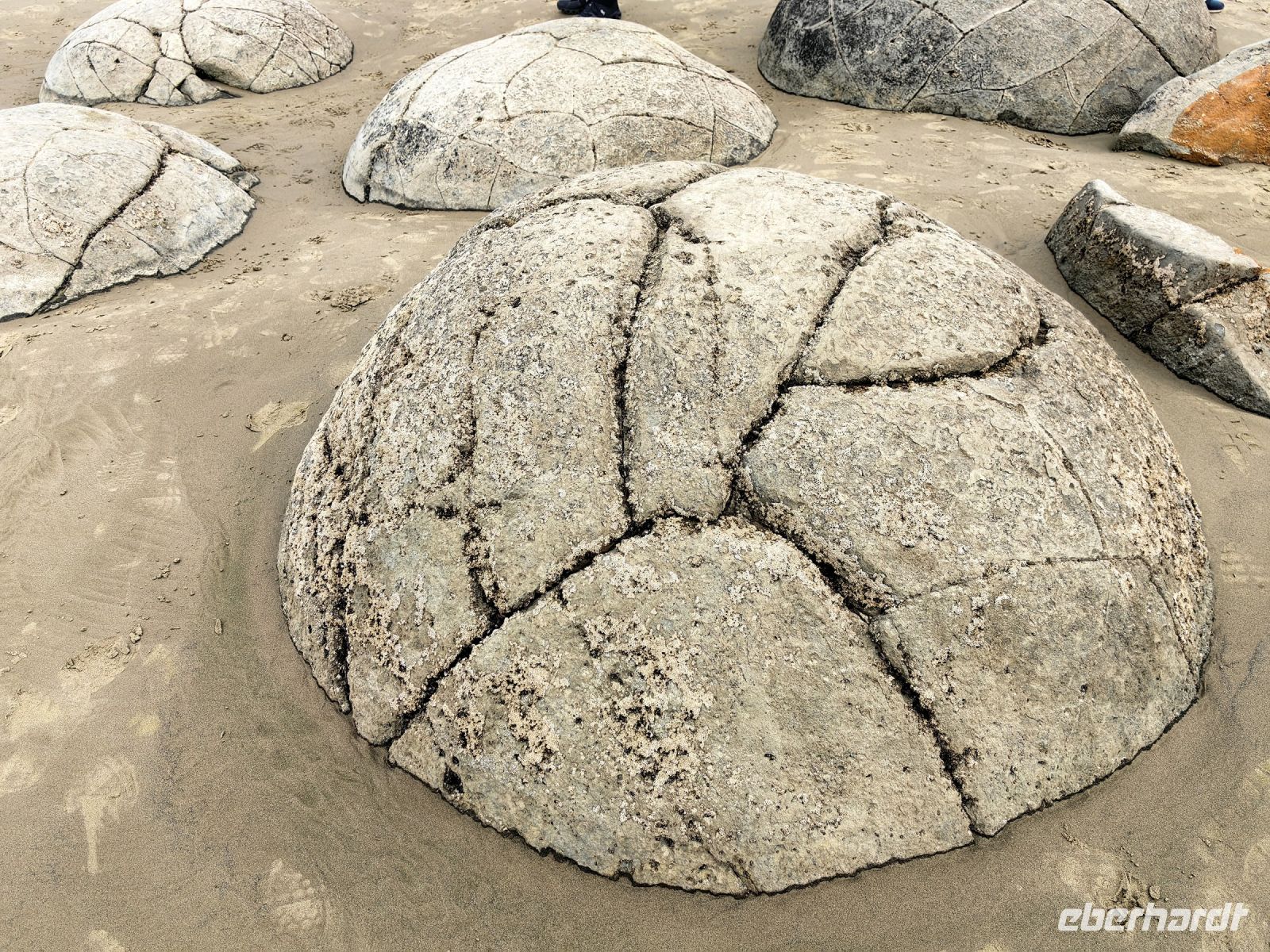 Am Moeraki Boulders Beach spazieren wir am berühmten Strand mit seinen mysteriösen kugelförmigen Felsen entlang. Jede dieser Kugeln wiegt mehrere Tonnen und ist bis zu zwei Meter hoch. Diese Steine sollen vor etwa 65 Millionen Jahren entstandene Calcit-Konkretionen sein. Die Maori berichten, daß sie vom großen Reisekanu Araiteuru an Land gespülte Flaschenkürbisse sind, als das Kanu vor hunderten von Jahren vor Neuseeland Schiffbruch erlitten hat.