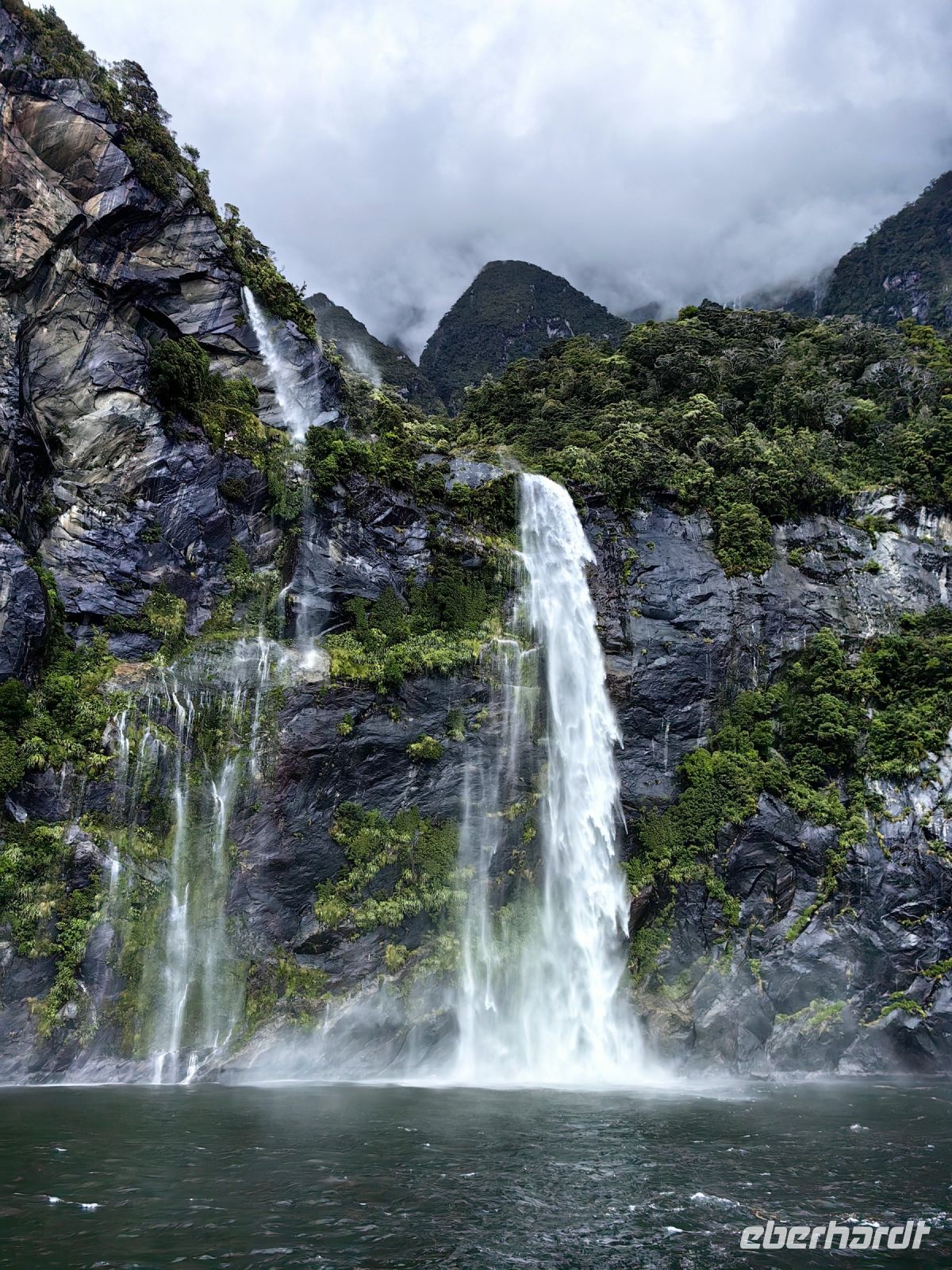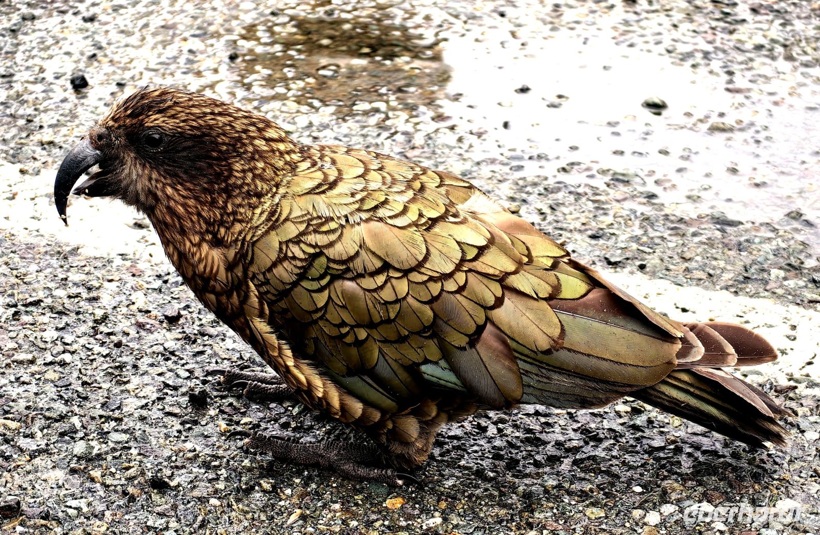 Als wir am Nachmittag den Hafen erreichen, sind wir von imposanten Felswänden umgeben, die höchste Erhebung ist der Mitre Peak oder auch Bischhofshut mit 1.292 Metern. Die Unterwasserwelt dieses Fjords ist einzigartig, Schwarzkorallen locken Taucher aus aller Welt an. Allein schon die Anfahrt über die einzige Straße, die Milford Sound Road, ist ein wirkliches Abenteuer. Sind wir die Tage zuvor durch karge Hügellandschaften gefahren, umgibt uns nun dichter Bergregenwald und hinter Te Anau, der letzten Stadt vor den Fjorden, gibt es keine weiteren bewohnten Orte mehr. Als wir an einem Parkplatz anhalten, spazieren die Keas, die neugierigen Bergpapageien, mitten zwischen Autos und Wohnmobilen herum und lassen sich durch uns überhaupt nicht stören. Sie sind auf der Suche nach Spielzeug und nicht selten sind das Isoliergummis von Autotüren. Einer schaut daher sehr interessiert zur Tür eines parkenden Wohnmobils hinein und was ein Kea erstmal interessant findet, untersucht er auch genauestens.