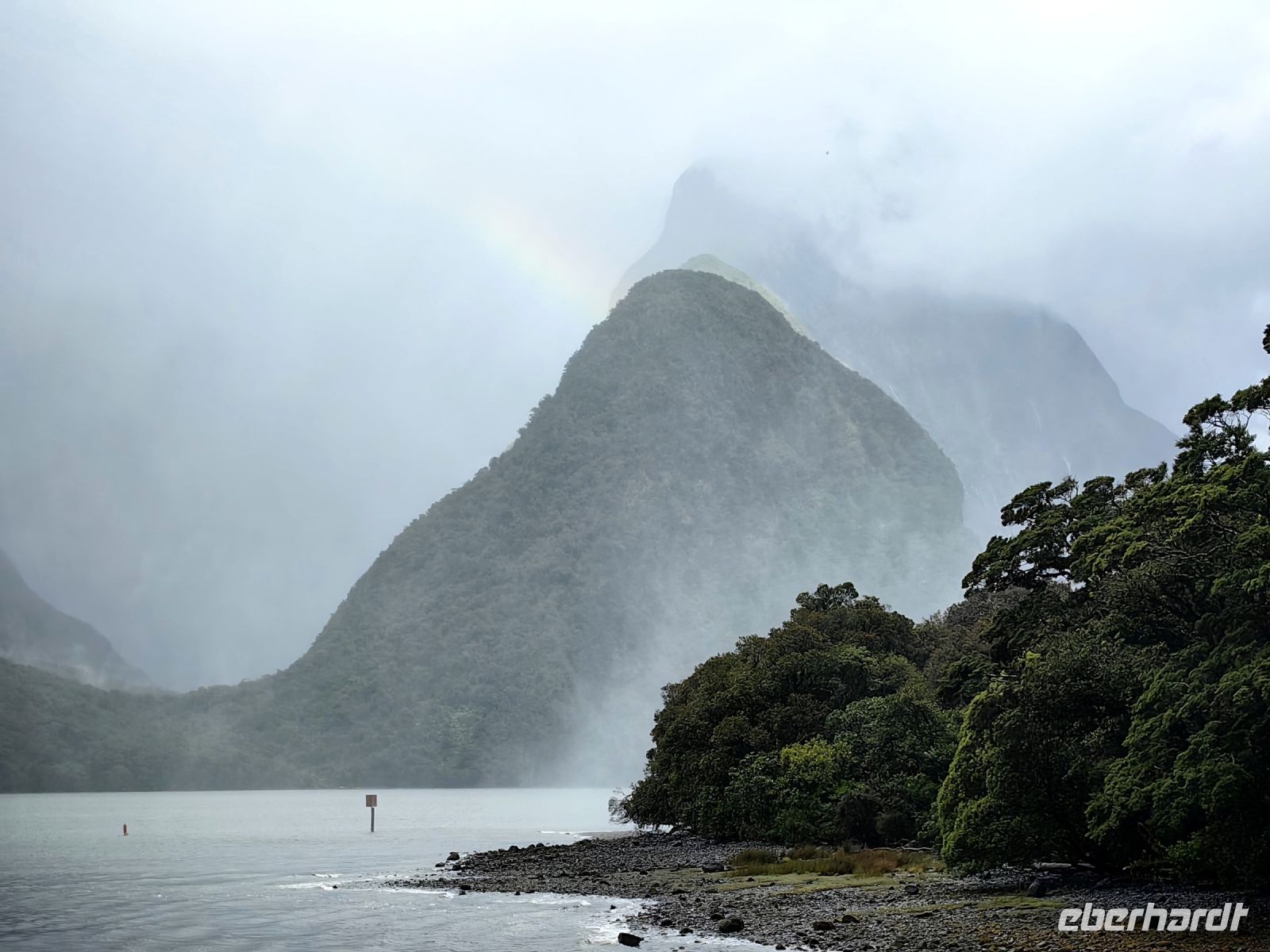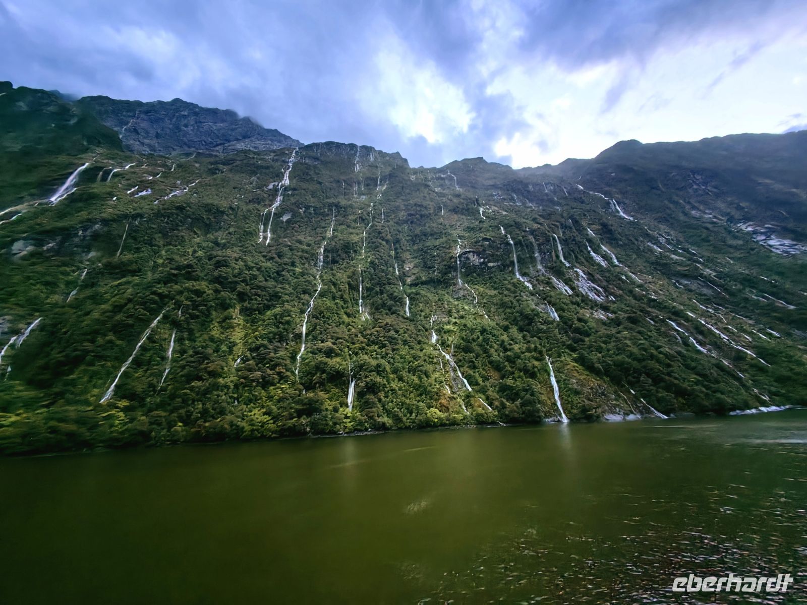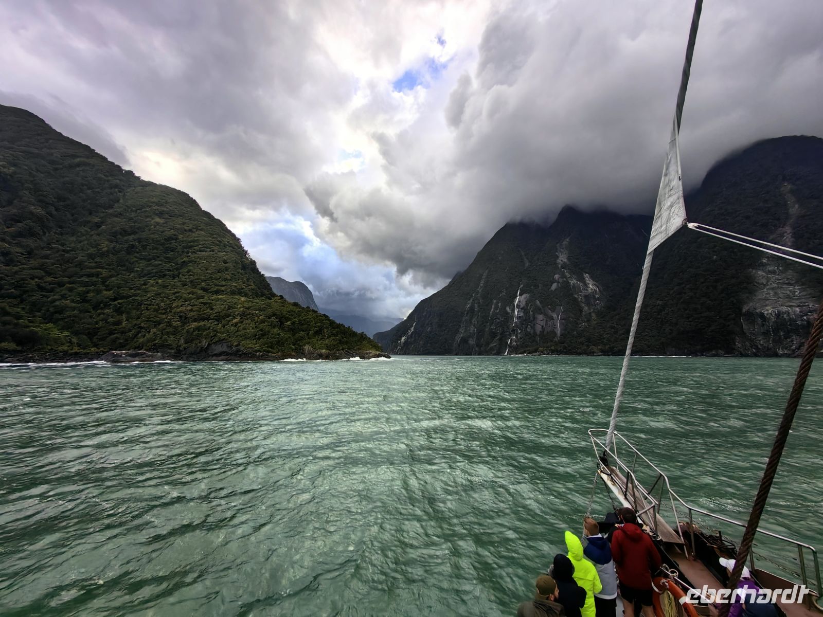Etwas weiter halten wir am Mirror Lake, einem so klaren Bergsee, daß sich alles farbenfroh in ihm spiegelt. Den Kormoranen können wir beim Brüten zusehen. Nachmittags endlich erblicken wir nach fast fünfstündiger Fahrt auf der gewundenen Regenwaldstraße den Hafen des Milford Sound uns sehen die Berge, die dicht von Wolken verhangen sind. Eine absolut mystische Szenerie. Unser Schiff liegt schon bereit und nach einer kurzen Vorstellung der Mannschaft können wir unsere kleinen gemütlichen Kabinen beziehen. Wir haben Glück, der angekündigte Starkregen bleibt aus, und einige Gäste entscheiden sich, mit den Tenderbooten im Fjord zu den Wasserfällen hinauszufahren. Drei Mutige wagen sich auf die Kajaks und paddeln in dieser spektakulären Landschaft auf glasklarem Wasser.