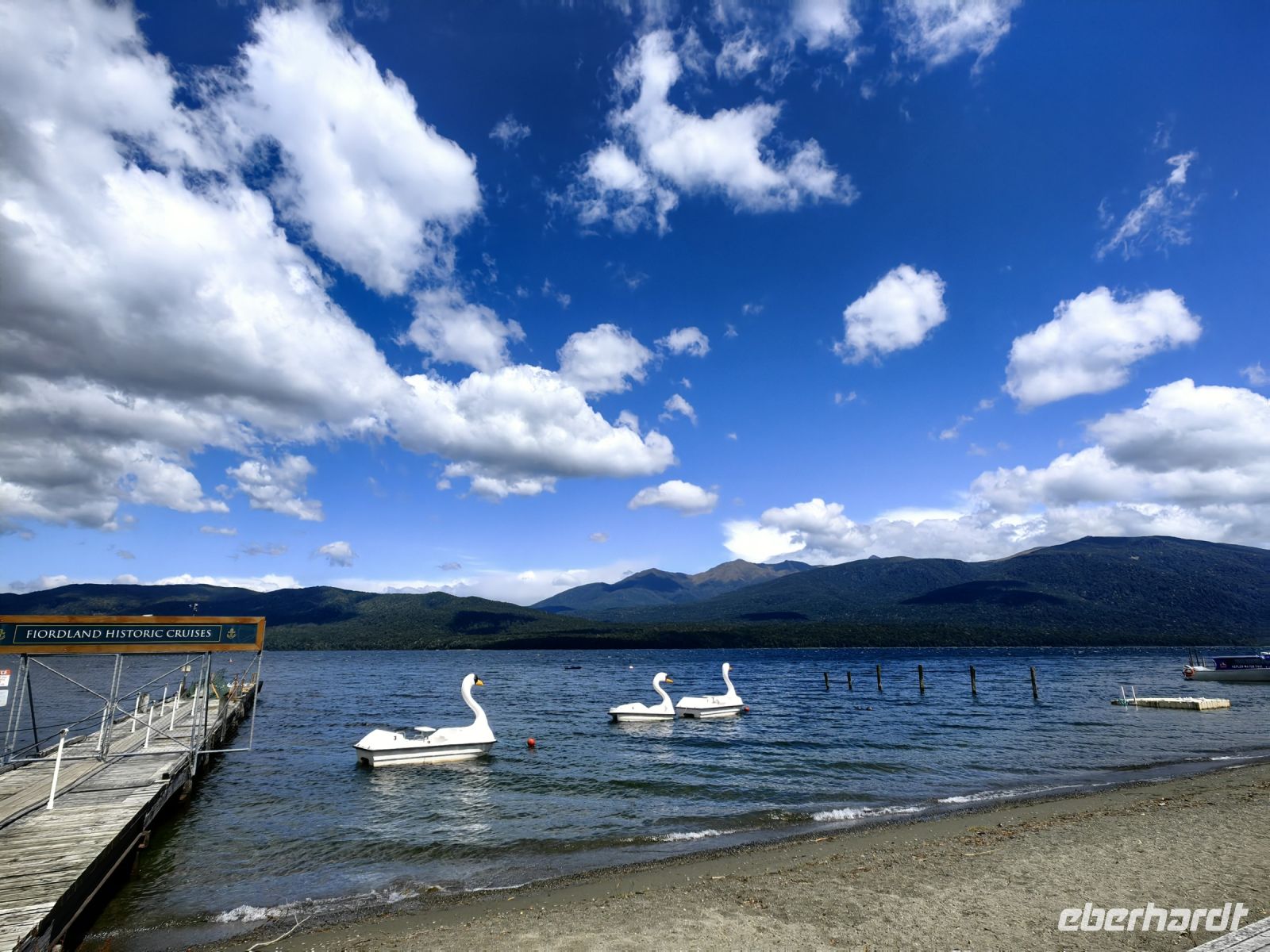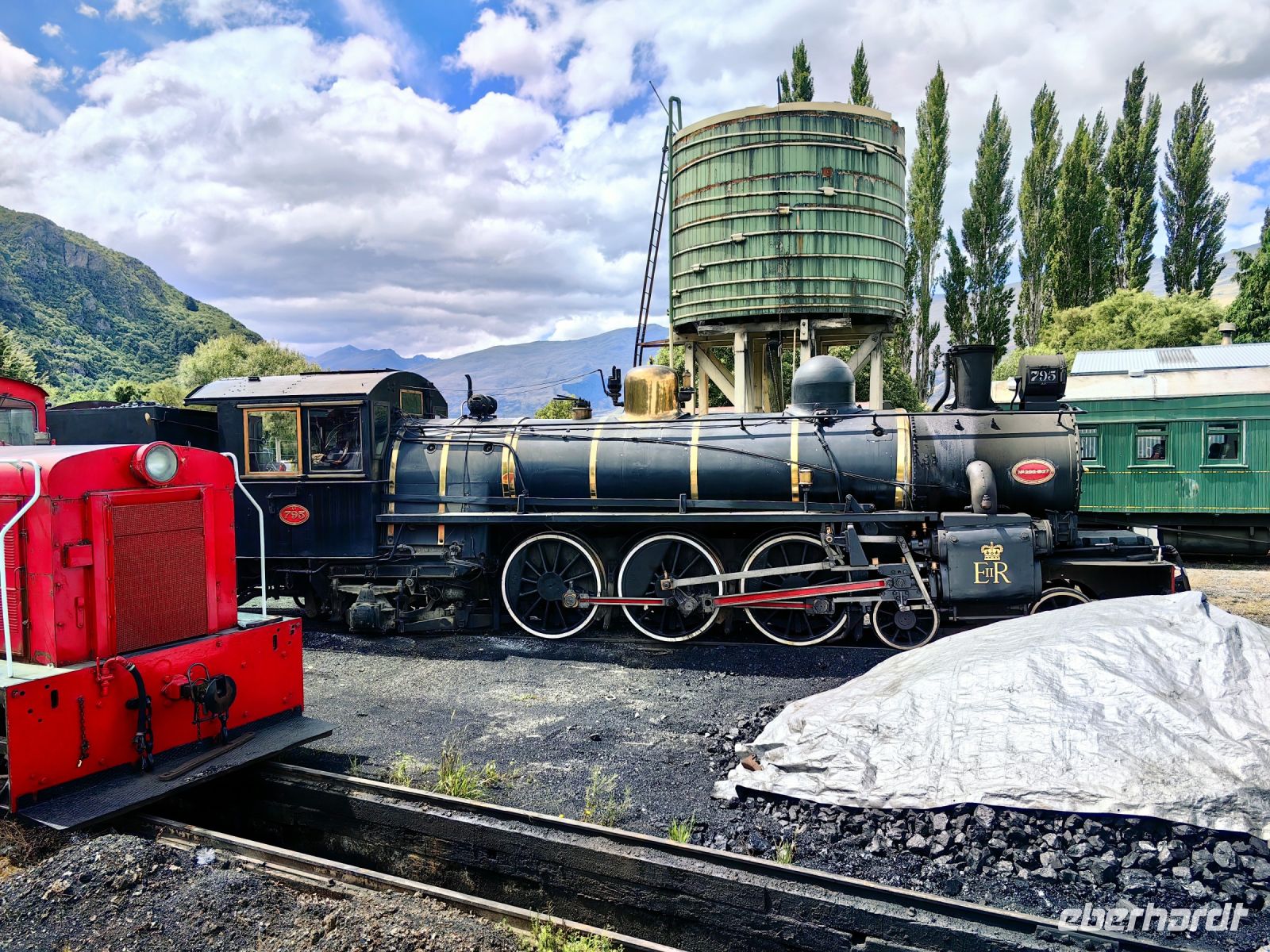 Unsere Mittagspause machen wir erneut in Te Anau und probieren die leckeren Pies, gebackene Teigtaschen mit verschiedenen Füllungen. Am See des Ortes spazieren wir die Uferpromenade entlang und genießen die Sonne, die sich nach Stunden nun endlich wieder blicken läßt. Einen weiteren Fotostop legen wir im kleinen Kingston ein, wo wir die Dampflock und die alten Wagons bestaunen, die hier für Gäste jeden Tag eine kurze Strecke von fünf Kilometern fahren.