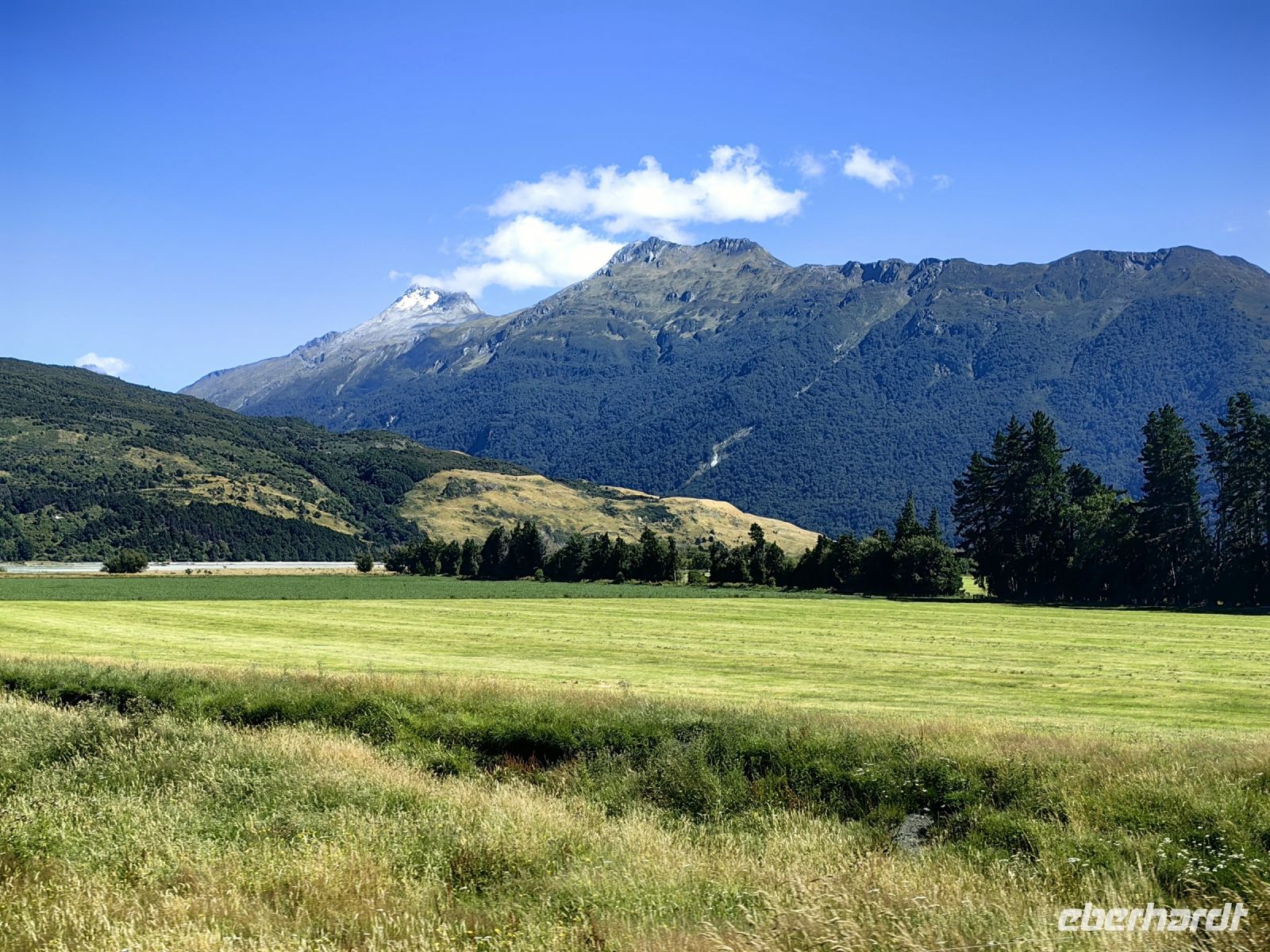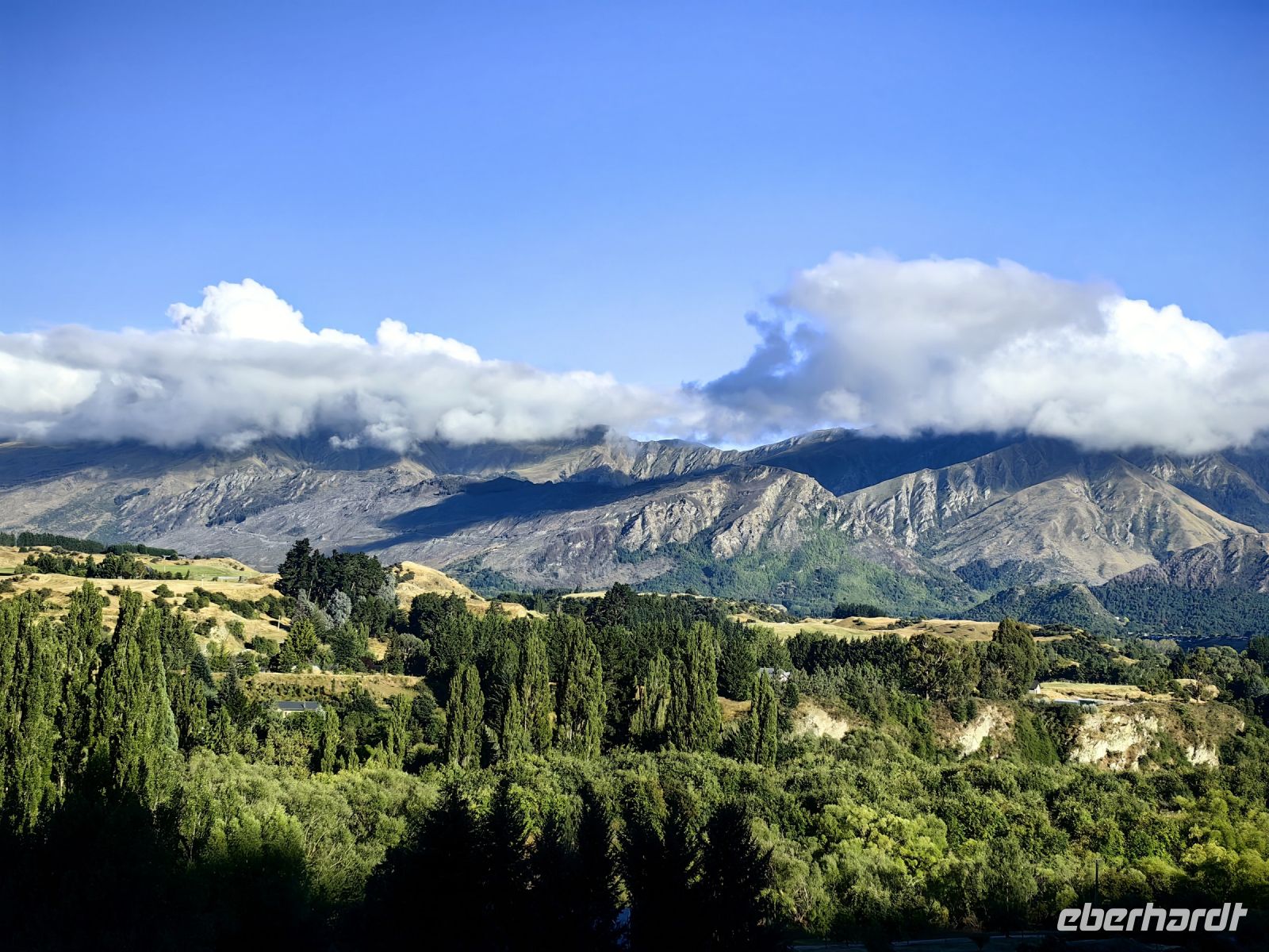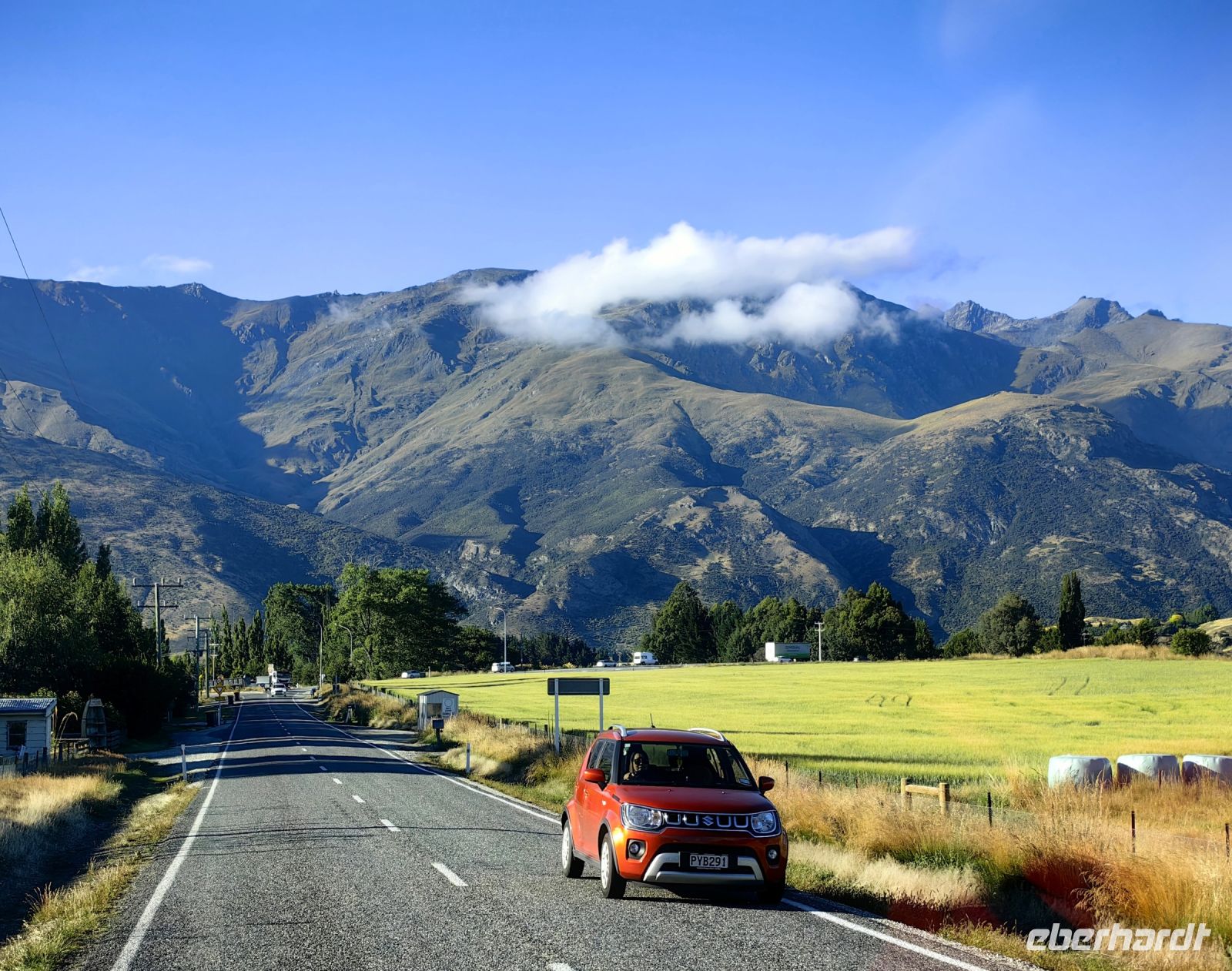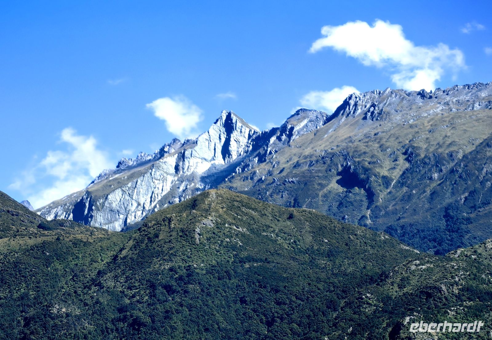 Weiter führt uns unsere spektakuläre Panoramafahrt bei Traumwetter durch die mächtige Bergwelt des Aspiring Nationalparks, lange noch können wir Queenstown am Fuße des Wakatipusees hinter uns sehen. Der Aspiring Nationalpark wurde nach dem höchsten Berg Neuseelands , dem Mount Aspiring benannt und ist ein landschaftliches Paradies voller Berge, Gletscher, Flußtäler und Bergseen. Uns begegnen unzählige Radreisende und Wanderer die hier ein absolutes Eldorado gefunden haben.