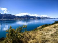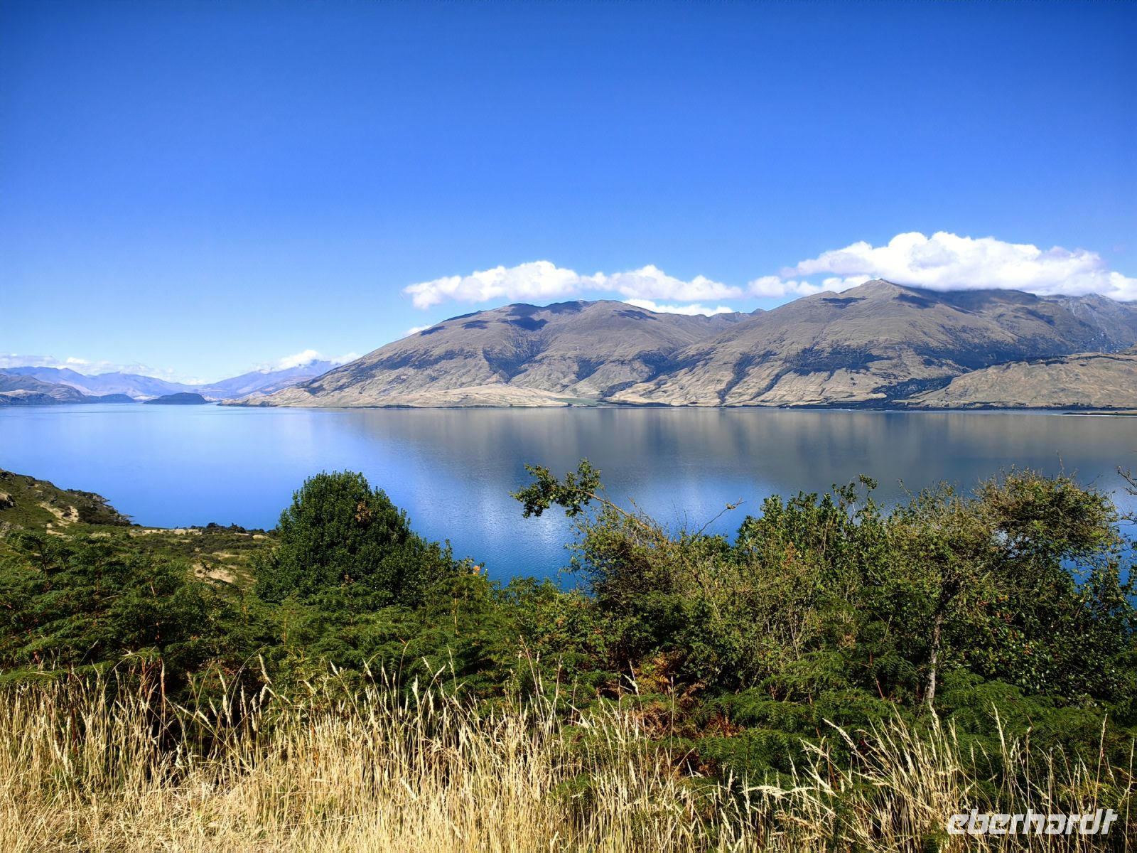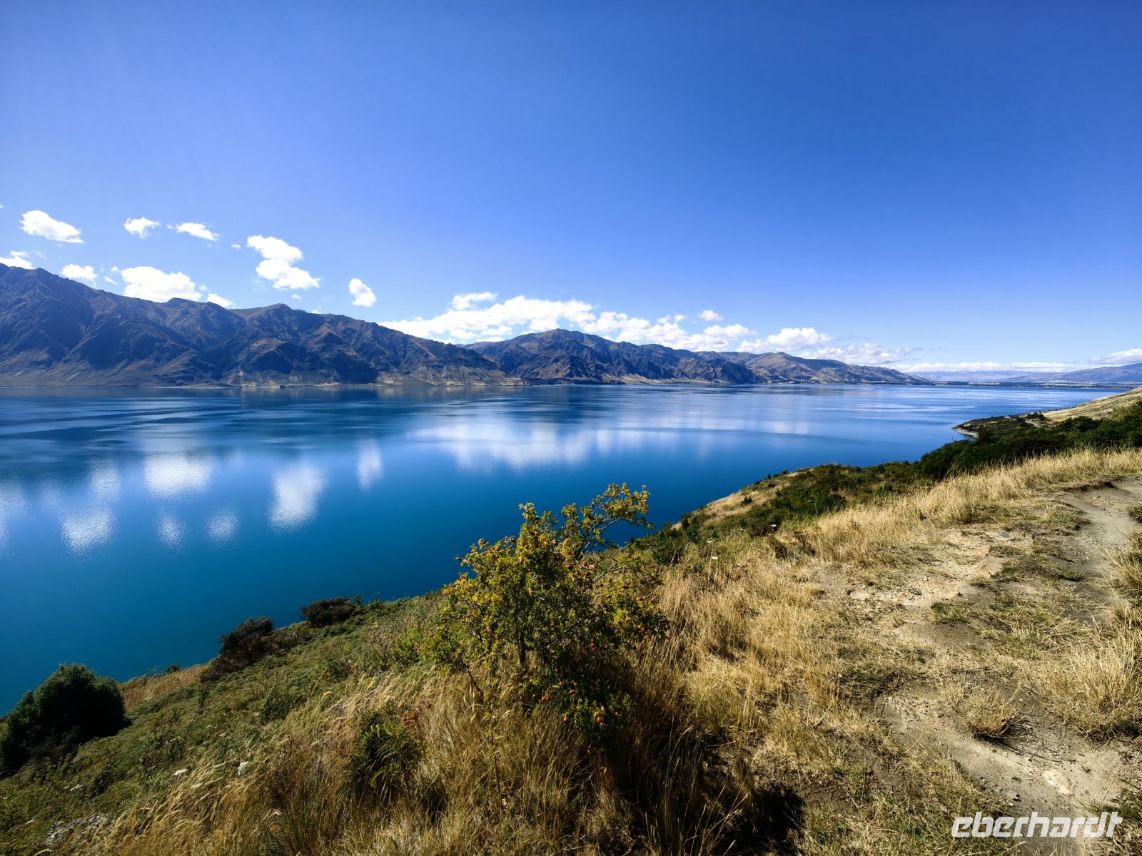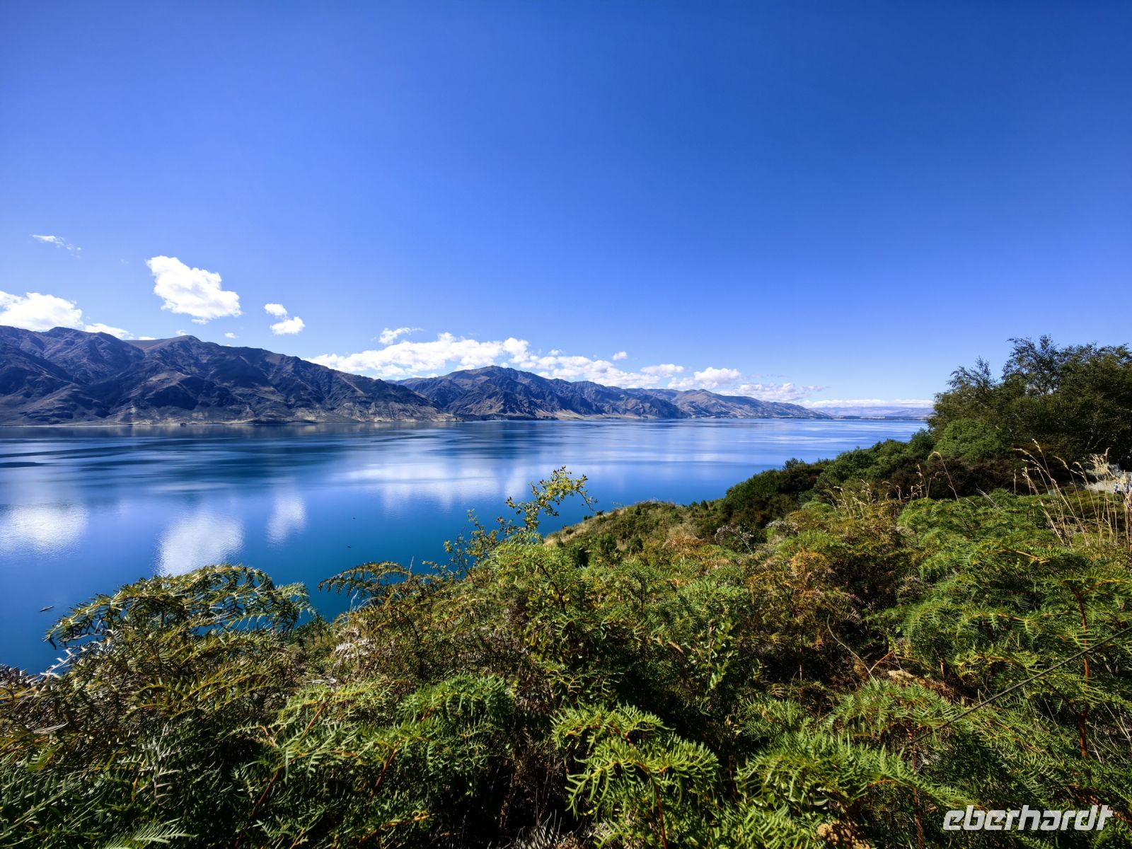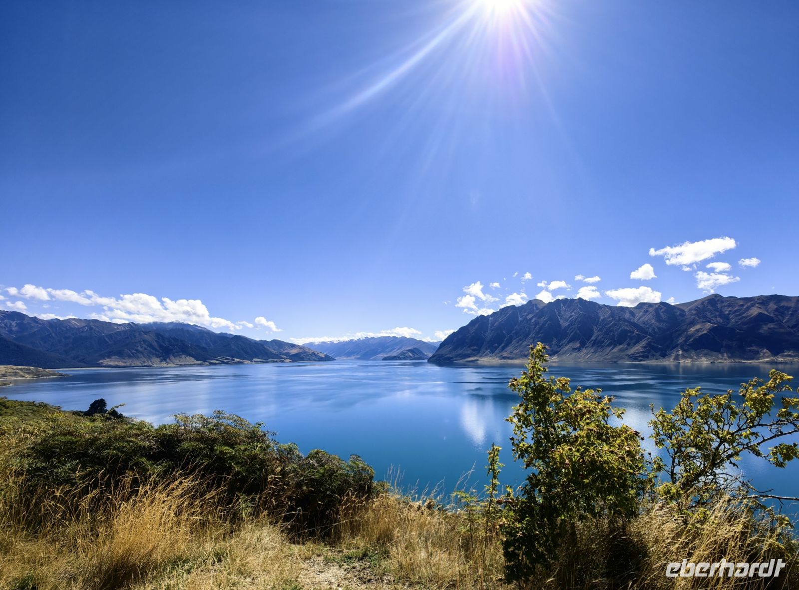 Am Lake Hawea staunen wir über das klare Wasser, in dem sich die umliegenden Bergriesen spiegeln und wunderschöne Erinnerungsfotos entstehen.