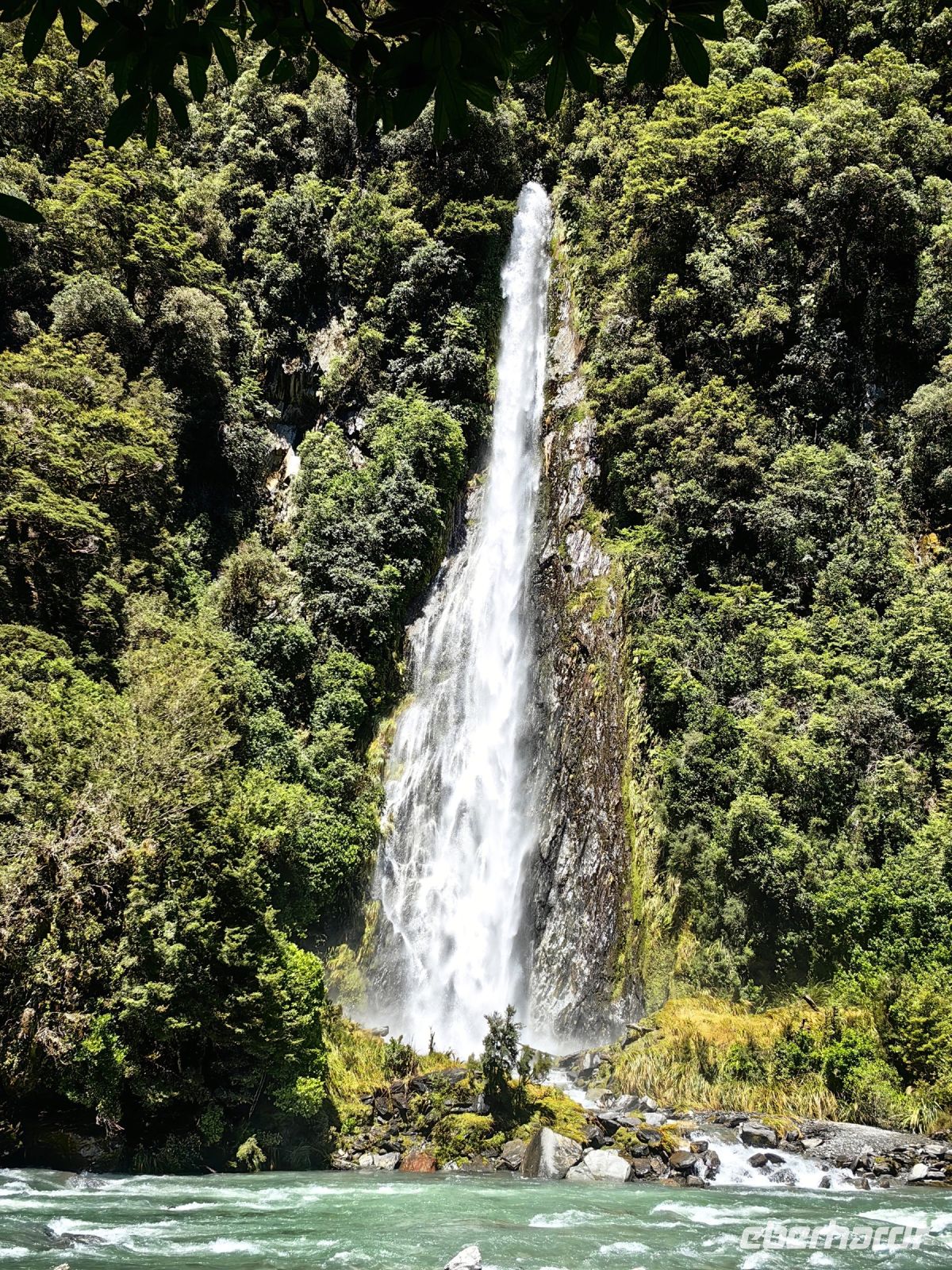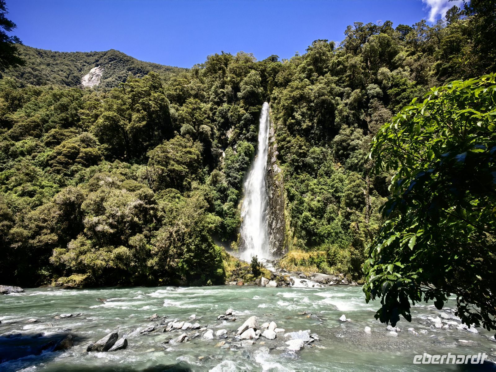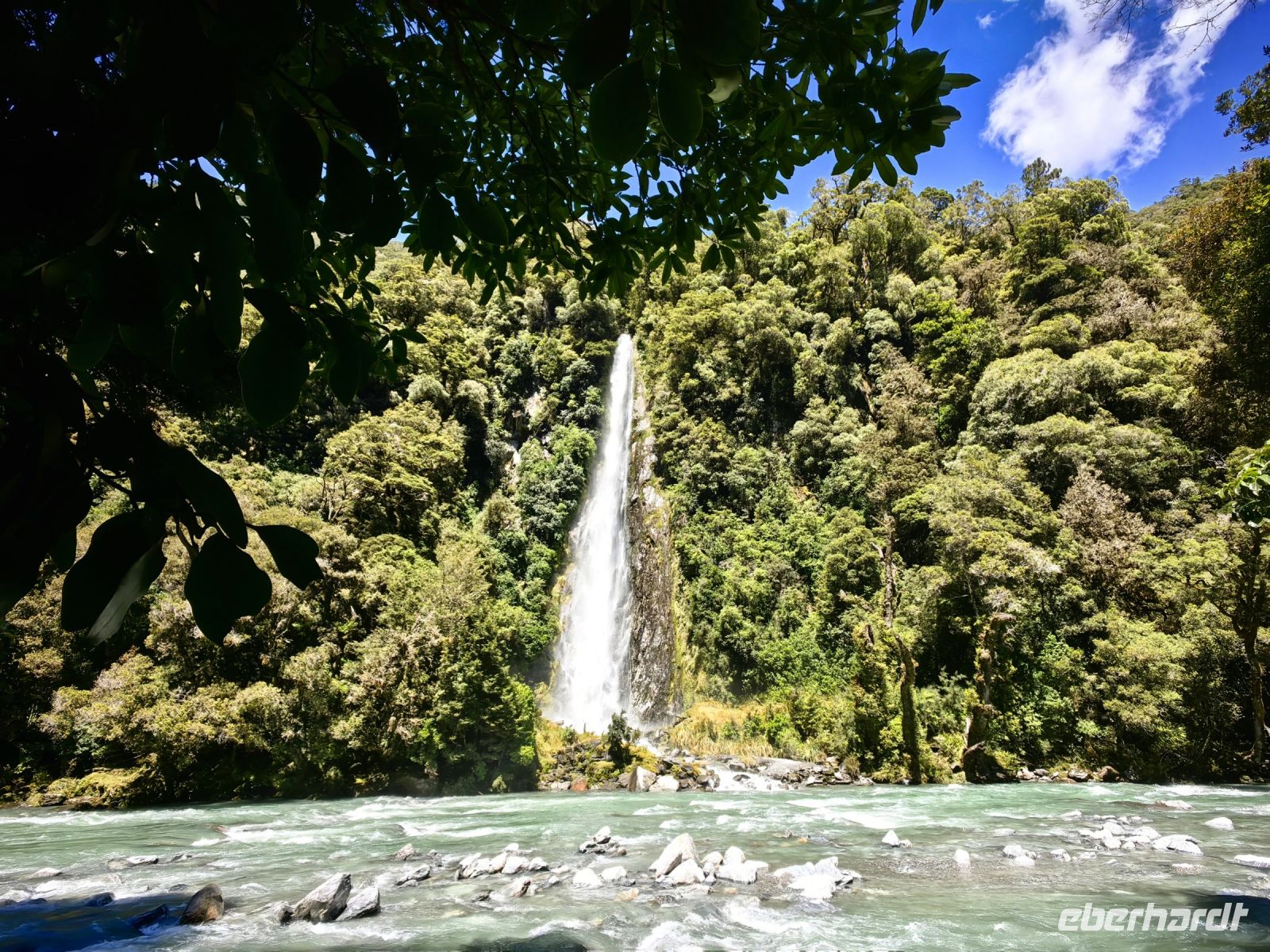 Von weitem schon erblicken wir den 27 Meter hohen Thunder Creek Wasserfall, zu ihm führt ein schmaler gewundener Pfad durch dichten Regenwald. Heute ist es allerdings nicht so kühl wie im Milford Sound und so können wir die riesigen Farne und Baumriesen ohne Frösteln in Ruhe anschauen und vor dem Wasserfall posieren.