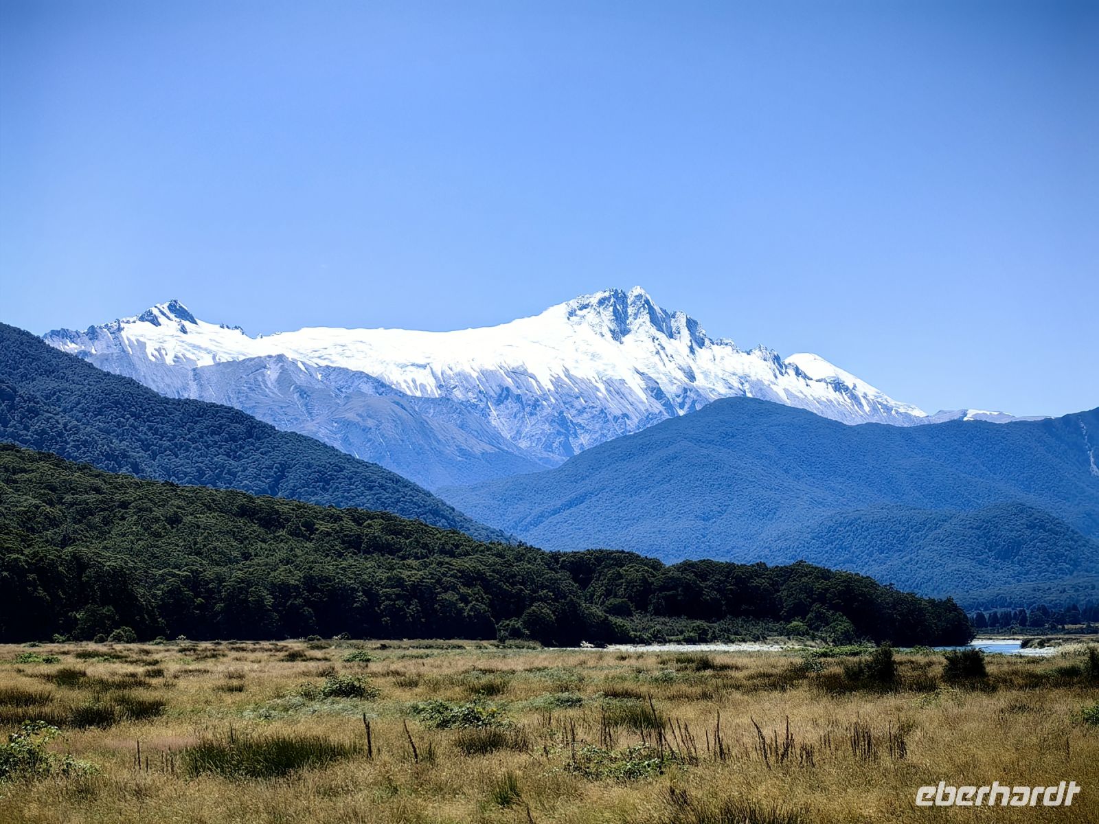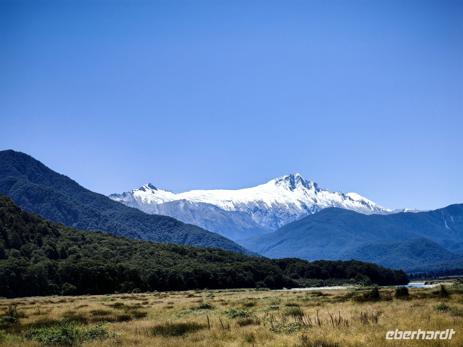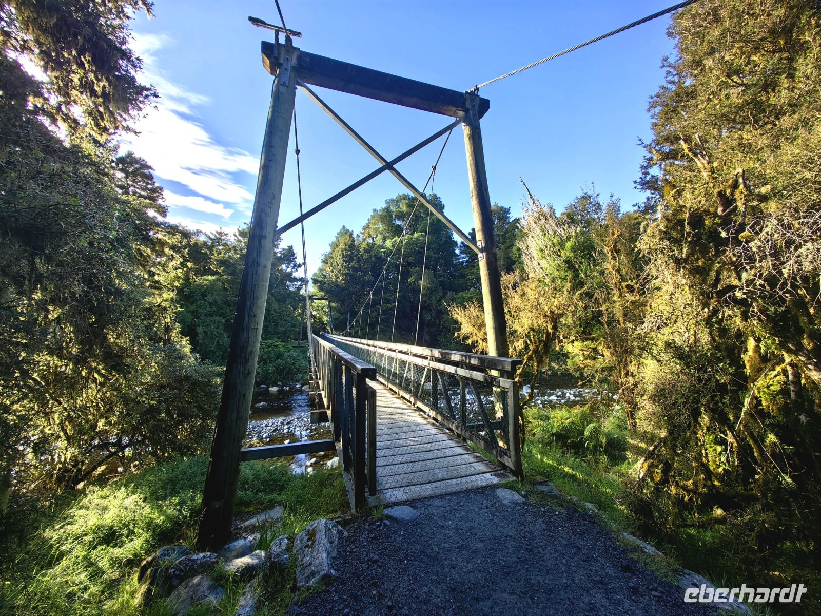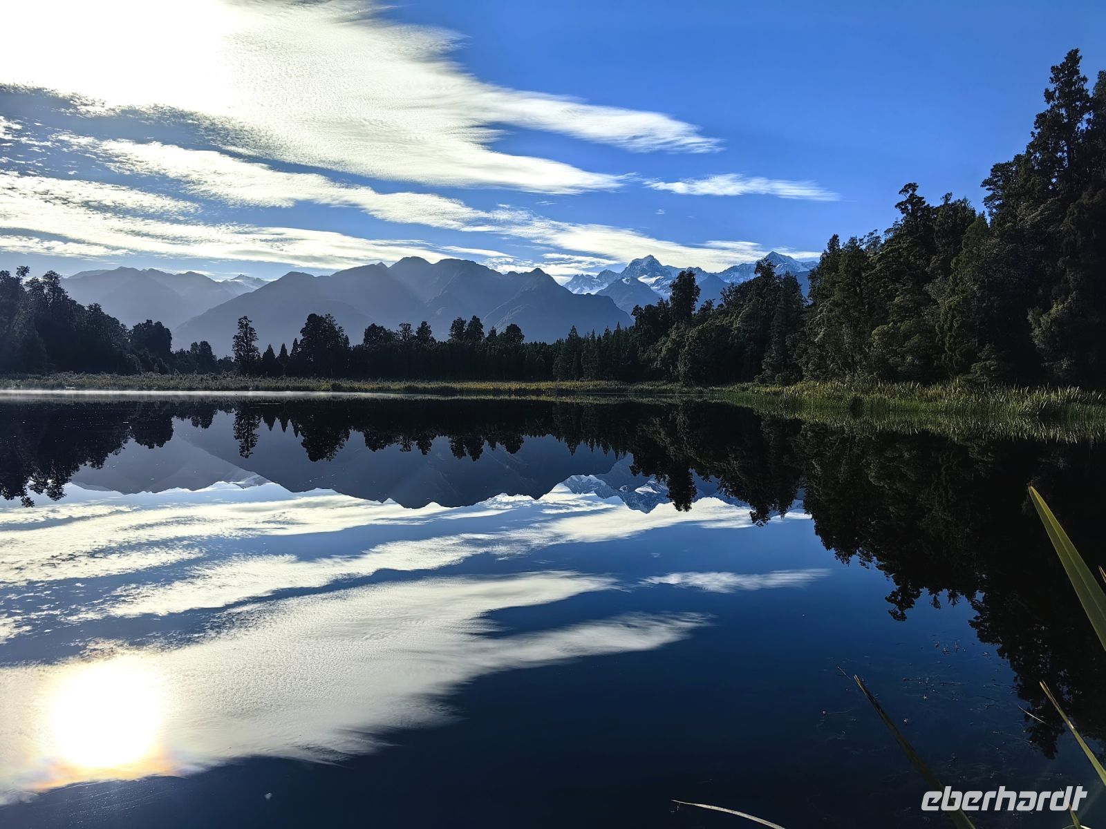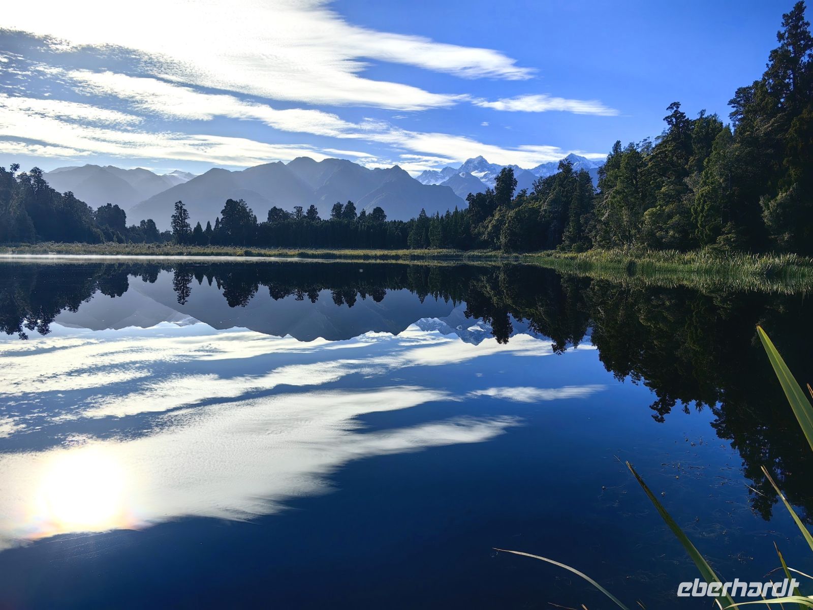Das erste Mal auf unserer Reise haben wir am Morgen einen völlig wolkenfreien strahlend blauen Himmel und jeder "Kiwi" bestätigt uns, daß so etwas nicht häufig vorkommt. Also ergreifen wir sogleich die Gelegenheit beim Schopfe und fahren zum Spiegelsee, dem Lake Matheson. Über eine Hängebrücke marschieren wir durch dichten Regenwald und stehen staunend am See: Die schneebedeckten Gipfel vom Mount Cook und Mount Tasman spiegeln sich beide darin und die Sonne ebenso. Nun müssen wir nur noch die richtige Perspektive für ein tolles Foto aussuchen.
