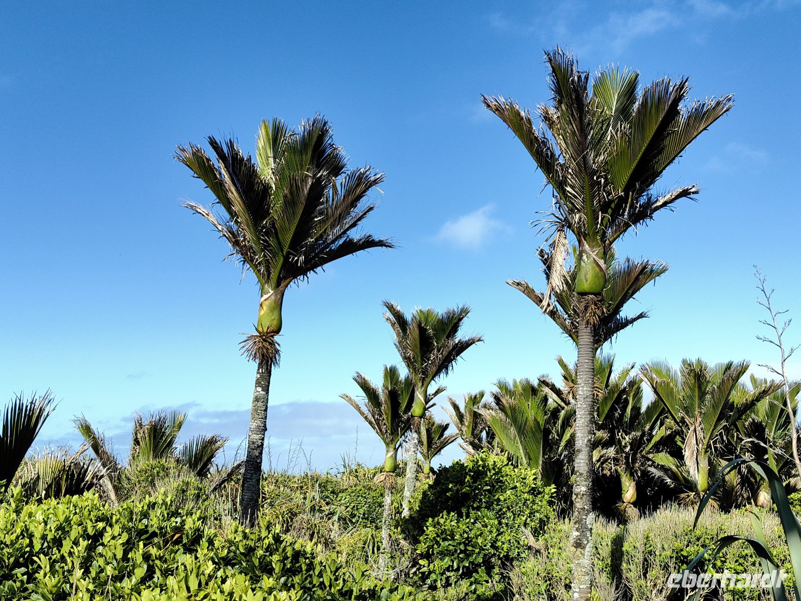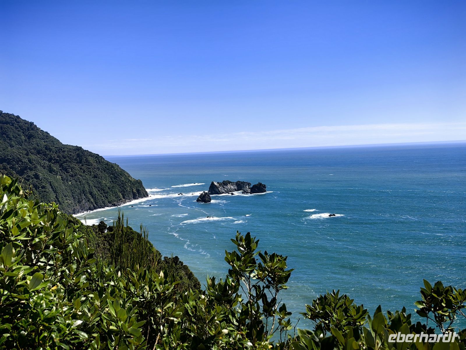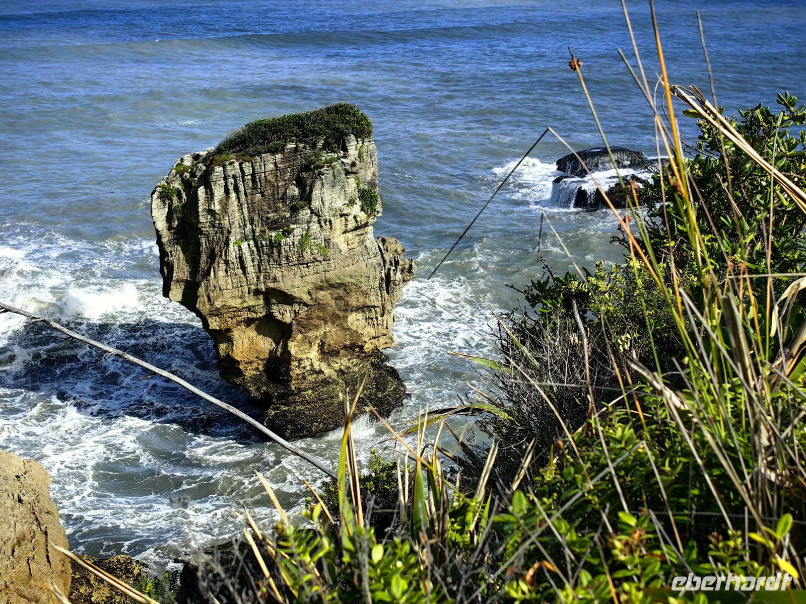 Punakaiki am Rande des Paparoa Nationalparks ist unser nächstes Ziel. Dort befinden sich die berühmten Eierkuchenfelsen, oder wie sie hier genannt werden: die Pancake Rocks. Dies sind beeindruckende Kalksteinformationen, die stark erodiert sind und tatsächlich aussehen, wie übereinander geschichtete Eierkuchen. Ein spektakulärer Rundweg ermöglicht es uns, umwerfende Fotos zu schießen und wir sehen auf dem Weg sogar eine Ralle, die im Dickicht des Waldes nach Futter sucht und auf den Felsen neuseeländische Austernfischer, die mit ihren lila Beinchen und langen roten Schnäbeln unverwechselbar aussehen. Typisch für die Region sind obendrein die endemischen Nikau Palmen. Diese Art erreicht Wuchshöhen von bis zu 15 Metern und die Stämme haben eine Struktur, die an übereinandergestapelte Ringe erinnert. Oben befindet sich eine Verdickung mit glatter Rinde. Ihre Früchte sind die Leibspeise der Kererutauben.