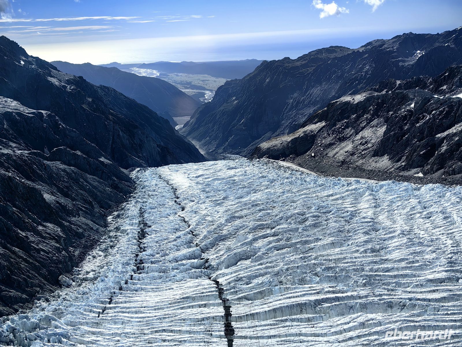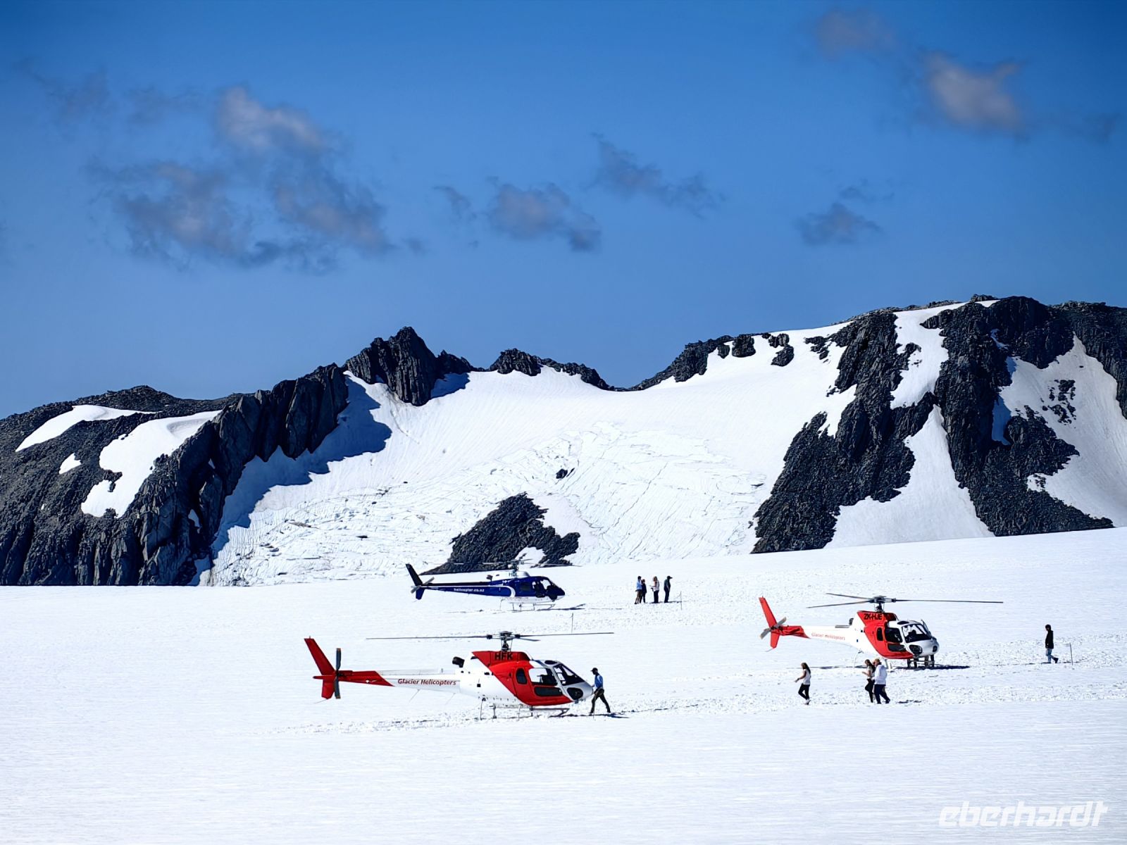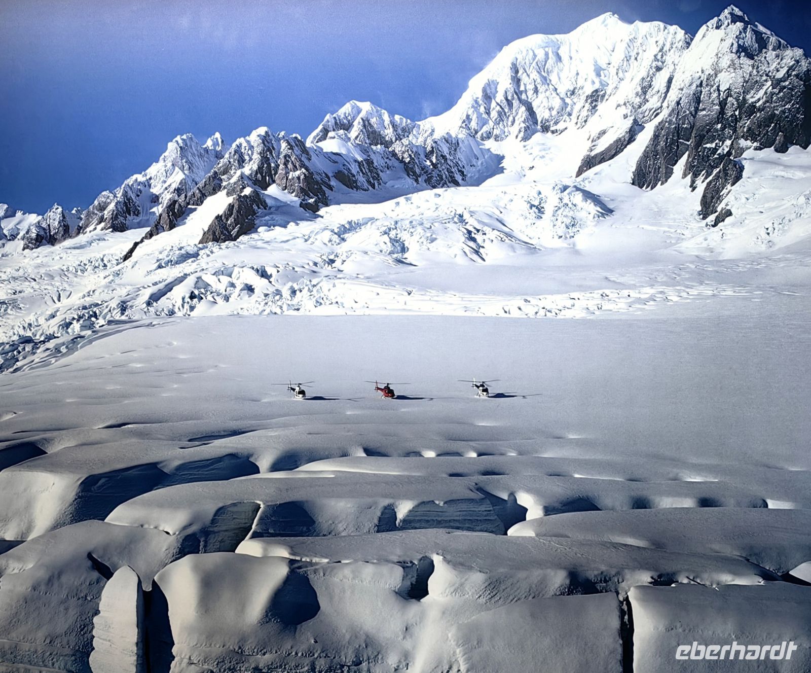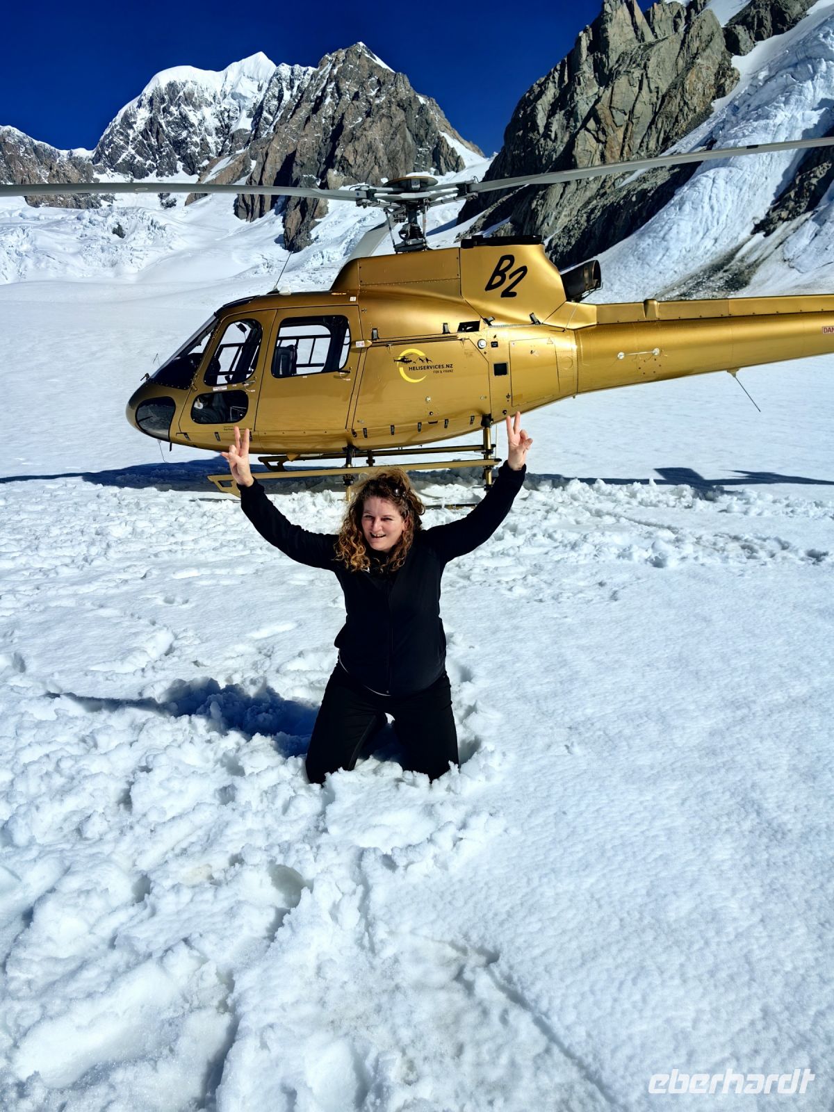 Wir steigen an der Tasmanischen See sanft nach oben und sehen zuerst die Gletscherzunge mit türkisblauen Gletscherspalten unter uns. Danach erblicken wir vor azurblauem Himmel die Bergriesen und den in der Sonne glitzernden weißen Schnee und steigen begeistert mitten auf dem Gletscher aus dem Hubschrauber aus, um sogleich eine Schneeballschlacht zu machen. Es ist ein unbeschreibliches Gefühl, hier oben zu stehen, es ist warm, einen Pullover brauchen wir nicht. Im tiefen Schnee posieren alle vor dem goldenen Helikopter. Nachdem wir unzählige Erinnerungsfotos für die Daheimgebliebenen geschossen haben, steigen wir wehmütig wieder ein und fliegen abwärts zurück zur Basis, wo die Regenwaldwanderer uns schon erwarten.