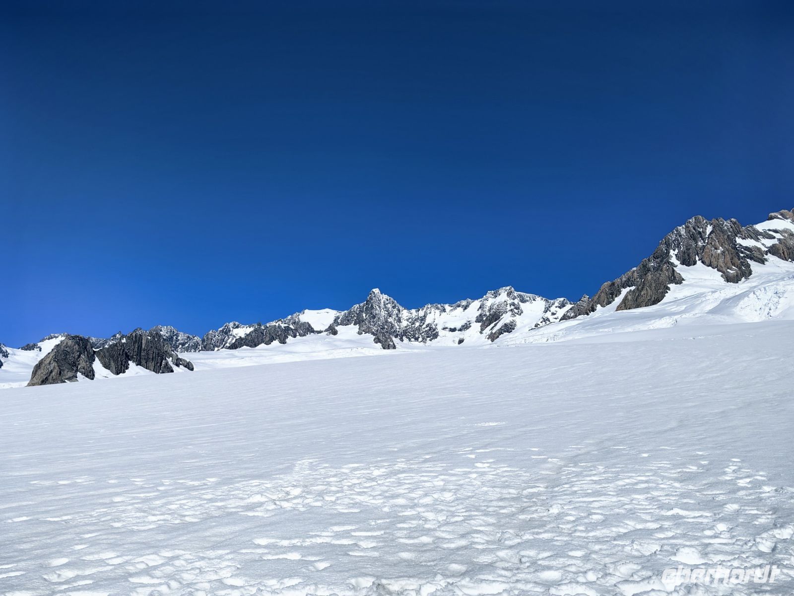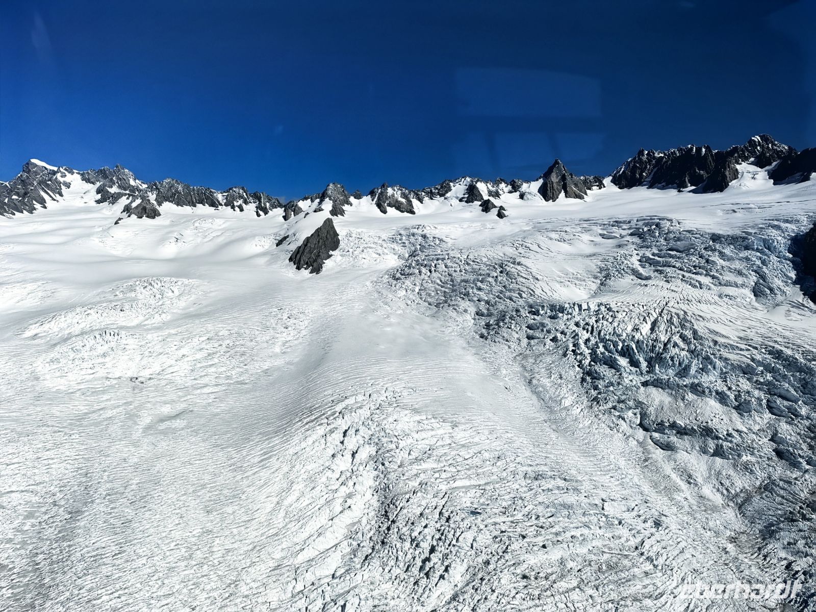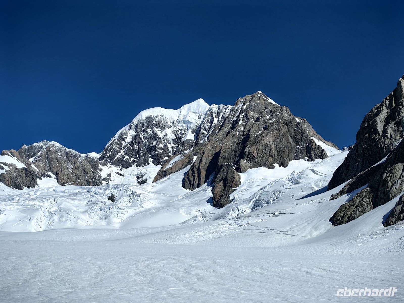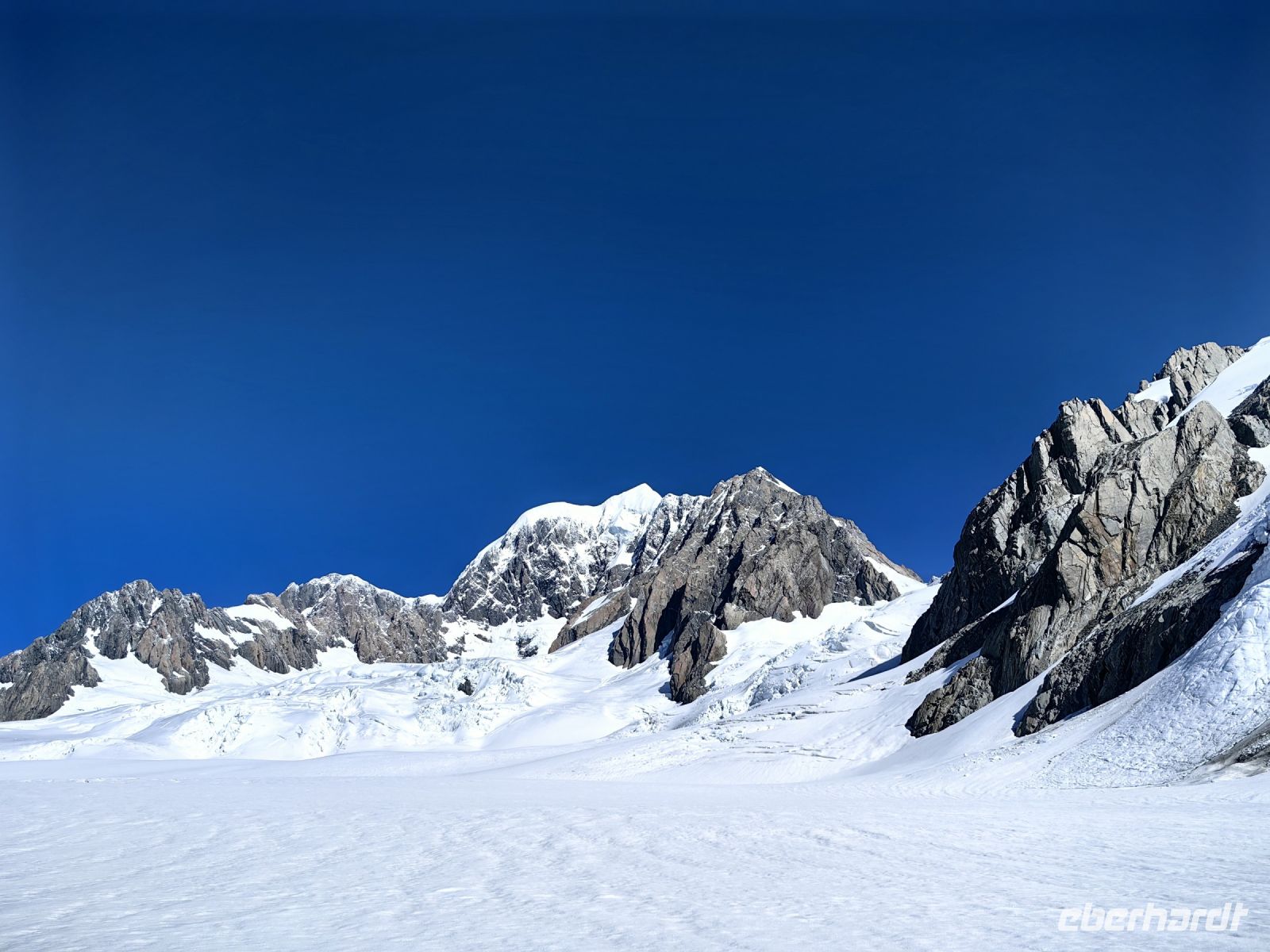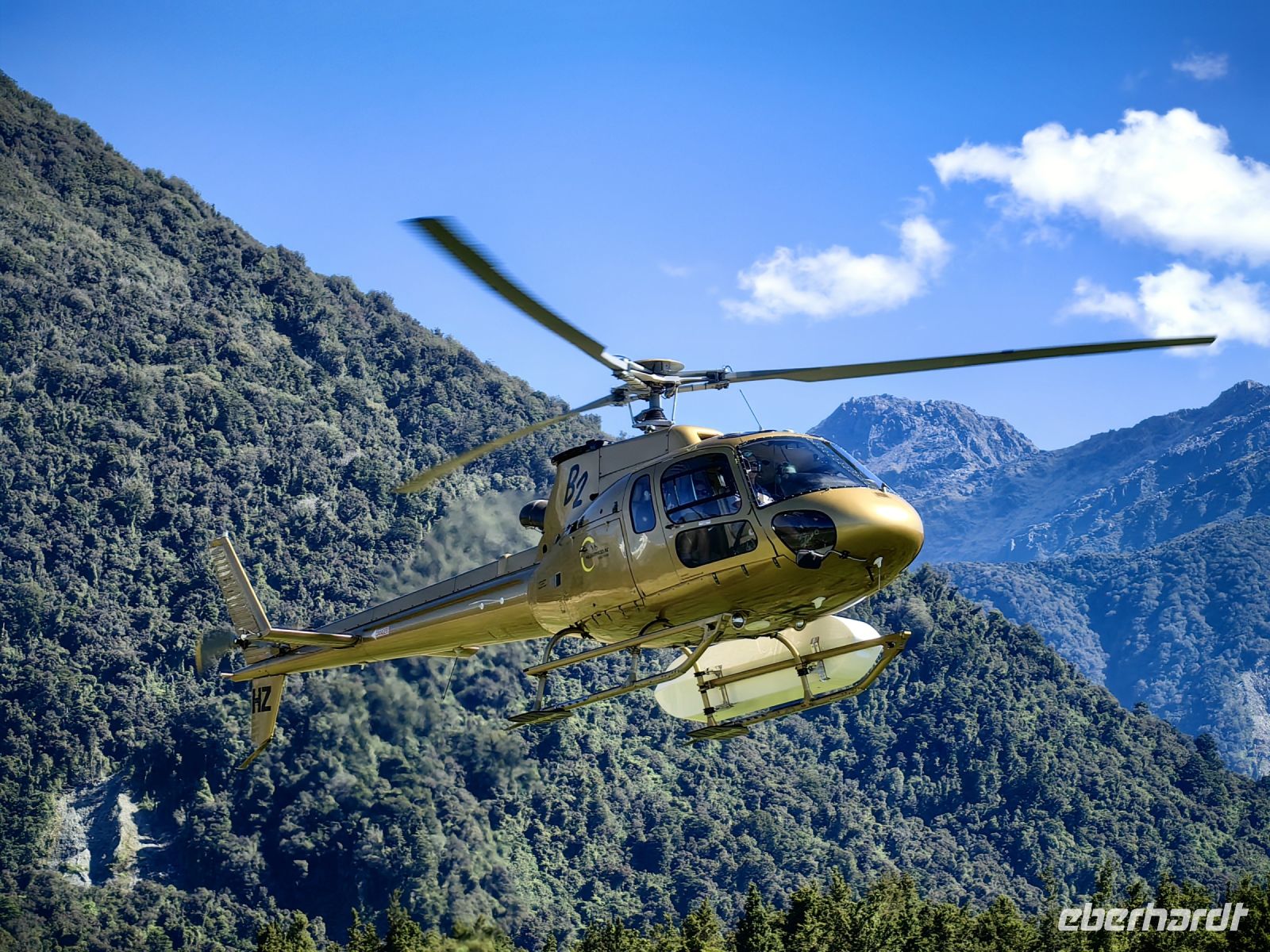 Wir steigen an der Tasmanischen See sanft nach oben und sehen zuerst die Gletscherzunge mit türkisblauen Gletscherspalten unter uns. Danach erblicken wir vor azurblauem Himmel die Bergriesen und den in der Sonne glitzernden weißen Schnee und steigen begeistert mitten auf dem Gletscher aus dem Hubschrauber aus, um sogleich eine Schneeballschlacht zu machen. Es ist ein unbeschreibliches Gefühl, hier oben zu stehen, es ist warm, einen Pullover brauchen wir nicht. Im tiefen Schnee posieren alle vor dem goldenen Helikopter. Nachdem wir unzählige Erinnerungsfotos für die Daheimgebliebenen geschossen haben, steigen wir wehmütig wieder ein und fliegen abwärts zurück zur Basis, wo die Regenwaldwanderer uns schon erwarten.