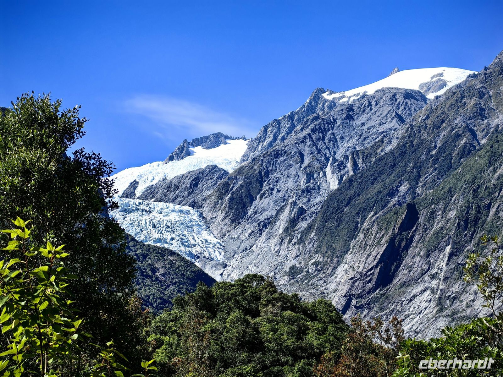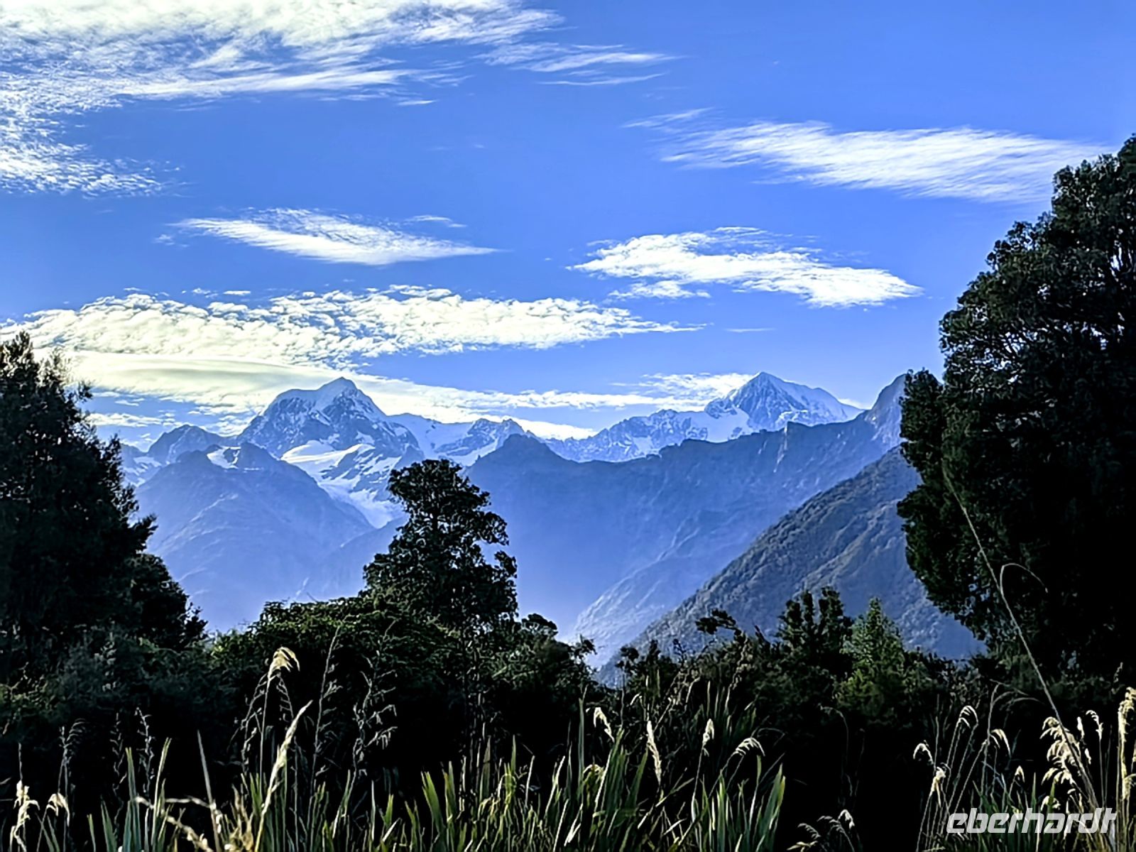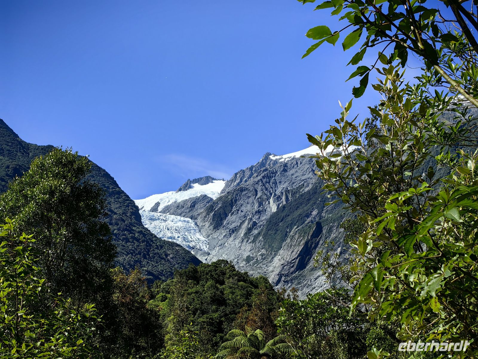 Unweit von Fox befindet sich der zweite große Gletscher Neuseelands, der Franz Josef Glacier. Er wurde erstmalig im Jahr 1865 vom Geologen Julius von Haast erkundet, der ihn nach dem damaligen österreichischen Kaiser benannte. Seit dieser Zeit hat sich die Gletscherzunge merklich zurückgezogen, wie wir am Aussichtspunkt feststellen, im Jahre 1908 reichte sie noch bis an den Lookout heran, heute ist sie weit entfernt zu sehen. Auf dem Weg durch den dichten Urwald zeigt uns Hampi den faszinierenden Nierenfarn, der nur hier in Neuseeland wächst. Der Hymenophyllum nephrophyllum wächt gewöhnlich auf dem Waldboden offener einheimischer Wälder. Bei heißem Wetter wie heute schrumpfen die Blätter, um Feuchtigkeit zu sparen, öffnen sich aber wieder, wenn es regnet. Uns erinnern sie ein wenig an Gingko.