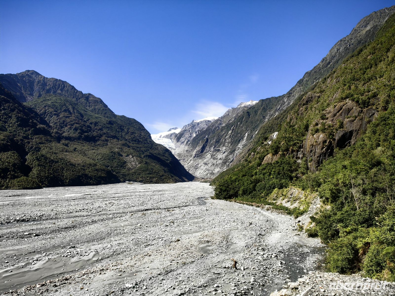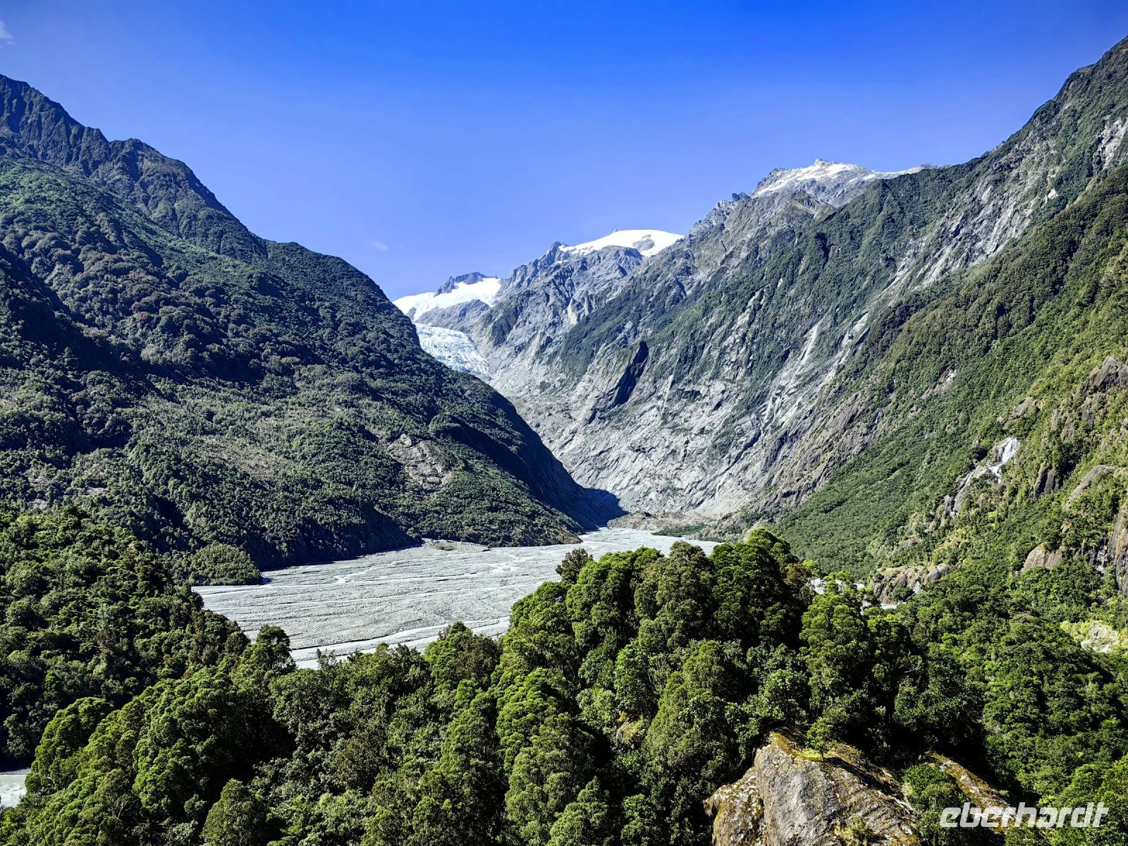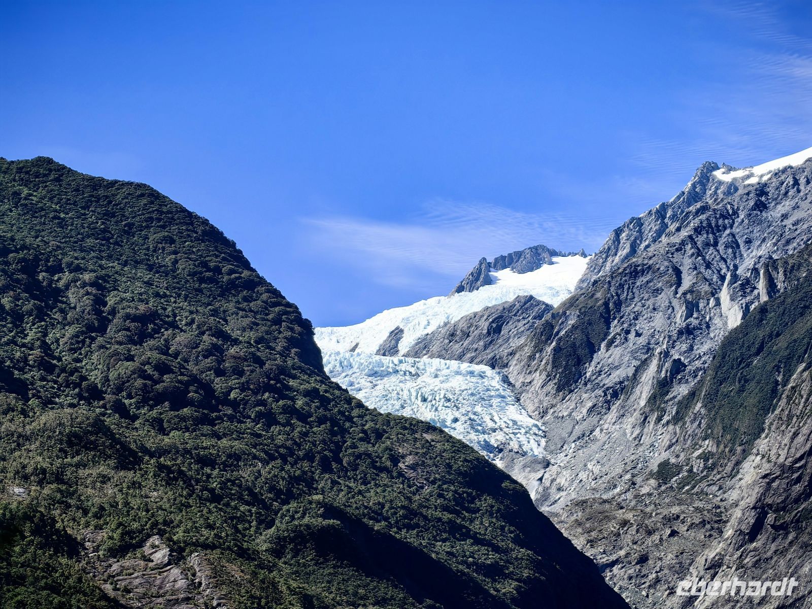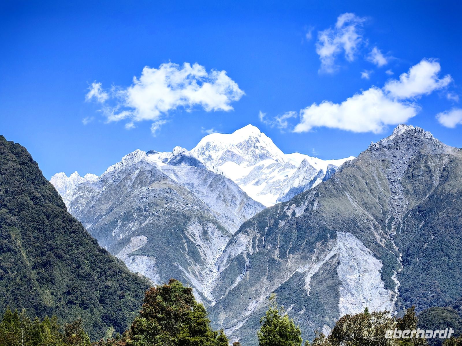 Unweit von Fox befindet sich der zweite große Gletscher Neuseelands, der Franz Josef Glacier. Er wurde erstmalig im Jahr 1865 vom Geologen Julius von Haast erkundet, der ihn nach dem damaligen österreichischen Kaiser benannte. Seit dieser Zeit hat sich die Gletscherzunge merklich zurückgezogen, wie wir am Aussichtspunkt feststellen, im Jahre 1908 reichte sie noch bis an den Lookout heran, heute ist sie weit entfernt zu sehen. Auf dem Weg durch den dichten Urwald zeigt uns Hampi den faszinierenden Nierenfarn, der nur hier in Neuseeland wächst. Der Hymenophyllum nephrophyllum wächt gewöhnlich auf dem Waldboden offener einheimischer Wälder. Bei heißem Wetter wie heute schrumpfen die Blätter, um Feuchtigkeit zu sparen, öffnen sich aber wieder, wenn es regnet. Uns erinnern sie ein wenig an Gingko.