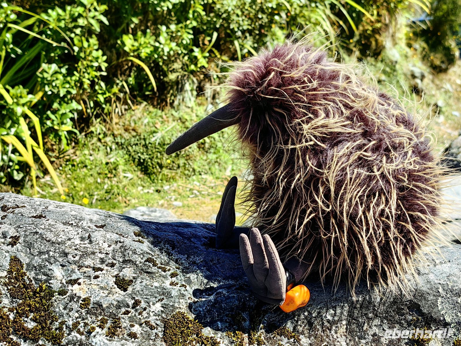 Wir machen zwei kleine Wanderungen und lernen dabei den Lebensraum des Kiwi kennen. Der Urwald wuchert dicht und üppig grün, allerdings fehlen die ganz großen Bäume. Alles ist über und über bewachsen, kleine bunte Blumen stehen zwischen Moosen und Flechten und dazwischen blüht rosafarbenes Heidekraut. Auch wenn sich die drei markanten Bergspitzen vor uns in den Wolken verstecken, ist die Landschaft faszinierend und einmalig.