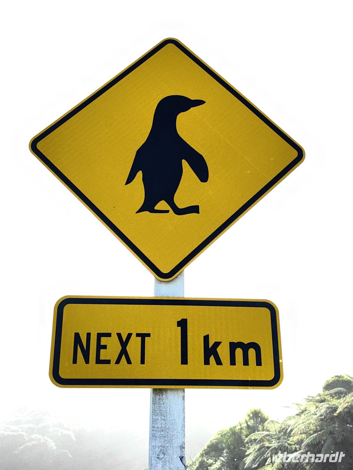 Es ist unfaßbar, der letzte Tag unserer fantastischen Rundreise ist bereits angebrochen. An der Tasmanischen See erwachen wir. Dieses Meer zwischen Australien und Neuseeland ist wild, die Strände sind steinig, oft toben Stürme an der Westküste und die Besiedlung ist sehr dünn. Trotz allem findet unser Hampi wieder einen tollen Aussichtspunkt und wir können einen Blick auf die tosenden Wellen hinter den orangefarben blühenden Montbretien werfen. Zum wiederholten Mal entdecken wir ein Verkehrsschild, welches es nur hier auf Neuseeland gibt: diesmal ist ein Pinguin drauf.