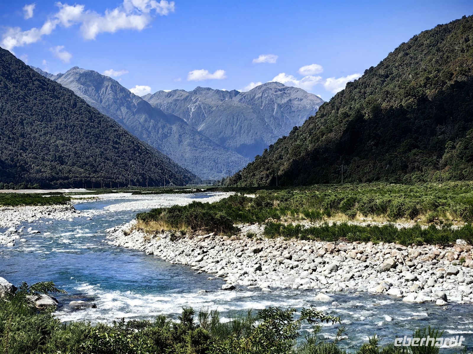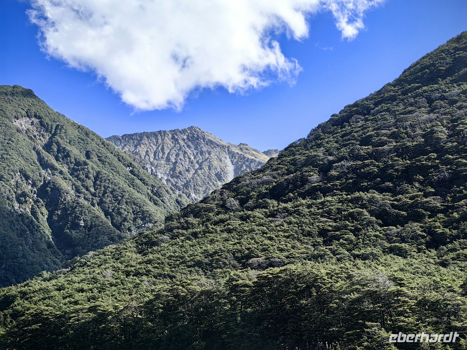 Nachdem wir in Makarora eine Picknickpause im Grünen eingelegt haben, erklimmt unser Hampi mit dem kleinen Bus den Haast Pass. Benannt wurde dieser Pass nach Julius von Haast, einem deutschen Geologen, der Mitte des 19. Jahrhunderts Neuseeland bereiste und auf der Suche nach Knochen des ausgestorbenen flugunfähigen Moa war, der in etwa wie ein Strauß ausgesehen haben muß. Der höchste Punkt dieses Passes befindet sich zwischen den Tälern des Haast und des Makarora Rivers in 564 Metern.