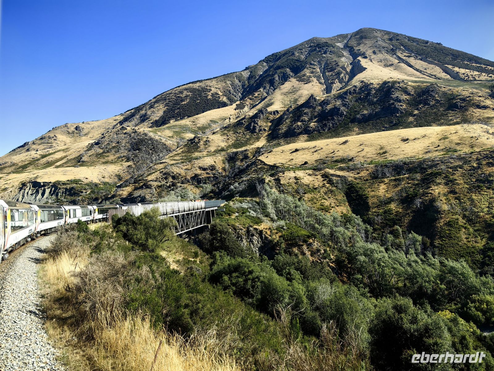 Allerdings steht DIE spektakulärste Zugfahrt durch die neuseeländischen Südalpen nach Christchurch mit dem Kiwi Express Panoramazug noch auf dem Programm und gespannt warten wir am Bahnhof, bis der Zug mit einiger Verspätung endlich eintrifft. Diese TranzAlpineverbindung gibt es bereits seit 1987. Der Zug nutzt dabei die Midland-Line-Bahnstrecke von 223 Kilometern durch spektakuläre Landschaften. Wir rauschen über fünf Viadukte, durchfahren 16 Tunnels und bekommen eine Schiebelok, die es erst ermöglicht, den Arthurs Pass zu erklimmen. Die Landschaft zieht anmutig am Zugfenster vorbei, türkisblaue Flußtäler heben sich kontrastreich von den mit Pampasgras bewachsenen und goldgelb schimmernden Bergen ab. Auf den Weiden grasen tausende Schafe und Kühe. Da es im Zug offene Abteile gibt, schießen wir unzählige Erinnerungsfotos und kommen beeindruckt und müde am Abend in Christchurch an, wo uns ein letztes leckeres gemeinsames Abendessen erwartet. Wir bedanken uns bei Hampi und lassen nochmal einige Höhepunkte dieser langen Traumreise Revue passieren.