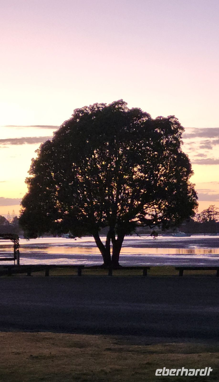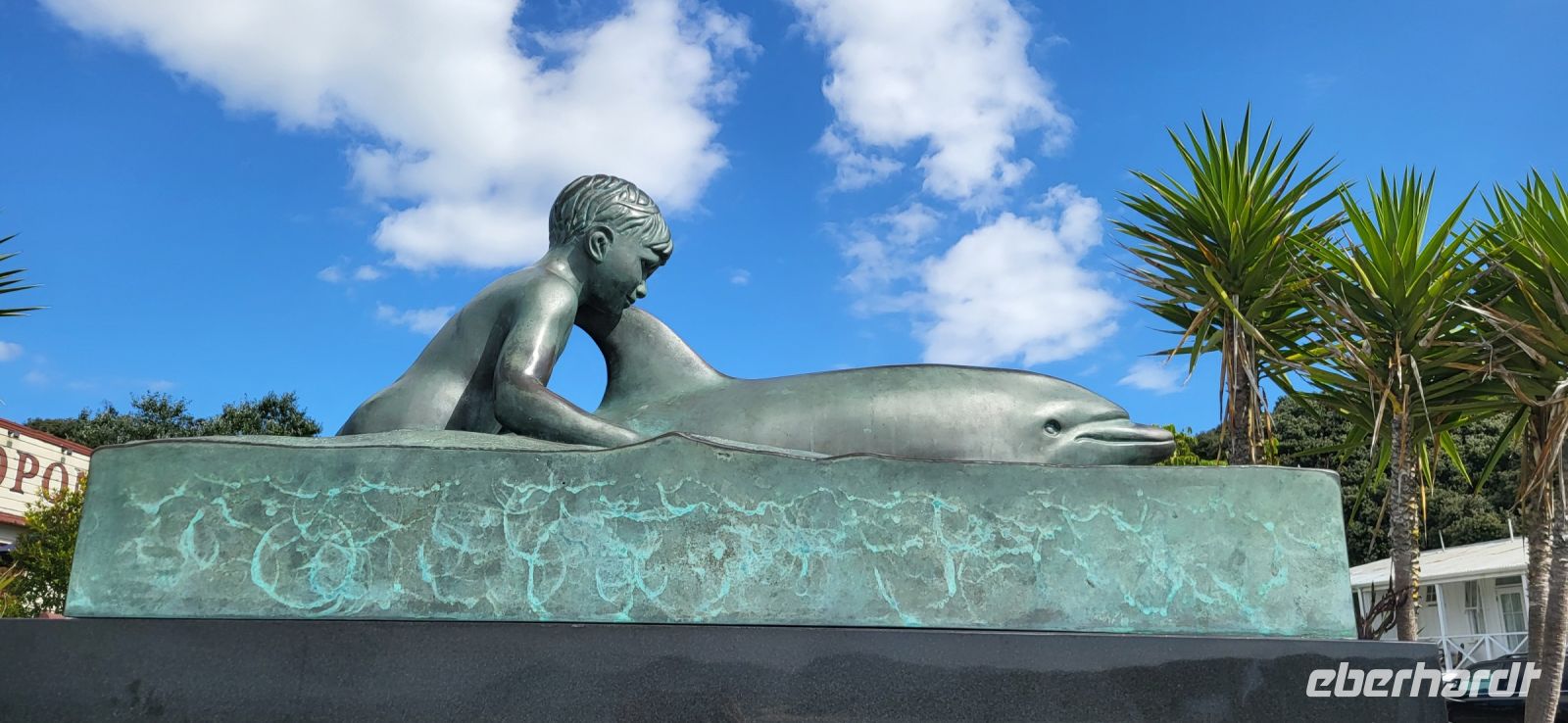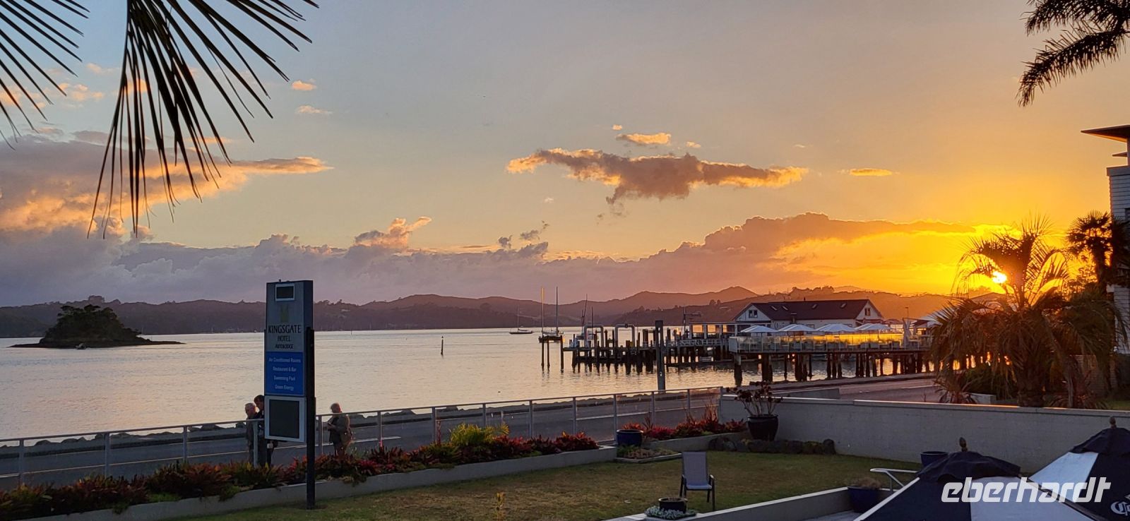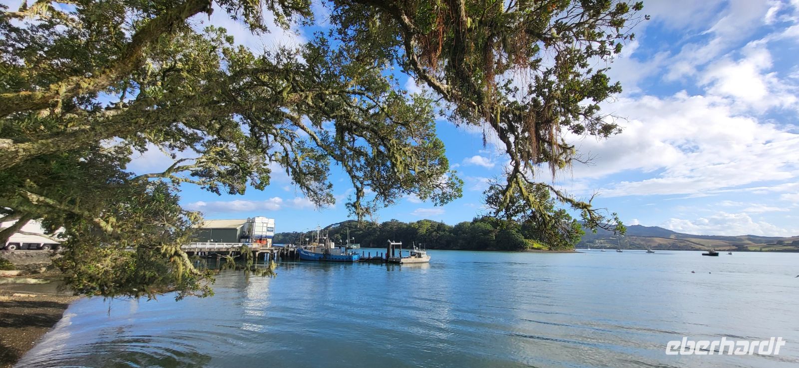 Wir fahren weiter und genießen die Landschaft der Nordinsel mit deren Hügeln und vor allem der Weite. . Als Nächstes besuchen wir das imposante Kauri-Museum. Der Kauri, auch neuseeländische Kiefer oder Fichte genannt, ist die größte neuseeländische Baumart, die auch gerne als Mammutbaum bezeichnet wird. Mit einem der sehr großen Exemplare ließen sich früher bis zu 20 Häuser errichten und im Museum sehen wir, erklärt durch Guide Roger, wie die Bäume früher verarbeitet und verwendet wurden. So viel Wissen macht hungrig und durstig und so kehren wir in das schöne Museumscafé, von wunderbarer Natur umgeben, ein. Auf der Weiterfahrt erzählt uns Roger, wie und was ihn vor vielen Jahrzehnten nach Neuseeland verschlagen hat. Gebannt lauschen wir dieser als einst kurzer Trip zweier deutscher Studenten angedachten Schicksalsreise … Nachmittags besuchen wir den Tane Mahuta, einen der ältesten noch existierenden Kauribäume, der 51 m hoch und ca. 2000 Jahre alt ist. Ein unglaubliches Bild, welches sich uns bietet und wir fühlen uns vor ihm nur noch nichtig und klein ….denn dieser, der nach dem Gott des Waldes benannt wurde (Tane) hat dazu einen Umfang von 13,77 m in Bodennähe. Unsere Reise führt uns weiter zu einem tollen Fotostopp am Hokainga Harbour (Hafen) von wo wir einen tollen Blick auf eine vor uns liegende Wanderdüne der gegenüberliegenden Bucht haben. Im Anschluss noch ein Halt in Opononi, welches durch eine zahme Delphindame „Opo“ in 1955/56 Berühmtheit erfuhr. Ein Denkmal und ihr Grabstein, denn sie verstarb dort auf mysteriöse Art und Weise, erinnern noch heute daran. Nach einem erlebnisreichen Tag erreichen wir Paihia, unseren Standort für zwei Nächte, unternehmen eine orientierende Ortsdurchfahrt und verstehen schnell, wieso der Name in der Maori Sprache „schön hier“ bedeutet. Den Abend lassen wir mit einem schmackhaften Menü im Hotelrestaurant mit Blick auf die vor uns liegende Bucht ausklingen.