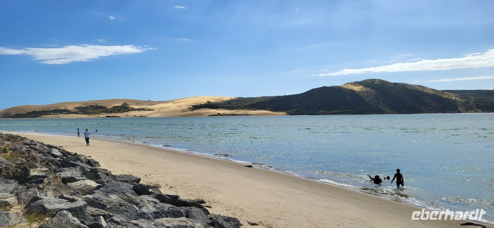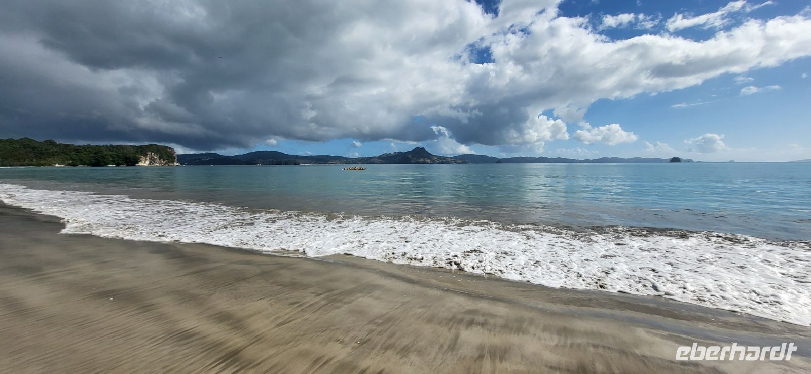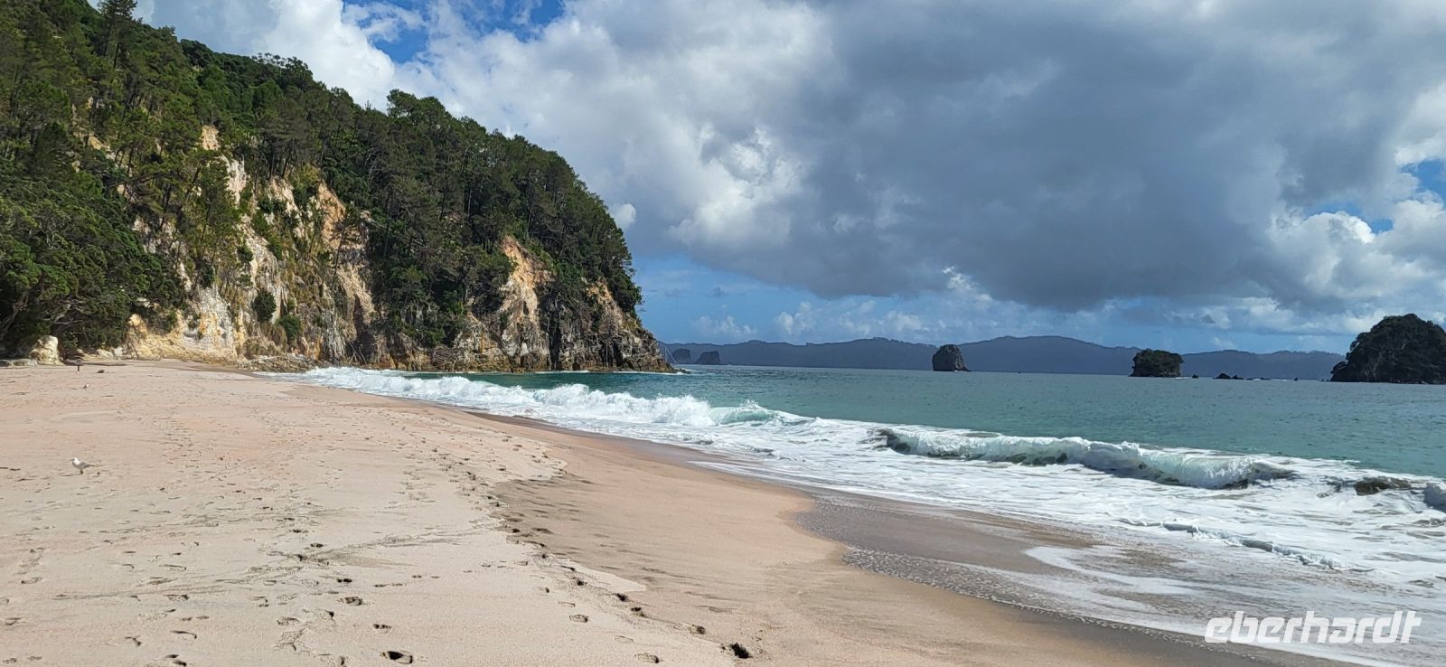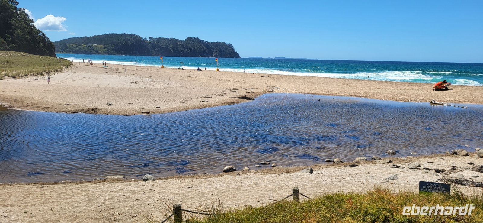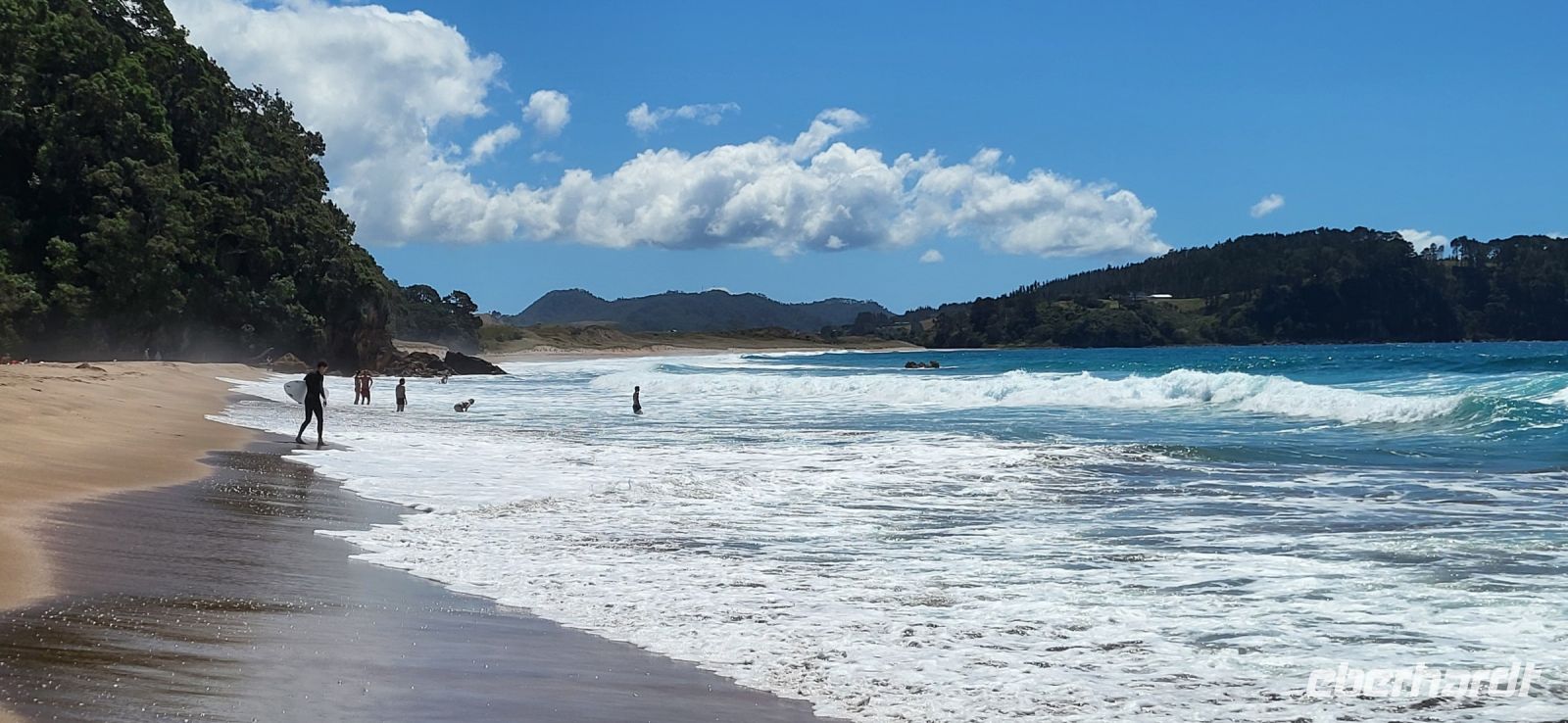 Nach einem herrlichen Frühstück im gegenüberliegenden Restaurant Pepe, machen wir uns auf, um die Coromandel-Halbinsel zu erkunden. Der heutige Tag steht im Zeichen der Strände und so erfolgt unser erster Halt am Cooks Beach. Dieser ist ein ca. 3 km langer Sandstrand der sich von der Cooks Bay bis zur Mercury Bay erstreckt und zum Baden einlädt. Von den uns begegneten Bewohnern hören wir, dass dieser beinahe täglich genauso schön leer ist, wie wir ihn heute vorfinden und lediglich an den Wochenenden von vielen Besuchern aus Auckland heimgesucht wird. So haben wir ausreichend Zeit für einen schönen Strandspaziergang oder ein kühles Bad im Pazifik. Unser Tagestrip führt uns weiter nach Hahei zum gleichnamigen Strand, von wo aus man normalerweise zur Cathedral Cove startet, deren kathedralförmiger Felsen jedoch leider einsturzgefährdet und nicht mehr betretbar ist. Somit bietet uns Hahei Beach eine unglaublich schöne Alternative und wir fühlen uns wie in der Südsee. Eine herrliche Kulisse mit tollen Wellen, sauberem Strand und anmutigen Ferienhäusern, die oberhalb der Küste stehen. Urlaubsfeeling pur und wir genießen unseren Aufenthalt in vollen Zügen. Der letzte Stopp des heutigen Reisetages erfolgt am sogenannten Hot Water Beach. Bekannt im ganzen Land ist dieser dafür, dass hier bei Ebbe Thermalwasser an die Oberfläche gelangt und man mit einem Spaten seine eigene Badewanne schaufeln kann, indem das heiße Wasser aus dem Boden strömt und man es mit kühlem Meerwasser zur passenden Temperatur mischt. Bei perfekten Bedingungen wird dieser Strandabschnitt zum dicht besiedeltsten „Sandkasten“ Neuseelands. Dieses Phänomen bleibt uns heute jedoch verwehrt, da wir bei Flut dort sind und die heißen Quellen unter Wasser liegen. Trotzdem bietet sich uns erneut eine wunderbare Kulisse und wir schauen den wenigen Surfern beim Kampf mit den Wellen zu. Schwimmen ist hier nicht ratsam, da starker Wellengang und eine immense Unterwasserströmung herrscht. Zurück in Tairua genießt jeder den Nachmittag auf seine Weise und auch das uns umgebende Meer ist zurückgekehrt.
