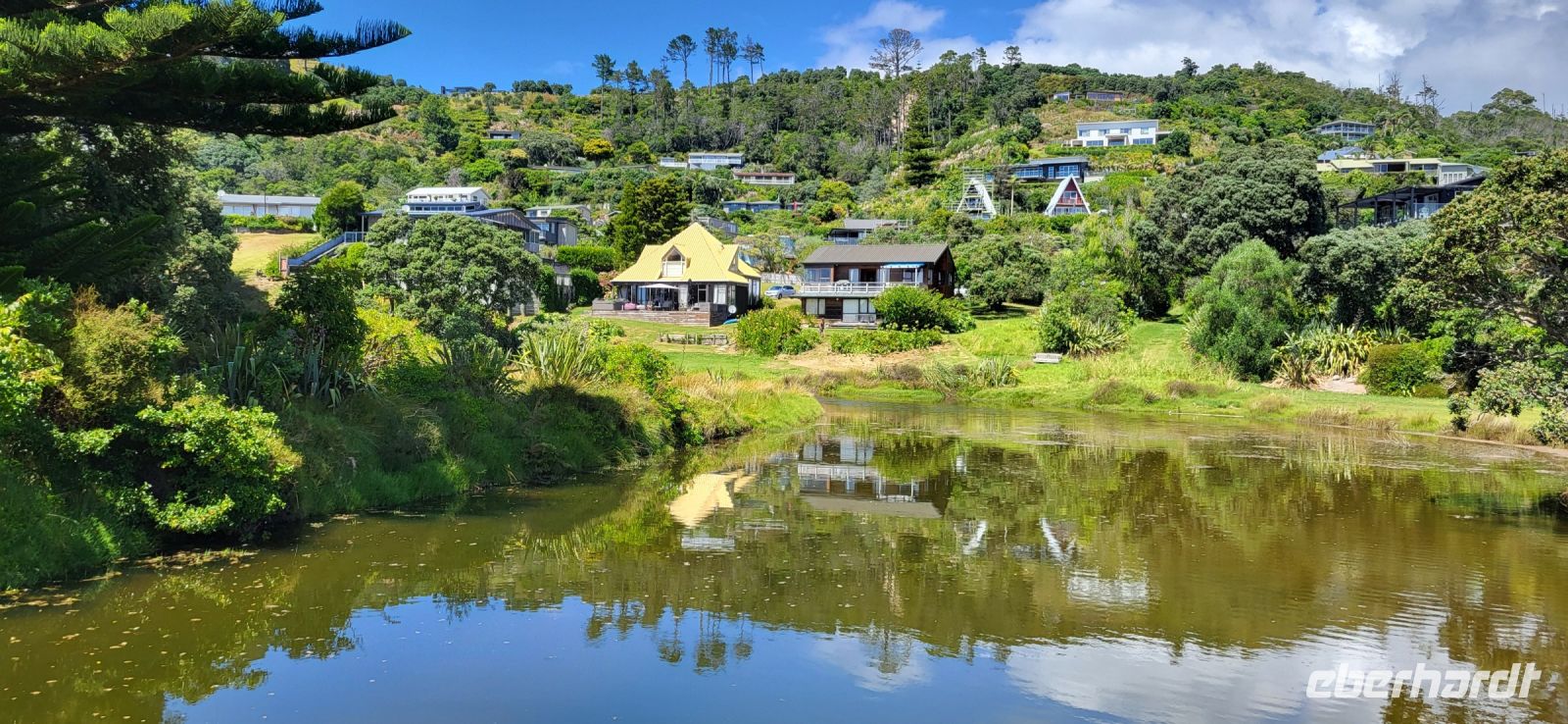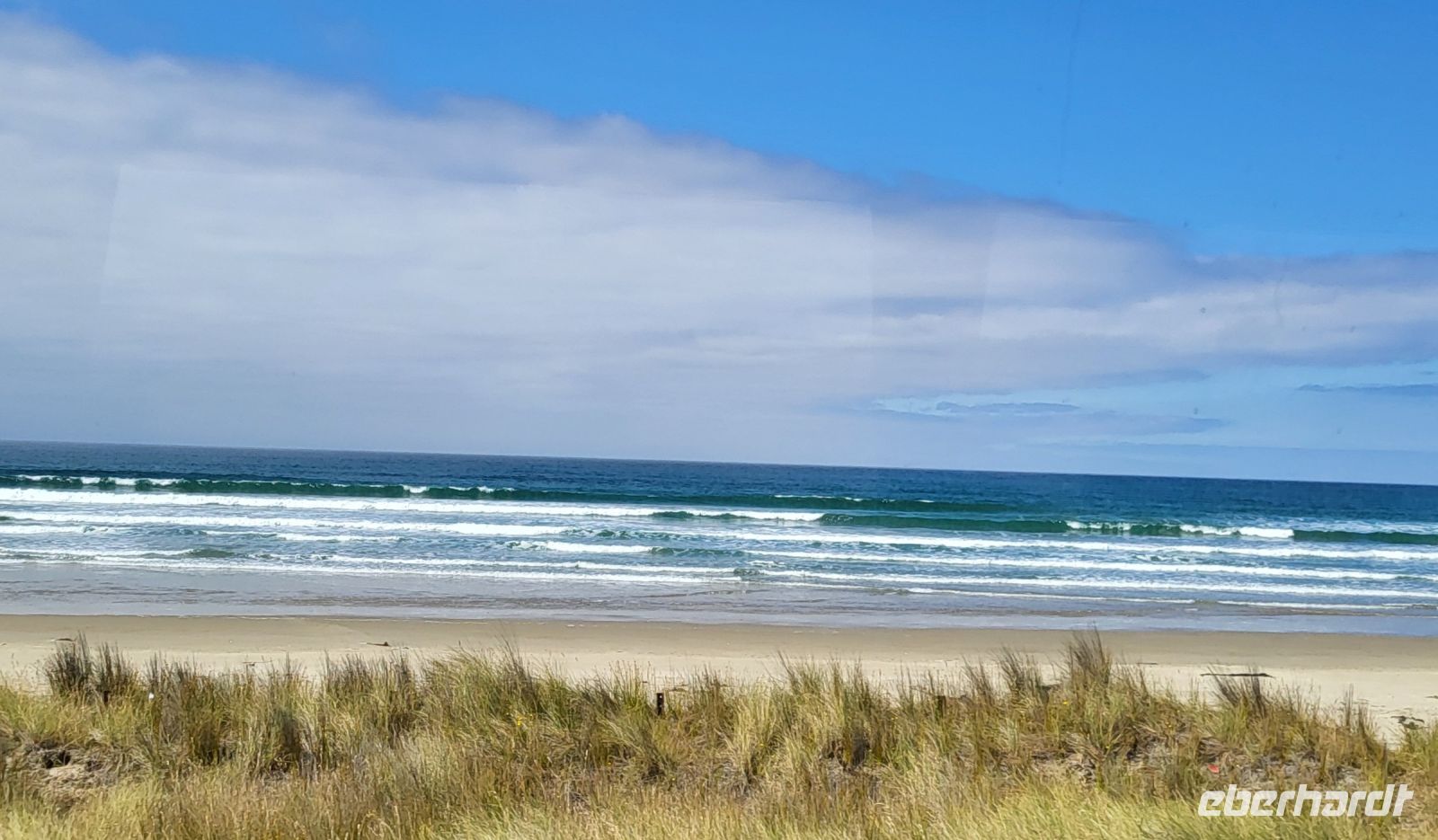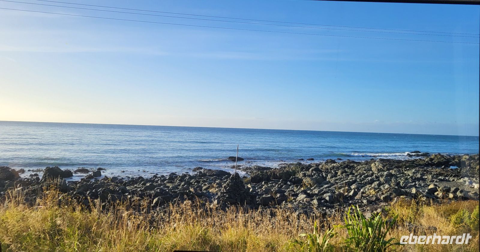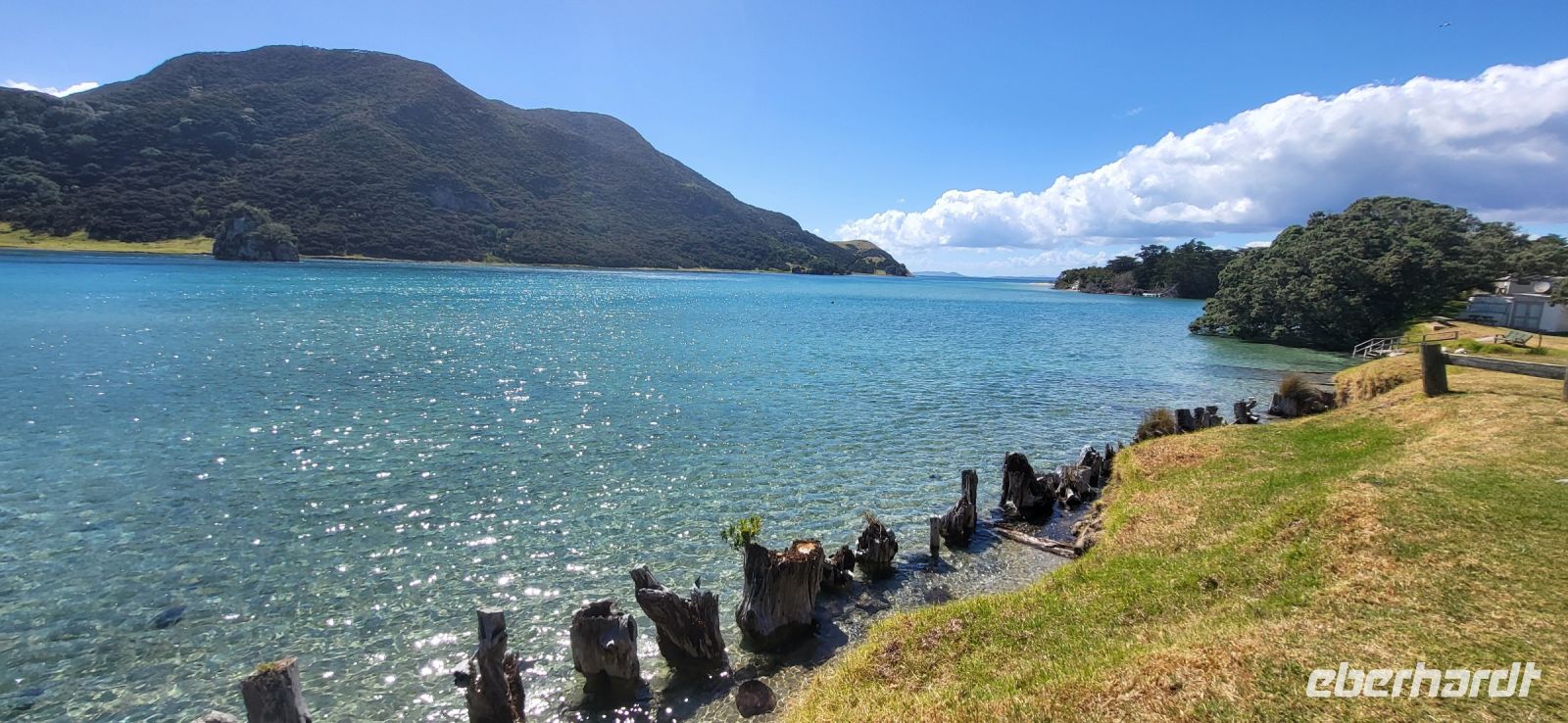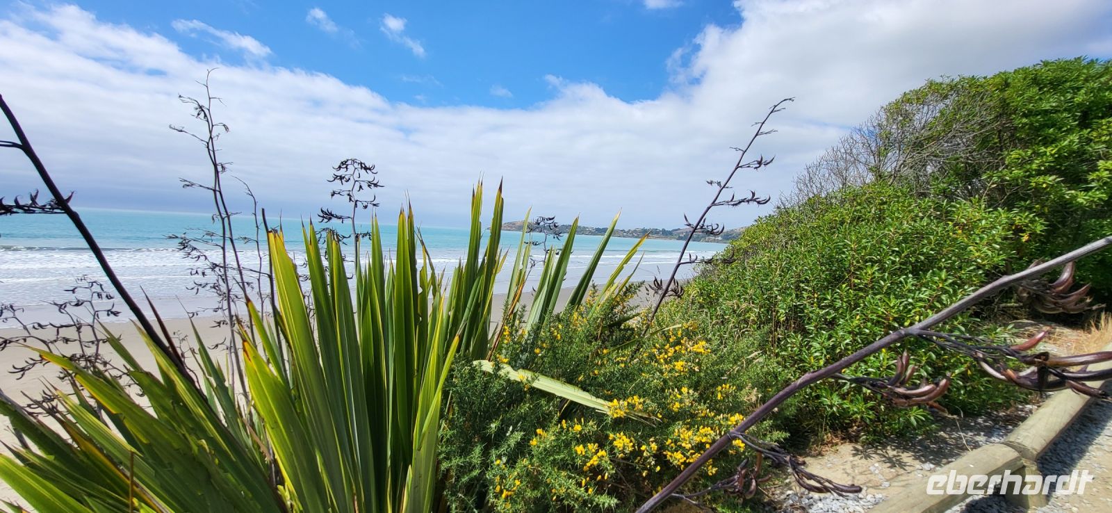 Nach einem herrlichen Frühstück im gegenüberliegenden Restaurant Pepe, machen wir uns auf, um die Coromandel-Halbinsel zu erkunden. Der heutige Tag steht im Zeichen der Strände und so erfolgt unser erster Halt am Cooks Beach. Dieser ist ein ca. 3 km langer Sandstrand der sich von der Cooks Bay bis zur Mercury Bay erstreckt und zum Baden einlädt. Von den uns begegneten Bewohnern hören wir, dass dieser beinahe täglich genauso schön leer ist, wie wir ihn heute vorfinden und lediglich an den Wochenenden von vielen Besuchern aus Auckland heimgesucht wird. So haben wir ausreichend Zeit für einen schönen Strandspaziergang oder ein kühles Bad im Pazifik. Unser Tagestrip führt uns weiter nach Hahei zum gleichnamigen Strand, von wo aus man normalerweise zur Cathedral Cove startet, deren kathedralförmiger Felsen jedoch leider einsturzgefährdet und nicht mehr betretbar ist. Somit bietet uns Hahei Beach eine unglaublich schöne Alternative und wir fühlen uns wie in der Südsee. Eine herrliche Kulisse mit tollen Wellen, sauberem Strand und anmutigen Ferienhäusern, die oberhalb der Küste stehen. Urlaubsfeeling pur und wir genießen unseren Aufenthalt in vollen Zügen. Der letzte Stopp des heutigen Reisetages erfolgt am sogenannten Hot Water Beach. Bekannt im ganzen Land ist dieser dafür, dass hier bei Ebbe Thermalwasser an die Oberfläche gelangt und man mit einem Spaten seine eigene Badewanne schaufeln kann, indem das heiße Wasser aus dem Boden strömt und man es mit kühlem Meerwasser zur passenden Temperatur mischt. Bei perfekten Bedingungen wird dieser Strandabschnitt zum dicht besiedeltsten „Sandkasten“ Neuseelands. Dieses Phänomen bleibt uns heute jedoch verwehrt, da wir bei Flut dort sind und die heißen Quellen unter Wasser liegen. Trotzdem bietet sich uns erneut eine wunderbare Kulisse und wir schauen den wenigen Surfern beim Kampf mit den Wellen zu. Schwimmen ist hier nicht ratsam, da starker Wellengang und eine immense Unterwasserströmung herrscht. Zurück in Tairua genießt jeder den Nachmittag auf seine Weise und auch das uns umgebende Meer ist zurückgekehrt.