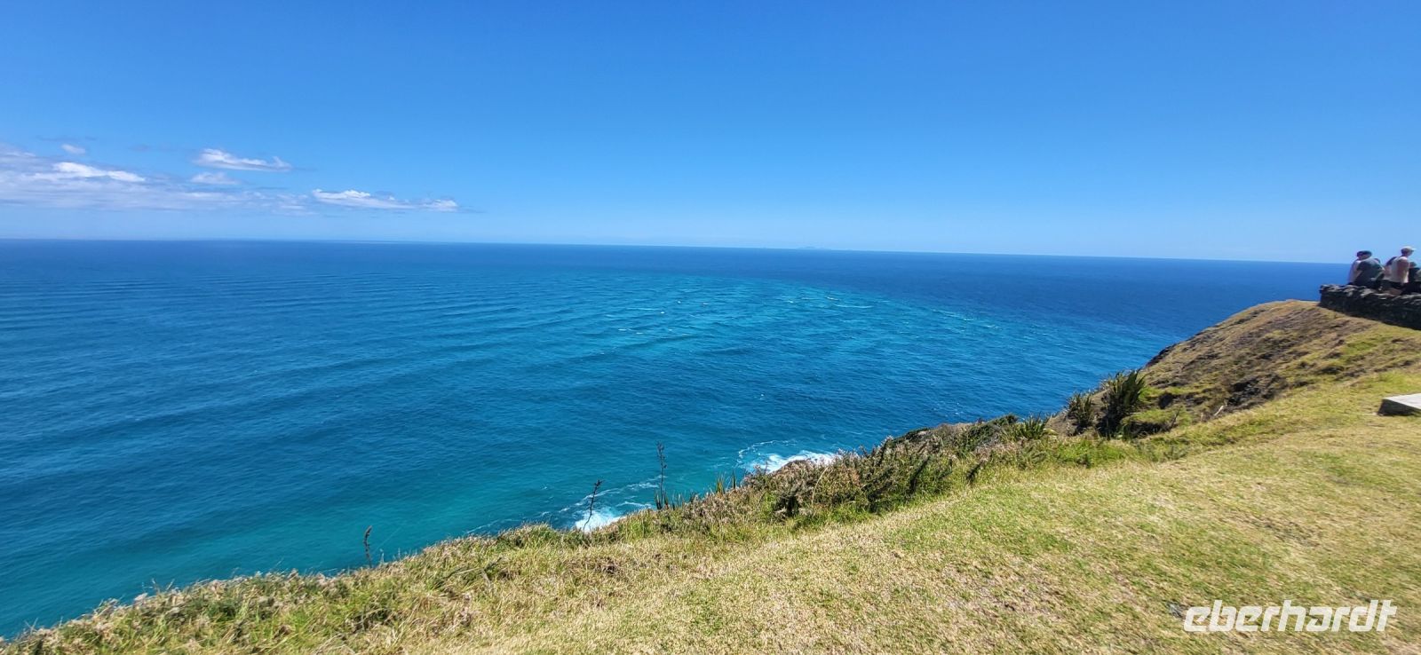 Der Großteil unserer Reisegruppe hat sich für den heutigen Tag für den Ganztagesausflug nach Cape Reinga entschlossen. So werden wir am frühen Morgen von Driverguide Liam abgeholt und mit weiteren 32 Gästen durch den Tag begleitet. Liam erklärt sehr engagiert auf Englisch die Besonderheiten unseres heutigen Programms. Einen morgendlichen Stopp für Kaffee, Toiletten und Co. legen wir in Mangonui ein. Mangonui bedeutet „großer Hai“, da dieser einst hier gesichtet wurde. Auf der Fahrt zum nördlichsten Punkt Cape Reinga passieren wir herrliche Landschaften mit Blick auf die Tasmanische See zur Linken oder dem Pazifik zur Rechten. Am sogenannten 90 Mile Beach fahren wir ein Stück mit unserem Bus direkt am weitläufigen Strand entlang und genießen dieses besondere Spektakel, welches nur bei einem knappen Zeitfenster von 3 Std. möglich ist. Somit nur bei Ebbe und Liam berichtet, dass der vermeintliche Strand eigentlich ein Küstenstreifen ist, der bei Flut wieder verschwindet. Natürlich sind wir auch zum Dünensurfen hier und halten dazu direkt davor. Mithilfe eines halben Surfbretts saust man bäuchlings die Düne hinab und klettert zu Fuß wieder nach oben. Eine große Gaudi für die aktiven Surfer und die Beobachter unten am Strand. Ein schöner Mittagsstopp erfolgt auf einem sehr idyllischen Campingplatz mit Restaurant in Houhora, wo wir einen Mittagssnack einnehmen und dazu die wunderbare Kulisse mit Blick auf den Pazifik genießen. Hier könnte man noch Stunden verweilen, wie an allen Punkten, die wir auf unserer Tagestour ansteuern. Unser Tagesziel Cape Reinga erreichen wir bei allerbesten Wetterbedingungen und selbst Guide Liam ist entzückt, dass wir diesen besonderen Ort so erleben dürfen. Wir befinden uns nun nicht nur am nördlichsten Punkt Neuseelands, sondern ebenso an einem besonders bedeutungsvollen Ort der Maori. Diese glauben, dass nach Ableben eines Maori die Seele von hier aus zu den Ahnen nach Hawaikinui übertritt. Dazu benötigt die Seele des Verstorbenen ein ganzes Jahr und erst dann wird auf das Grab ein Grabstein gesetzt. Somit erwandern wir besonders ehrfürchtig diesen besonderen Ort und spazieren den gut ausgebauten Weg zum Leuchtturm hinab. Unten angekommen, sehen wir bedingt durch die Wasserfärbung, wo die Tasmanische See und der Pazifik aufeinander treffen. Es entstehen herrliche Aufnahmen und Eindrücke, die unvergessen bleiben. Bevor wir am späten Nachmittag nach Paihia zurückkehren, halten wir am Kauri Kingdom Museum, wo ein 50000 Jahre alter Kauri-Baumstumpf ausgestellt ist. Welch ein Anblick dieses riesigen Stammes, der einst im Sumpf gefunden wurde. Zurück am Ausgangspunkt unseres Ausflugs sind wir uns einig, es war ein einmaliger Tag und ein Ausflug, den niemand hätte missen wollen.