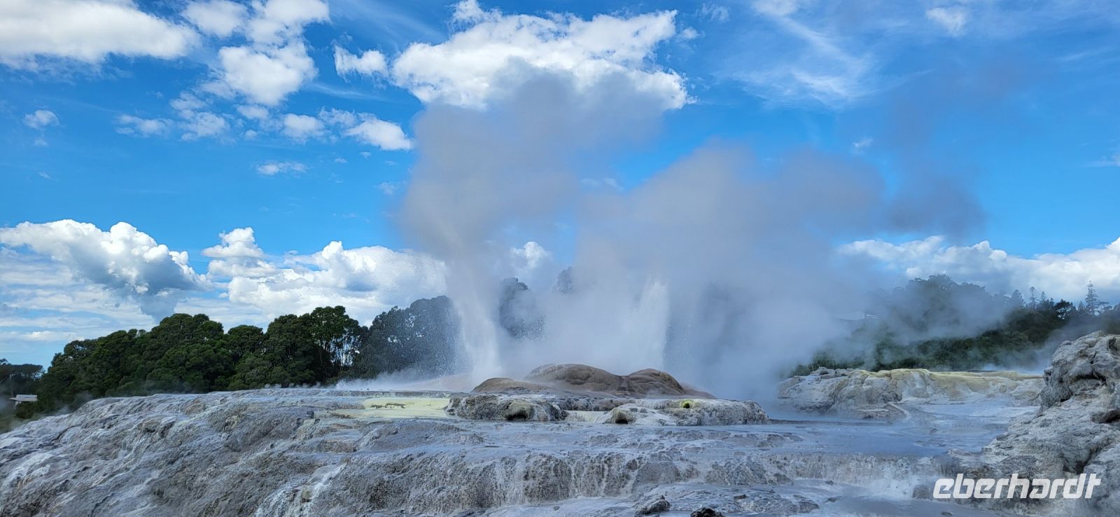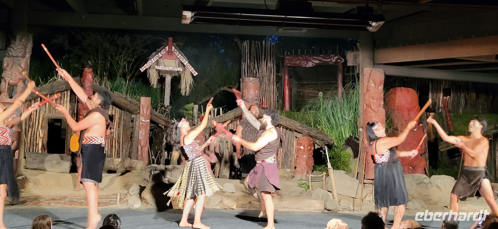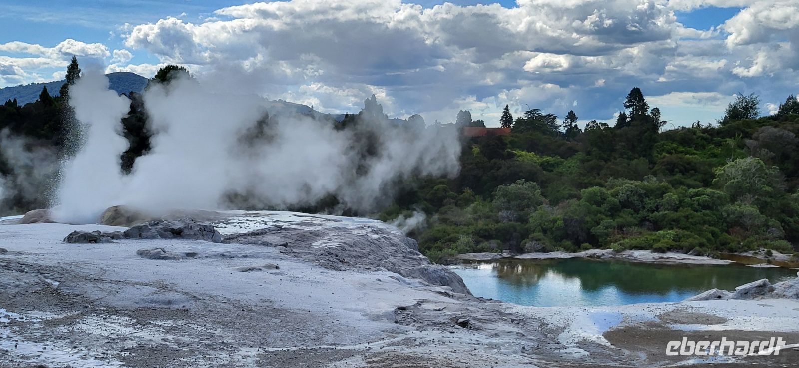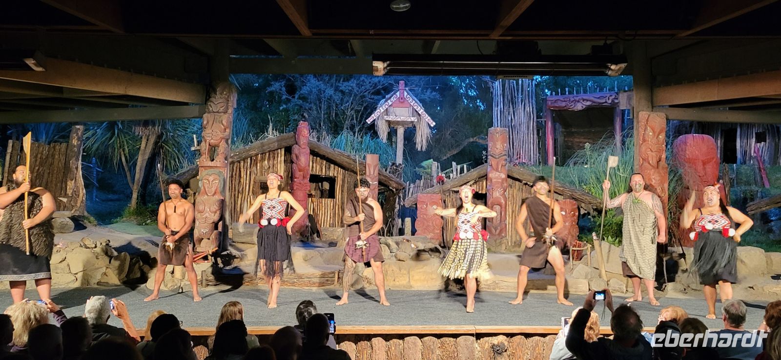Wir verlassen Tairua und folgen der Coromandel Halbinsel weiter südlich Richtung Rotorua. Rotorua bekannt für seine schwefelhaltigen Quellen, wird auch scherzhaft „rotten Rua“ genannt, was so viel wieder verdorben aufgrund des besonderen Geruchs bedeutet und bereits seit 1880 bekannt ist. Vorher erreichen wir jedoch das Filmset von Hobbiton, wo die gebuchten Gäste eine 2-stündige Führung erleben und per Transport zum Tagesziel nach Rotorua, der Thermalstadt, gebracht werden. Die restlichen Gäste bleiben bei Roger und mir und fahren zu einer neu gebauten Kiwi Aufzuchtstation, wo viel Wissenswertes zum Nationalvogel Neuseelands vermittelt wird. Vom nachtaktiven Kiwi gab es einst mehrere Millionen, dessen Population heute auf 60.-70.000 Tiere reduziert ist. Bedroht sind die flugunfähigen Vögel durch mit den Siedlern eingeführte Tiere wie Hunde, Katzen, Schweine, Igel, Wiesel und Possums, die entweder die Eier oder die Vögel selbst rauben. Da in freier Natur nur ca. 5 % der Jungtiere überleben, entschied man sich für eine Aufzuchtstation, um somit einen Zuwachs der Population zu bewirken. Das ganze Projekt finanziert sich durch Eintrittsgelder und Spenden, denn auf diesem Weg konnten bereits 2000 der bis zu 50 Jahre alt werdenden Tiere aufgezogen und wieder ausgewildert werden. Hier erfahren wir durch Guide André viel Interessantes über diese unglaublichen Tiere und sehen dazu ein Jungtier, welches kurz vor unserer Ankunft geschlüpft ist. Abends fahren die meisten von uns zu Mitai Maori Village, um am kulturellen Abend teilzunehmen. Hier sehen wir den Nachbau eines ehemaligen Maori Dorfes, mit Sitten und Gebräuchen, Musik und Tanz, sowie dem beeindruckenden Haka. Der Haka ist ein uralter Kriegstanz der Maori, der traditionellerweise auf dem Schlachtfeld wie auch beim friedlichen Zusammentreffen verschiedener Gruppen getanzt wurde und immer noch wird. Im Anschluss findet das Abendessen statt, bei dem neben Huhn und Lamm, Kumara (Süßkartoffeln), Salat vom Buffet angeboten werden. Nach einem kurzen Spaziergang in der Dunkelheit auf Glühwürmchensuche fahren wir wieder mit unserem bunten Gefährt zurück nach Rotorua und fallen nach einem mehr als erlebnisreichen Tag in unsere Federn.