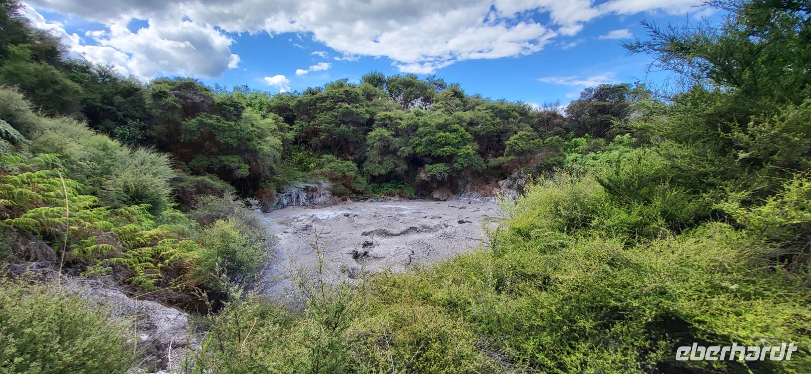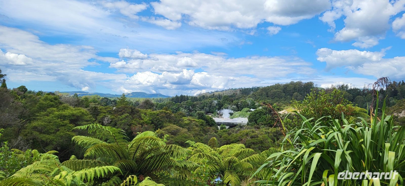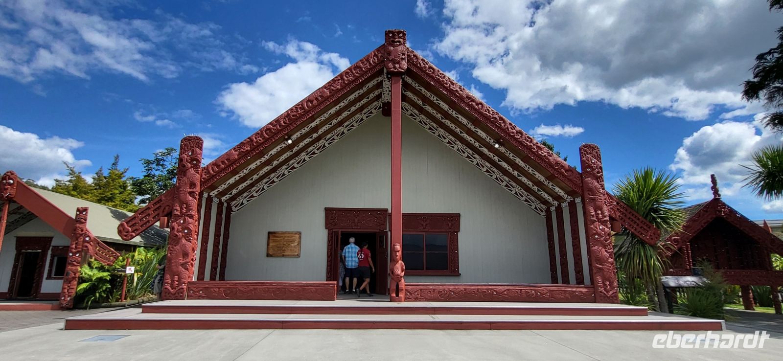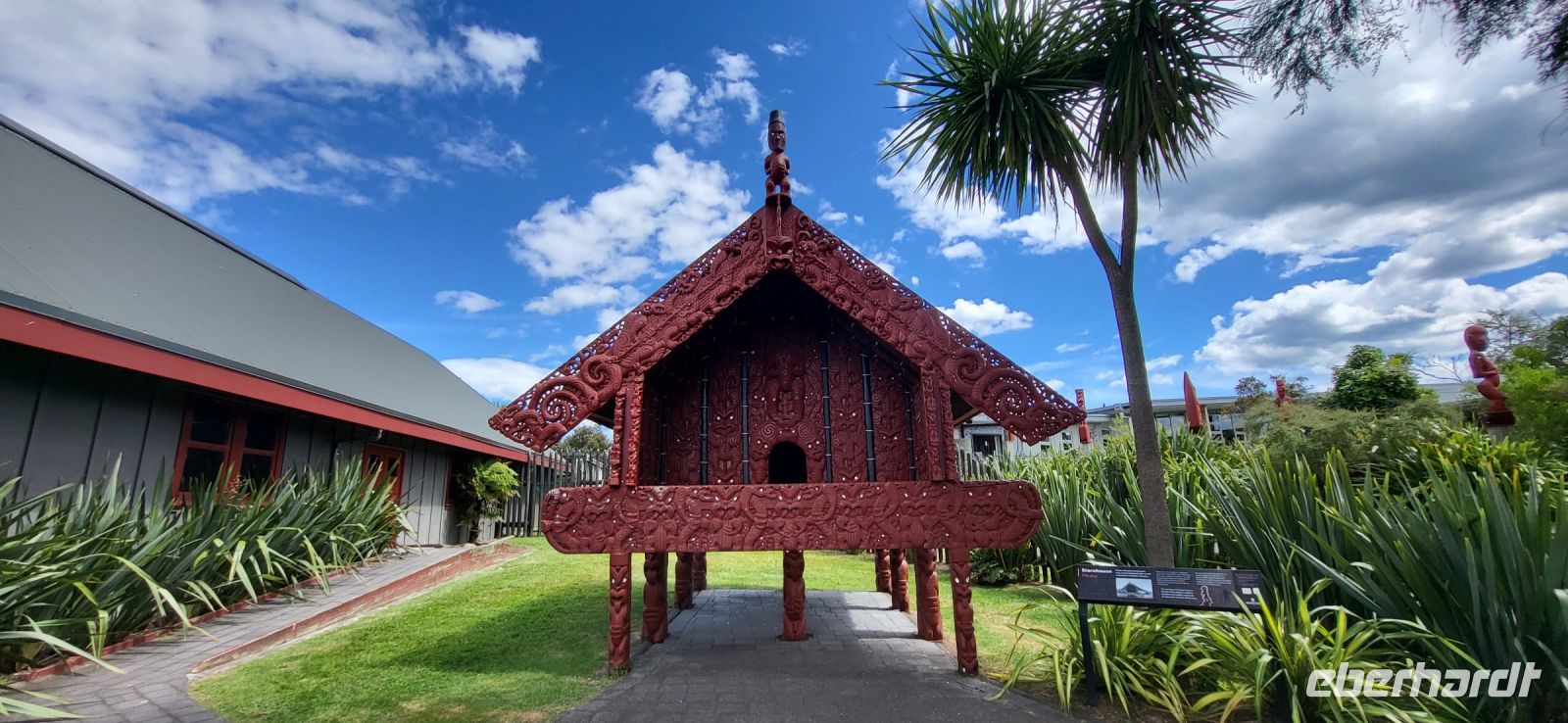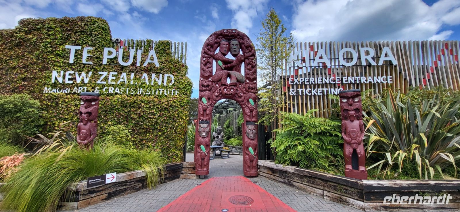 Wir verlassen Tairua und folgen der Coromandel Halbinsel weiter südlich Richtung Rotorua. Rotorua bekannt für seine schwefelhaltigen Quellen, wird auch scherzhaft „rotten Rua“ genannt, was so viel wieder verdorben aufgrund des besonderen Geruchs bedeutet und bereits seit 1880 bekannt ist. Vorher erreichen wir jedoch das Filmset von Hobbiton, wo die gebuchten Gäste eine 2-stündige Führung erleben und per Transport zum Tagesziel nach Rotorua, der Thermalstadt, gebracht werden. Die restlichen Gäste bleiben bei Roger und mir und fahren zu einer neu gebauten Kiwi Aufzuchtstation, wo viel Wissenswertes zum Nationalvogel Neuseelands vermittelt wird. Vom nachtaktiven Kiwi gab es einst mehrere Millionen, dessen Population heute auf 60.-70.000 Tiere reduziert ist. Bedroht sind die flugunfähigen Vögel durch mit den Siedlern eingeführte Tiere wie Hunde, Katzen, Schweine, Igel, Wiesel und Possums, die entweder die Eier oder die Vögel selbst rauben. Da in freier Natur nur ca. 5 % der Jungtiere überleben, entschied man sich für eine Aufzuchtstation, um somit einen Zuwachs der Population zu bewirken. Das ganze Projekt finanziert sich durch Eintrittsgelder und Spenden, denn auf diesem Weg konnten bereits 2000 der bis zu 50 Jahre alt werdenden Tiere aufgezogen und wieder ausgewildert werden. Hier erfahren wir durch Guide André viel Interessantes über diese unglaublichen Tiere und sehen dazu ein Jungtier, welches kurz vor unserer Ankunft geschlüpft ist. Abends fahren die meisten von uns zu Mitai Maori Village, um am kulturellen Abend teilzunehmen. Hier sehen wir den Nachbau eines ehemaligen Maori Dorfes, mit Sitten und Gebräuchen, Musik und Tanz, sowie dem beeindruckenden Haka. Der Haka ist ein uralter Kriegstanz der Maori, der traditionellerweise auf dem Schlachtfeld wie auch beim friedlichen Zusammentreffen verschiedener Gruppen getanzt wurde und immer noch wird. Im Anschluss findet das Abendessen statt, bei dem neben Huhn und Lamm, Kumara (Süßkartoffeln), Salat vom Buffet angeboten werden. Nach einem kurzen Spaziergang in der Dunkelheit auf Glühwürmchensuche fahren wir wieder mit unserem bunten Gefährt zurück nach Rotorua und fallen nach einem mehr als erlebnisreichen Tag in unsere Federn.