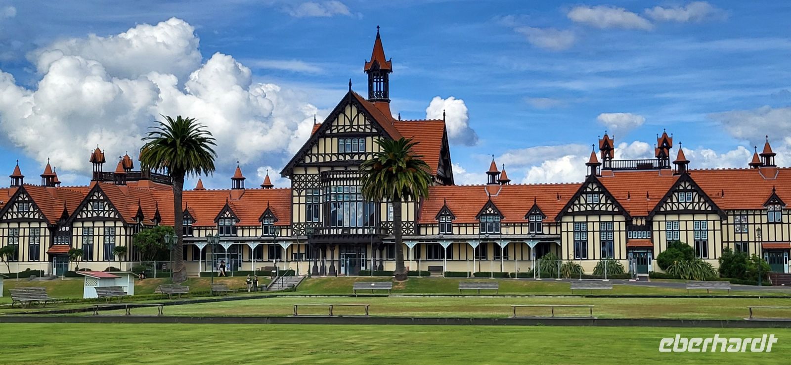 Heute erfolgt unsere letzte Etappe auf der Nordinsel und nach einem guten Frühstück verlassen wir die Region erstmalig seit unserer Ankunft auf der Nordinsel-bei Regen. Richtung Neuseelands Hauptstadt Wellington passieren wir so manch kuriosen Ort, wie beispielsweise Taihape, der als Wahrzeichen einen Gummistiefel hat und hier alljährlich das Gummistiefelweitwerfen stattfindet. Der aktuelle Rekord liegt momentan wohl bei 65 m. Weiter geht es durch „Bulls“, ein Ort, der nach Joseph Bulls benannt wurde und wo die landesweit größte Molkerei ansässig ist. Somit wohl der einzige Platz Neuseelands, wo man vom Bullen Milch bekommt. Vom Mülleimer bis hin zur Polizeistation findet sich stets das Thema Rindvieh wieder … Unser Tagesziel Wellington ist nicht nur als Erdbebenhauptstadt, sondern auch als „die windige Stadt“ bekannt ist und hier selbst der Radiosender „Radio Windy“ heißt. Es befinden sich hier sämtliche Ämter, das Parlament, welches aufgrund seines Designs scherzhaft „Bienenkorb“ genannt wird, der Hafen und auch ein recht waghalsiger Flughafen. Benannt wurde die Hauptstadt nach dem Duke von Wellington, der bekannt für seine Gummigamaschen und somit der Erfinder des Gummistiefels war. So wurden die ersten Schuhe dieser Art auch „Wellingtons“ genannt. Nach unserer Ankunft genießen wir zunächst die Aussicht vom Mount Victoria, welcher sich auf 200 m Höhe befindet. Von hier haben wir einen tollen 360° Ausblick über die um uns herum liegende Bucht und können somit die Dimensionen so richtig begreifen. Auf unserer Stadtrundfahrt sehen wir u.a. das Sky Stadion, den Hafen, den Hauptbahnhof, das Zollgebäude, das Bienenkorb-Parlament, den Obersten Gerichtshof, die Nationalbücherei und begeben uns dann zu unserem Hotel. Nun kann jeder den restlichen Nachmittag frei nutzen und nach Lust und Laune die Stadt in Eigenregie erkunden. So manche zieht es in den Botanischen Garten, fahren per Zahnradbahn nach oben und spazieren durch die herrliche Anlage, die über den Friedhof zurück in die City und direkt zum Parlament/Bienenkorb, führt. Abends finden wir uns zum Abendessen wieder im West Plaza Hotel ein und speisen genüsslich in ungewöhnlichem Ambiente. Die Sitzung ist hiermit geschlossen …