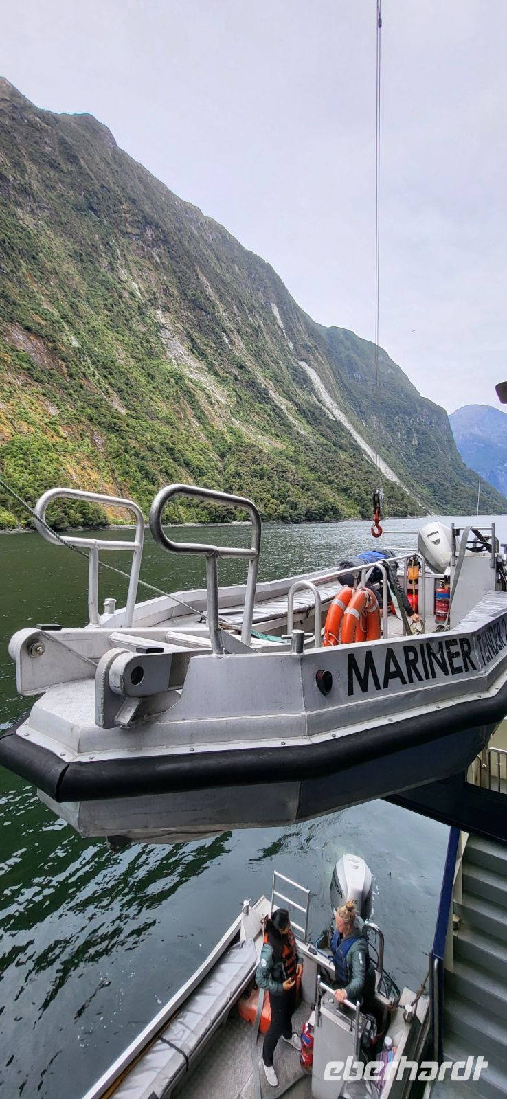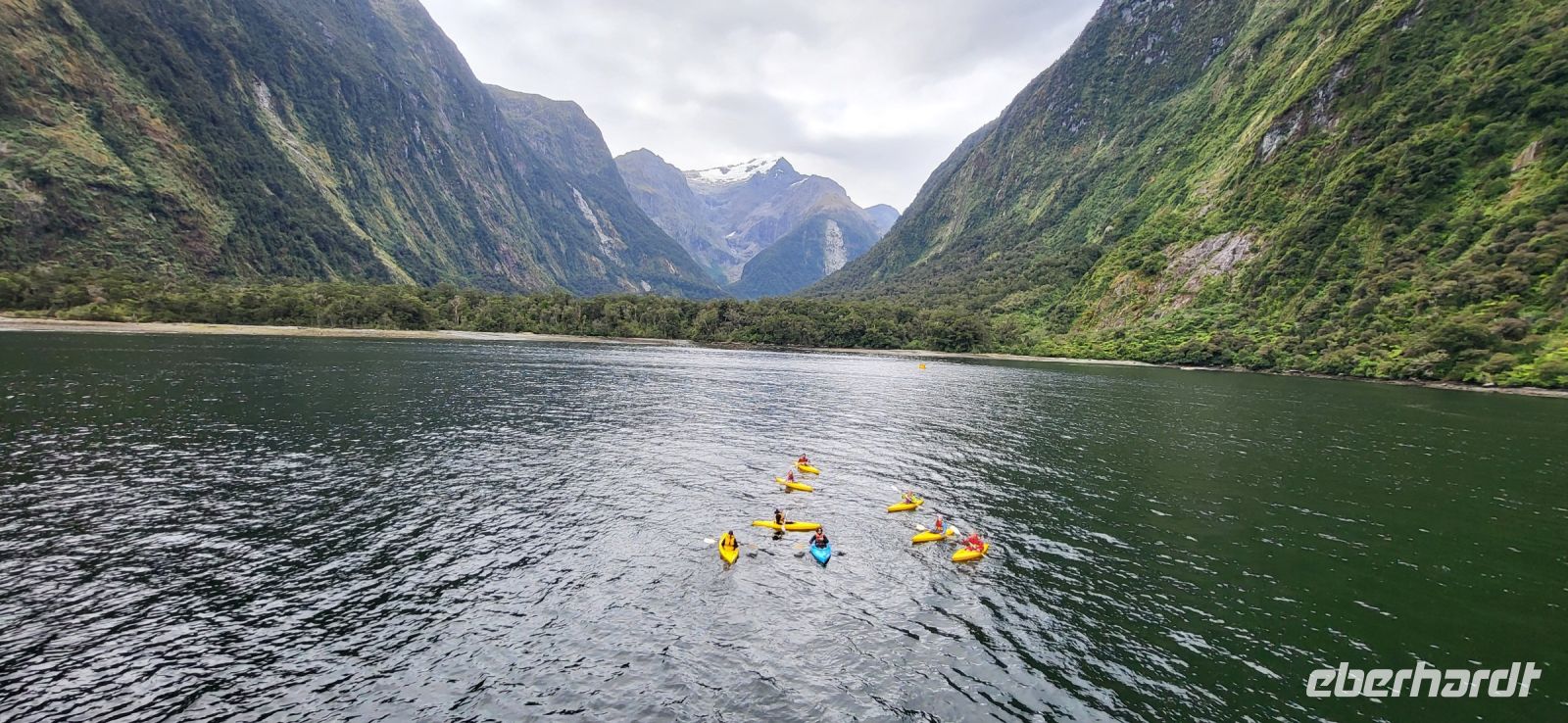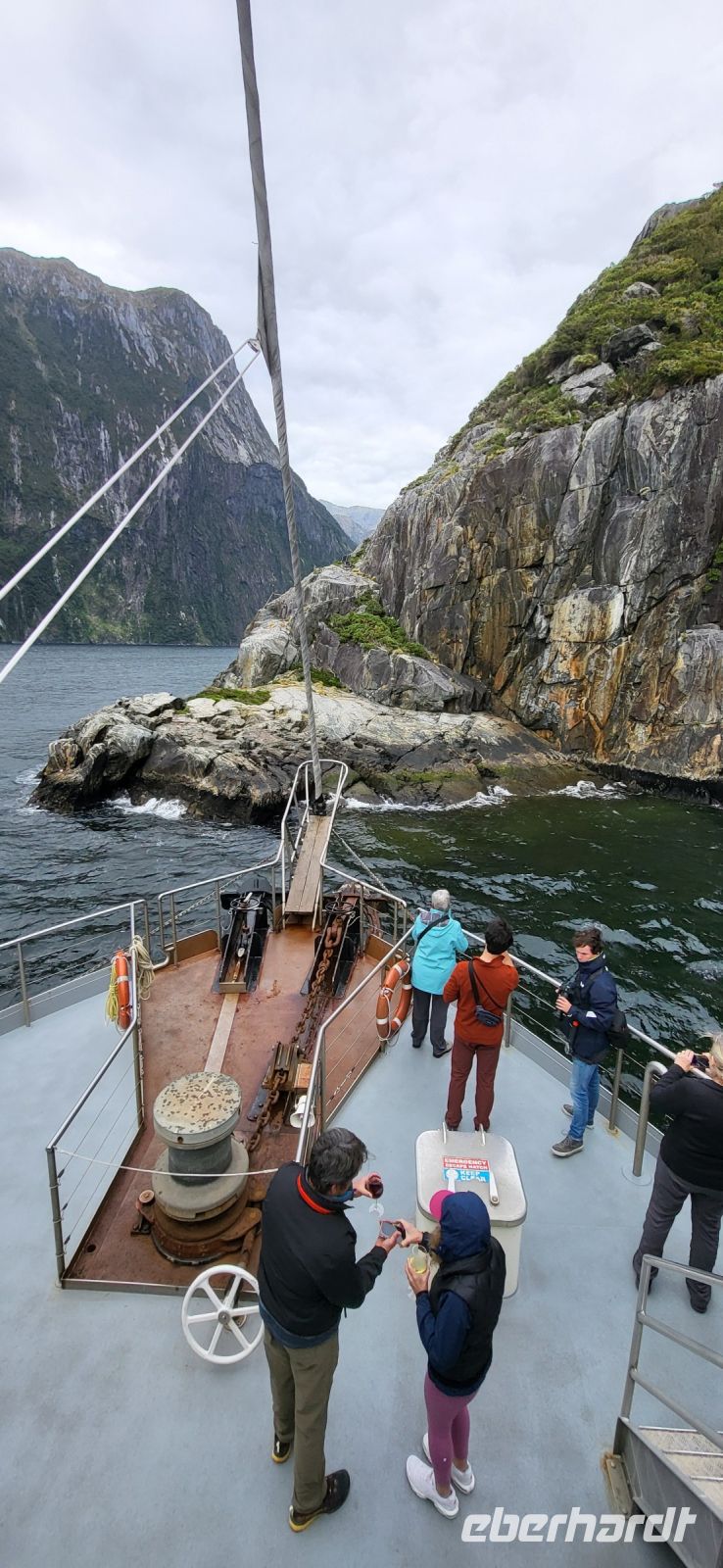 Wir verlassen Dunedin noch im Morgengrauen bei herrlichem Wetter und kühlen 11 Grad. Auf geht’s zu unserem Tagesziel-dem berühmten Fjord Milford Sound, der alljährlich bis zu 2 Millionen Besucher anzieht. Dieser liegt an der Westküste der Südinsel Neuseelands, welche mit nur 45.000 Einwohnern sehr dünn besiedelt ist. Der Fjord, mit 14 km Länge und ca. 300 m Tiefe, wurde von seinem Entdecker John Grono im Jahre 1823 nach der walisischen Küste Milford Haven benannt. Ein Vormittagsstopp erfolgt im Farmversorgungsstädtchen Gore, welches als „Bachforellenangelhauptstadt der Welt“ gilt und zu deren Ehre eine riesige Forelle am Ortseingang die Besucher willkommen heißt. Wir genießen einen schmackhaften Kaffee, suchen die Örtlichkeiten mit Dach auf und vertreten uns ein wenig die Füße. Wie immer vergeht die Fahrt sehr unterhaltsam und so bringt uns Roger viel Wissenswertes über Neuseeland näher. Entlang unserer Strecke sieht man auch einige Wildfarmen mit Rotwild und Waipiti Hirschen. Diese fressen so gehalten lediglich Gras und verlieren somit ihren intensiven Wildgeschmack, der auf der natürlichen Ernährung beruht, indem sie auch Blätter und Rinden, was ein Wald eben sonst noch bietet, verspeisen. Wir hören von den neuseeländischen Vogelarten wie dem Kea, ein Gebirgspapagei, der Waldhenne und dem Takahe. Unsere Mittagspause erfolgt in Te Anau mit gleichnamigem See, was übersetzt so viel wie „Meer der Tränen“ bedeutet, 417 m tief ist und als größter See der Südinsel bezeichnet wird. Mit rund 500 km Wanderwege in der Umgebung gilt Te Anua als „Wanderhauptstadt“ Neuseelands. Als bekanntester Wanderweg mit 59 km Länge zieht der Milford Track jährlich zahlreiche Wanderfreudige an. Von hier aus geht es in den Nationalpark, wo wir am Eglinton Valley, einem der Drehorte zu Herr der Ringe vorbeiziehen, wo einst einige Schlachtszenen gedreht wurden. Die riesige Ebene umrahmt von Bergen lässt so manchen im Kino Gesehenes wieder aufleben. Anschließend halten wir noch am sogenannten Spiegelsee und es entstehen herrliche Landschaftsaufnahmen. Pünktlich erreichen wir die Anlagestelle, an der die Milford Mariner bereits auf uns wartet. Mit weiteren Gästen sind wir 55 Personen, die nun das Schiff exklusiv für sich haben und die Reise kann beginnen. Wir fahren in den Fjord hinein zu einem sehr imposanten Wasserfall, an dem wir erst mal eine Schiffstaufe erleben. In einer ruhigen Bucht ankernd, dürfen wir zu Wasser. Sei es zu einer geführten Kajaktour oder in einem der beiden Beiboote um uns die nähere Umgebung anzuschauen. Wer das nicht möchte, genießt einfach die traumhafte Kulisse an Deck und es fühlt sich an, als hätten wir das Schiff nun komplett für uns alleine. Am Abend erhalten wir ein reichhaltiges Buffet und mit viel Humor informiert uns die Crew über Ablauf und Speisen. Abschließend können wir noch an einem 30-minütigen Diavortrag teilnehmen, wo schöne Impressionen über den Fjord, Flora und Fauna gezeigt und erklärt werden. In der ruhigen Bucht, in der wir vor Anker liegen, ruht es sich herrlich und so fallen wir bald in einen wohlverdienten Schlaf.