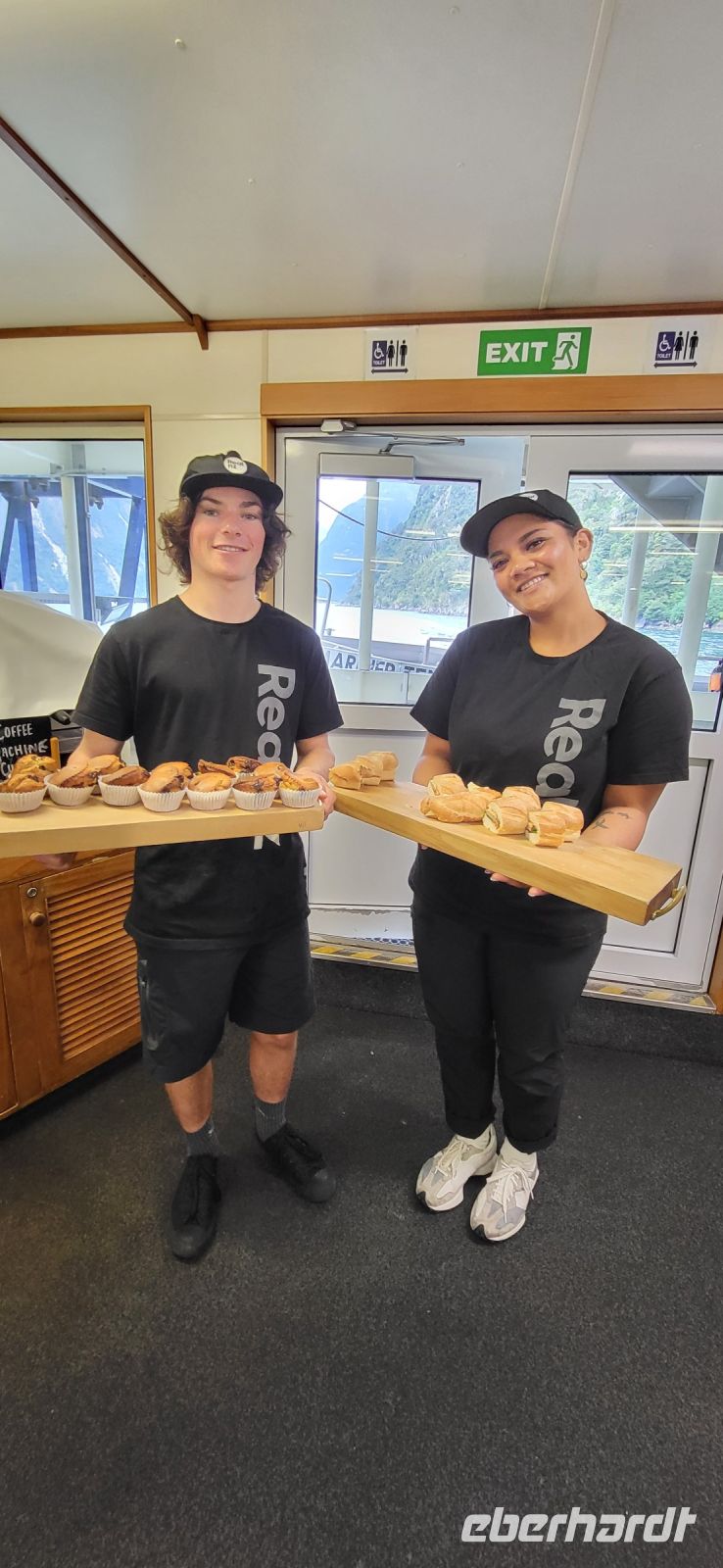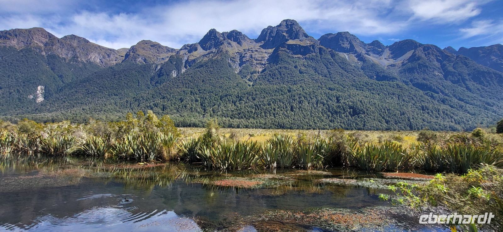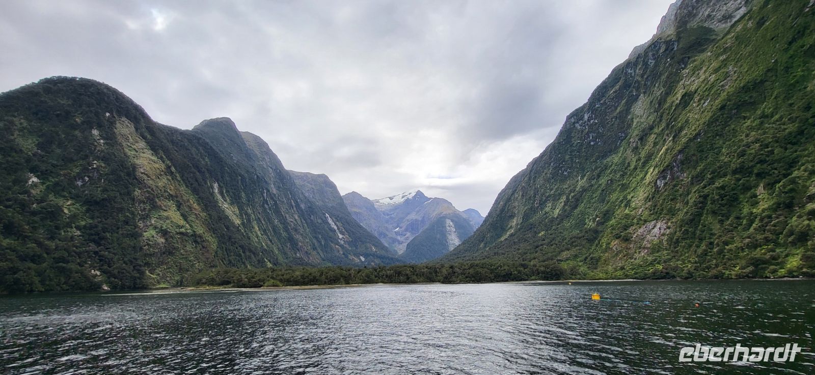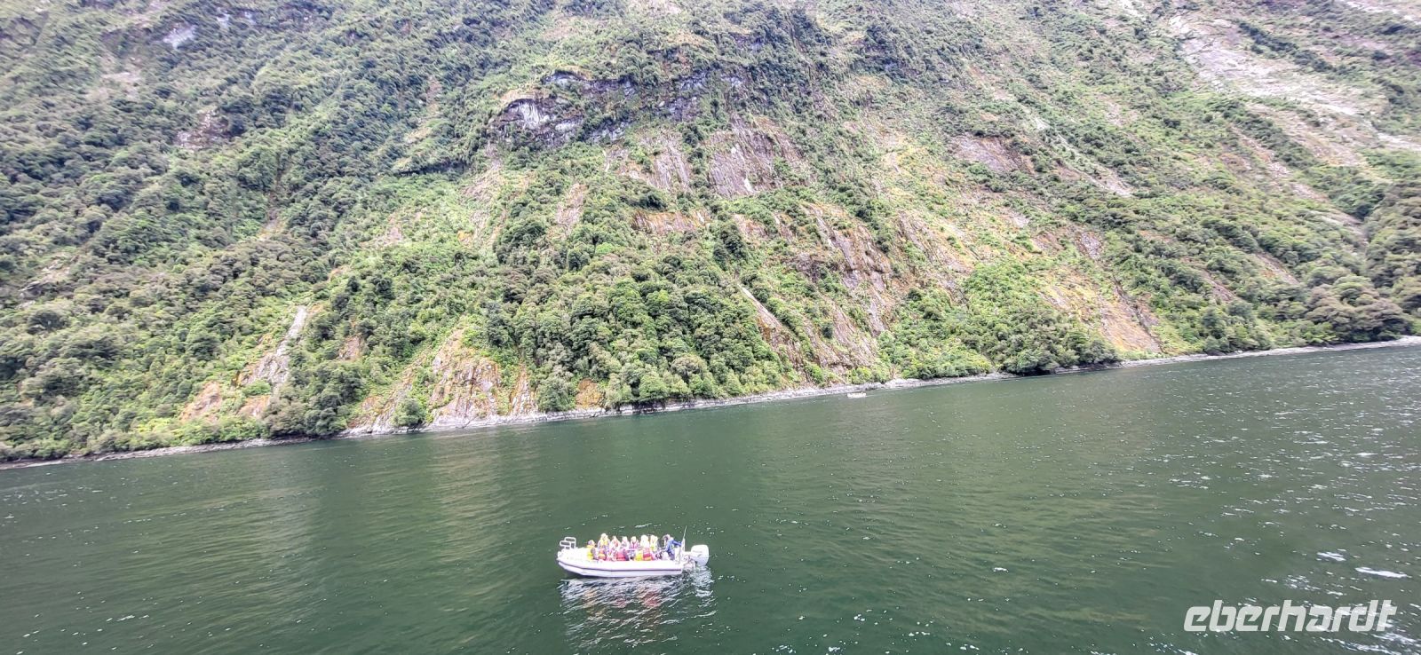 Wir verlassen Dunedin noch im Morgengrauen bei herrlichem Wetter und kühlen 11 Grad. Auf geht’s zu unserem Tagesziel-dem berühmten Fjord Milford Sound, der alljährlich bis zu 2 Millionen Besucher anzieht. Dieser liegt an der Westküste der Südinsel Neuseelands, welche mit nur 45.000 Einwohnern sehr dünn besiedelt ist. Der Fjord, mit 14 km Länge und ca. 300 m Tiefe, wurde von seinem Entdecker John Grono im Jahre 1823 nach der walisischen Küste Milford Haven benannt. Ein Vormittagsstopp erfolgt im Farmversorgungsstädtchen Gore, welches als „Bachforellenangelhauptstadt der Welt“ gilt und zu deren Ehre eine riesige Forelle am Ortseingang die Besucher willkommen heißt. Wir genießen einen schmackhaften Kaffee, suchen die Örtlichkeiten mit Dach auf und vertreten uns ein wenig die Füße. Wie immer vergeht die Fahrt sehr unterhaltsam und so bringt uns Roger viel Wissenswertes über Neuseeland näher. Entlang unserer Strecke sieht man auch einige Wildfarmen mit Rotwild und Waipiti Hirschen. Diese fressen so gehalten lediglich Gras und verlieren somit ihren intensiven Wildgeschmack, der auf der natürlichen Ernährung beruht, indem sie auch Blätter und Rinden, was ein Wald eben sonst noch bietet, verspeisen. Wir hören von den neuseeländischen Vogelarten wie dem Kea, ein Gebirgspapagei, der Waldhenne und dem Takahe. Unsere Mittagspause erfolgt in Te Anau mit gleichnamigem See, was übersetzt so viel wie „Meer der Tränen“ bedeutet, 417 m tief ist und als größter See der Südinsel bezeichnet wird. Mit rund 500 km Wanderwege in der Umgebung gilt Te Anua als „Wanderhauptstadt“ Neuseelands. Als bekanntester Wanderweg mit 59 km Länge zieht der Milford Track jährlich zahlreiche Wanderfreudige an. Von hier aus geht es in den Nationalpark, wo wir am Eglinton Valley, einem der Drehorte zu Herr der Ringe vorbeiziehen, wo einst einige Schlachtszenen gedreht wurden. Die riesige Ebene umrahmt von Bergen lässt so manchen im Kino Gesehenes wieder aufleben. Anschließend halten wir noch am sogenannten Spiegelsee und es entstehen herrliche Landschaftsaufnahmen. Pünktlich erreichen wir die Anlagestelle, an der die Milford Mariner bereits auf uns wartet. Mit weiteren Gästen sind wir 55 Personen, die nun das Schiff exklusiv für sich haben und die Reise kann beginnen. Wir fahren in den Fjord hinein zu einem sehr imposanten Wasserfall, an dem wir erst mal eine Schiffstaufe erleben. In einer ruhigen Bucht ankernd, dürfen wir zu Wasser. Sei es zu einer geführten Kajaktour oder in einem der beiden Beiboote um uns die nähere Umgebung anzuschauen. Wer das nicht möchte, genießt einfach die traumhafte Kulisse an Deck und es fühlt sich an, als hätten wir das Schiff nun komplett für uns alleine. Am Abend erhalten wir ein reichhaltiges Buffet und mit viel Humor informiert uns die Crew über Ablauf und Speisen. Abschließend können wir noch an einem 30-minütigen Diavortrag teilnehmen, wo schöne Impressionen über den Fjord, Flora und Fauna gezeigt und erklärt werden. In der ruhigen Bucht, in der wir vor Anker liegen, ruht es sich herrlich und so fallen wir bald in einen wohlverdienten Schlaf.