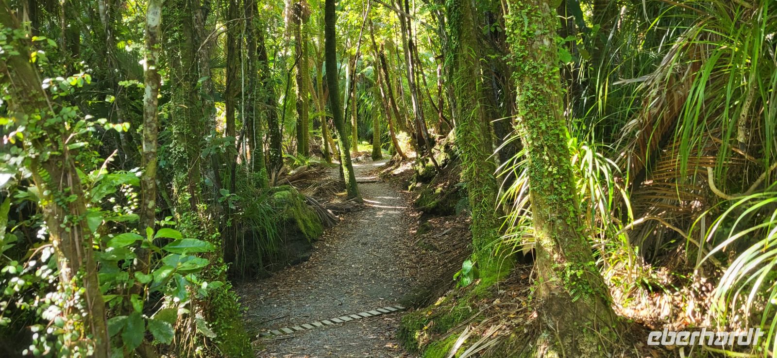 Am frühen Morgen führt unser erster Halt des heutigen Tages in das historische Goldgräberstädtchen Arrowtown. Da wir bereits zeitig im Ort sind, erleben wir die unter Denkmalschutz stehende Hauptstraße noch menschenleer. Es gibt viele schöne Läden anzuschauen, die sich in historischen Bauten von 1860 befinden und einen guten Eindruck vermitteln, wie es hier einst in Zeiten des Goldrausches ausgesehen hat. Unserer Fahrt zum Tagesziel Fox führt uns zum beeindruckenden See Lake Wanaka mit gleichnamigem Ort, wo wir eine Mittagspause einlegen. Entlang des Lake Hawea, der nur durch einen schmalen Landstreifen vom Lake Wanaka getrennt ist, geht die Reise weiter. Bei einem Fotostopp passiert unserem Fahrer leider ein Missgeschick, bei kurzem Check des Kofferraums legt dieser den Busschlüssel hinein, schließt die Klappe, die nun verschlossen ist mitsamt Busschlüssel. Somit eine Weiterfahrt erst mal unmöglich. Mit vielen vereinten Kräften, Ideen, probieren-gelingt es unserem Helden des Tages mithilfe einer Büroklammer das Kofferraumschloss zu öffnen und die Situation zu retten. Wir alle haben den Stein plumpsen gehört, der uns allen und insbesondere unserem Fahrer vom Herzen fiel. Ende gut-alles gut! Weiter geht's den Haast Pass entlang und bald befinden wir uns auf 580 m Höhe und nach dessen Überquerung und Passieren des Haast Flusses wechseln wir zur Westcoast, die auch Nass-oder Regenbogenküste genannt wird. Die Westküste gilt als die am dünn besiedelte Region Neuseelands und deren Bewohner (Coaster genannt) gelten als besonders hartgesotten. Hier lebt man vom Kohle-und Jadeabbau sowie Fischfang. Es umgibt uns eine unwirkliche Natur, Berge um uns herum, die alle von oben bis unten komplett bewaldet sind. Man fühlt sich erneut in einem komplett anderen Land. Am Nachmittag erreichen wir das verschlafene Örtchen Fox, in dem sich alles rund um die Helikopterflüge zu den Gletschern dreht. Bedingt durch die kurzfristige Wetteränderung wurden unsere vorbestellten Flüge auf den morgigen Tag verschoben. Einige von uns zieht es in den nah gelegenen Regenwald. Schon kurz abseits der Straße befinden wir uns in einer anderen Welt. Alles dicht bewachsen, Moos, Flechten, Baumfarne weit und breit, ein wunderbarer Streifzug durch unberührte Natur. Abends kehren wir im Heartland Hotel gegenüber ein und erhalten erneut ein sehr schmackhaftes Abendessen und so endet ein erneut erlebnisreicher, wenn auch aufregenden Tag in netter Runde.