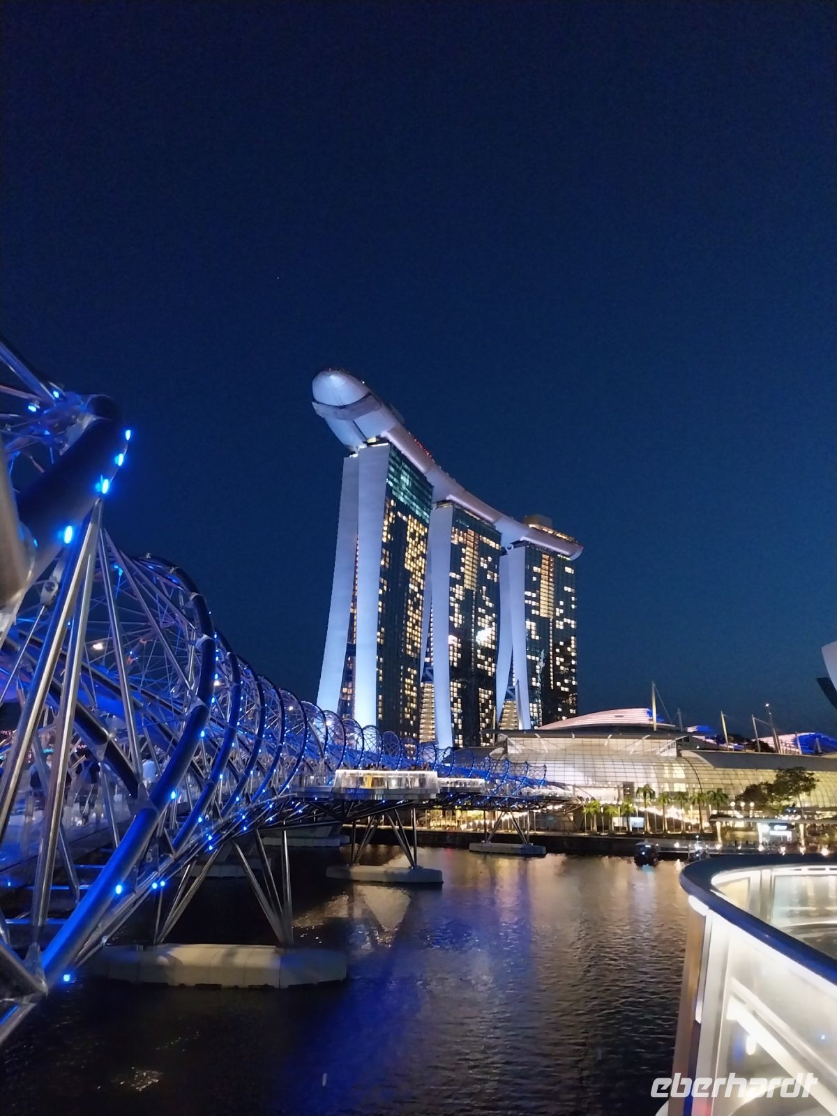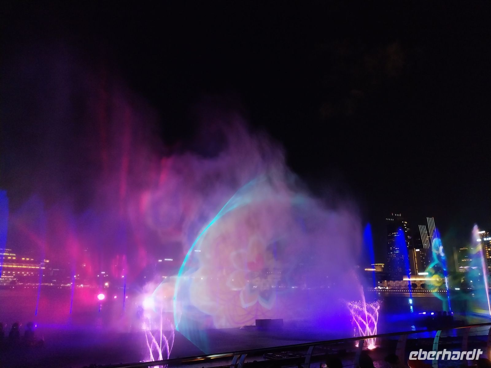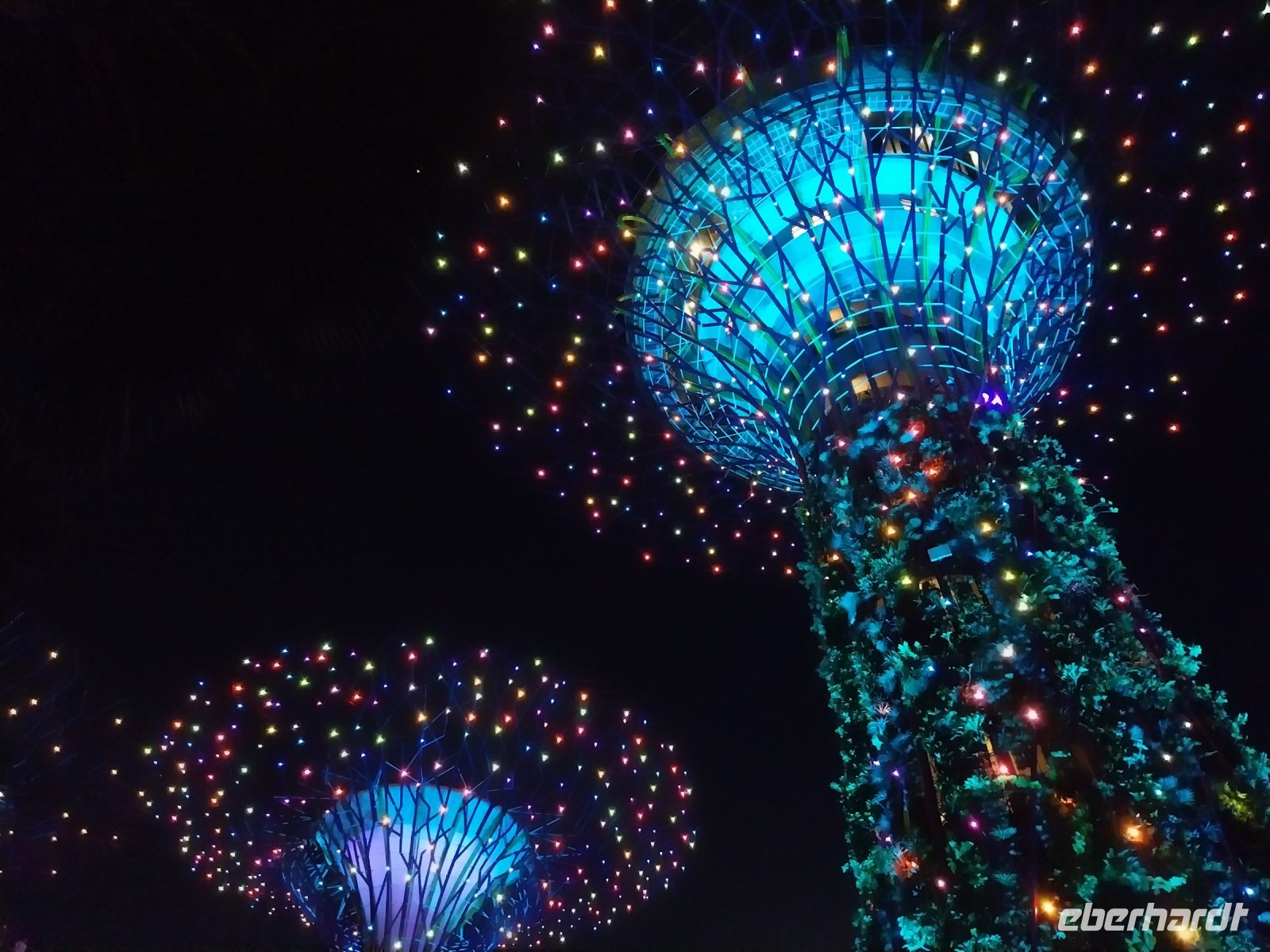 Nach einer kurzen Pause gingen wir zu Fuß entlang des War Memorials und über die Helix-Brücke zum Marina Bay Sands Hotel. Pünktlich um 20 Uhr erreichten wir dieses und sahen die Spectra - A Light and Water Show. Anschließend spazierten wir zu den Supertrees und sahen die dortige Garden Rhapsody Show.