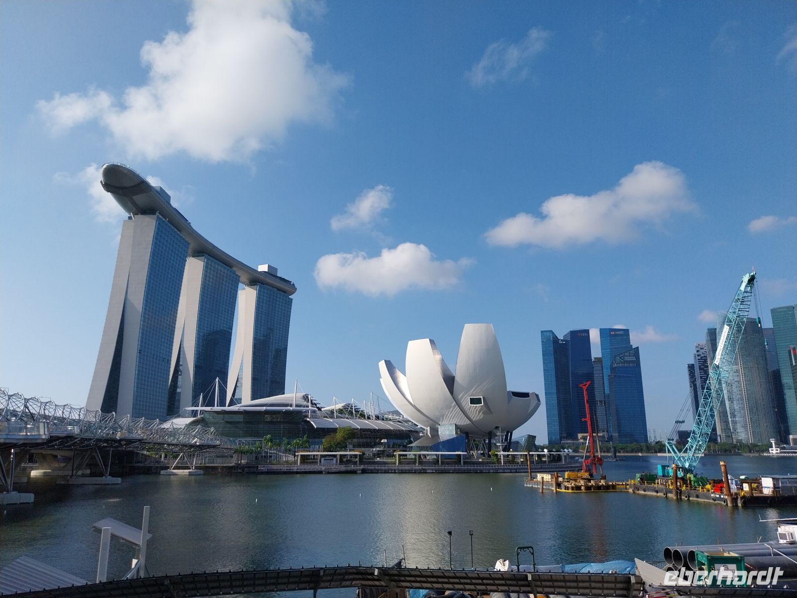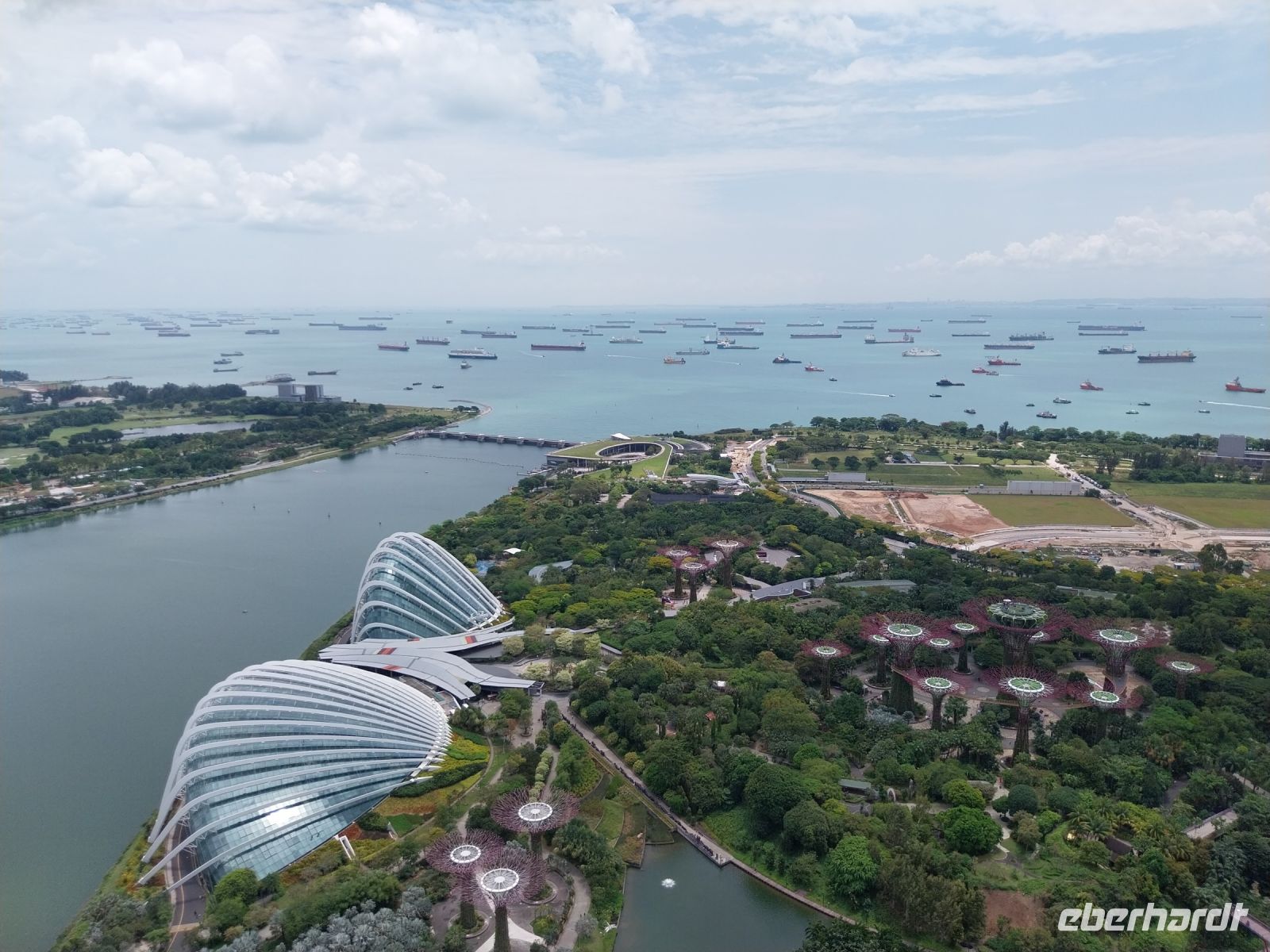 Zunächst fuhren wir wieder zum Marina Bay Sands Hotel, diesmal jedoch per Lift zur Aussichtsplattform. Wir genossen den tollen Blick auf die Hochhäuser, die Marina Barrage und auf das Meer mit seinen zahlreichen auf Reede liegenden Schiffen.