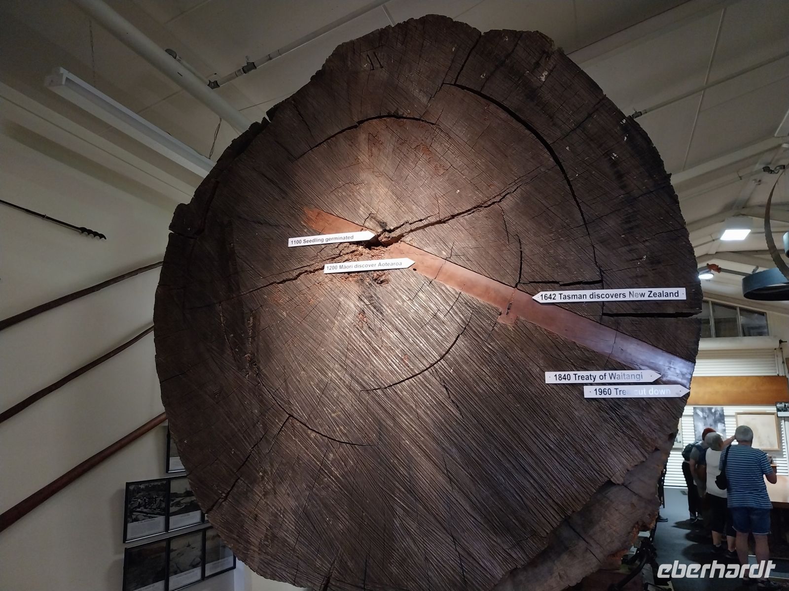 Heute stand ein langer, aber interessanter Fahrtag bevor. Erstes Ziel des Tages war Matakohe mit seinem Kauri-Museum. Hier waren zahlreiche Erzeugnisse, z. B. Möbel, der versteinerte Harz sowie ein altes Sägewerk ausgestellt. Auch ein Querschnitt eines ca. 860 Jahre alten Kauribaumes war zu sehen. Inga fuhr uns weiter in den Waipoua-Wald, welcher noch seine ursprüngliche Urwald-Vegetation aufweist. Wir besuchten den zweitältesten und zweitgrößten Kauri-Baum, den bis zu 2000 Jahre alten Tane Mahuta.