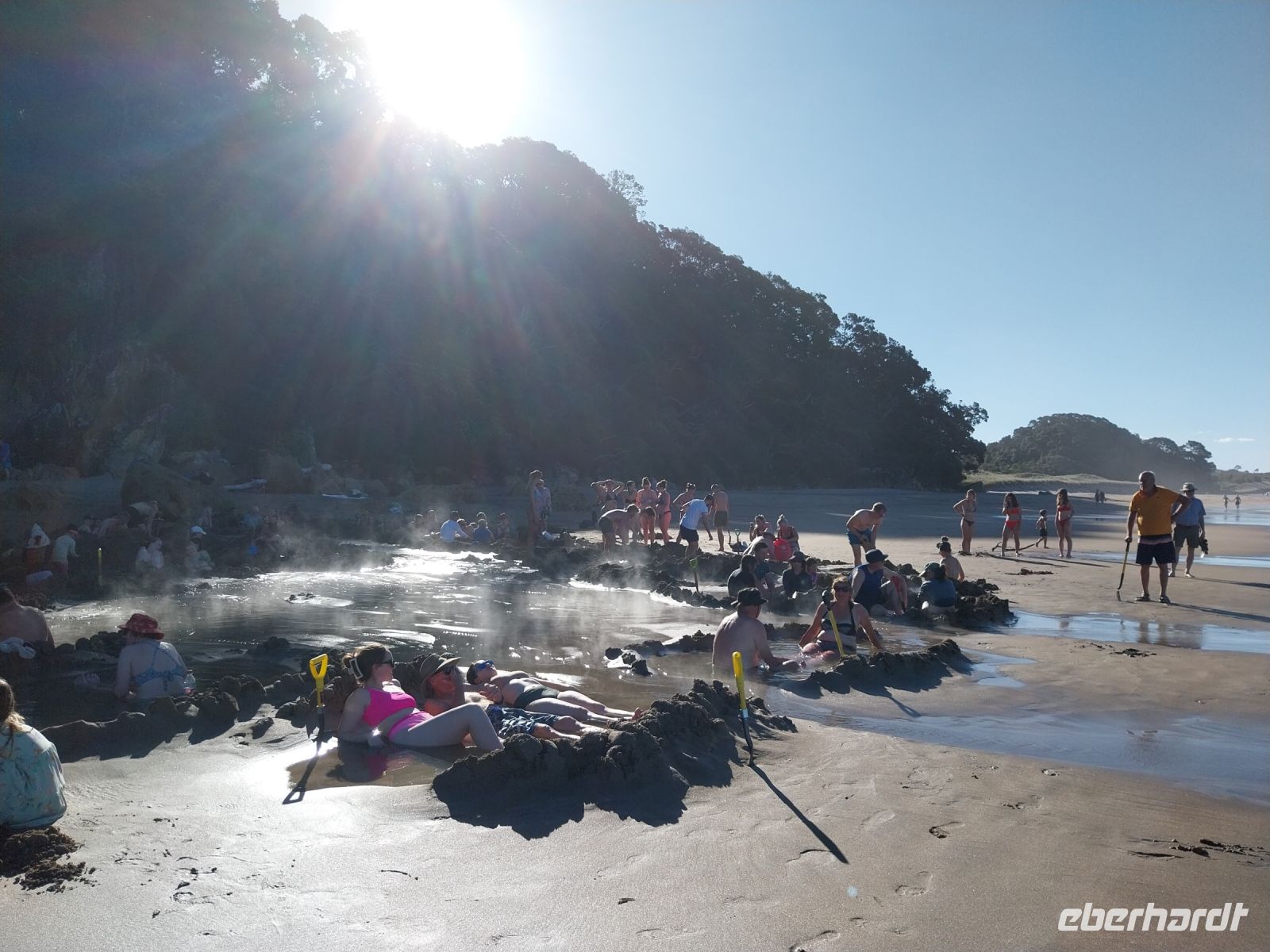 Da nun Ebbe wurde, konnten wir nun noch den Hot-Water Beach besuchen. Mit Schaufeln ausgestattet, suchten wir nach heißen Quellen im Sand. Es war wirklich ein Erlebnis, wie heiß das aufsteigende Wasser war. Teils konnte man nicht einmal barfuß hindurch gehen ohne eventuell Verbrennungen an den Füßen zu bekommen. Auf dem Rückweg hielten wir noch an einer Kiwi-Plantage.