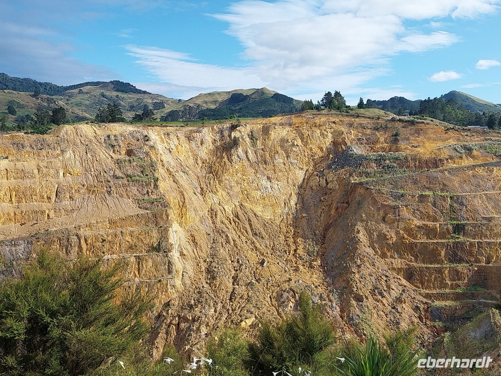 Wir setzten unsere Reise in südlicher Richtung fort. Zunächst hielten wir in Waihi, eine Goldgräberstadt. In die riesige Mine konnten wir vom Rand aus hineinschauen.