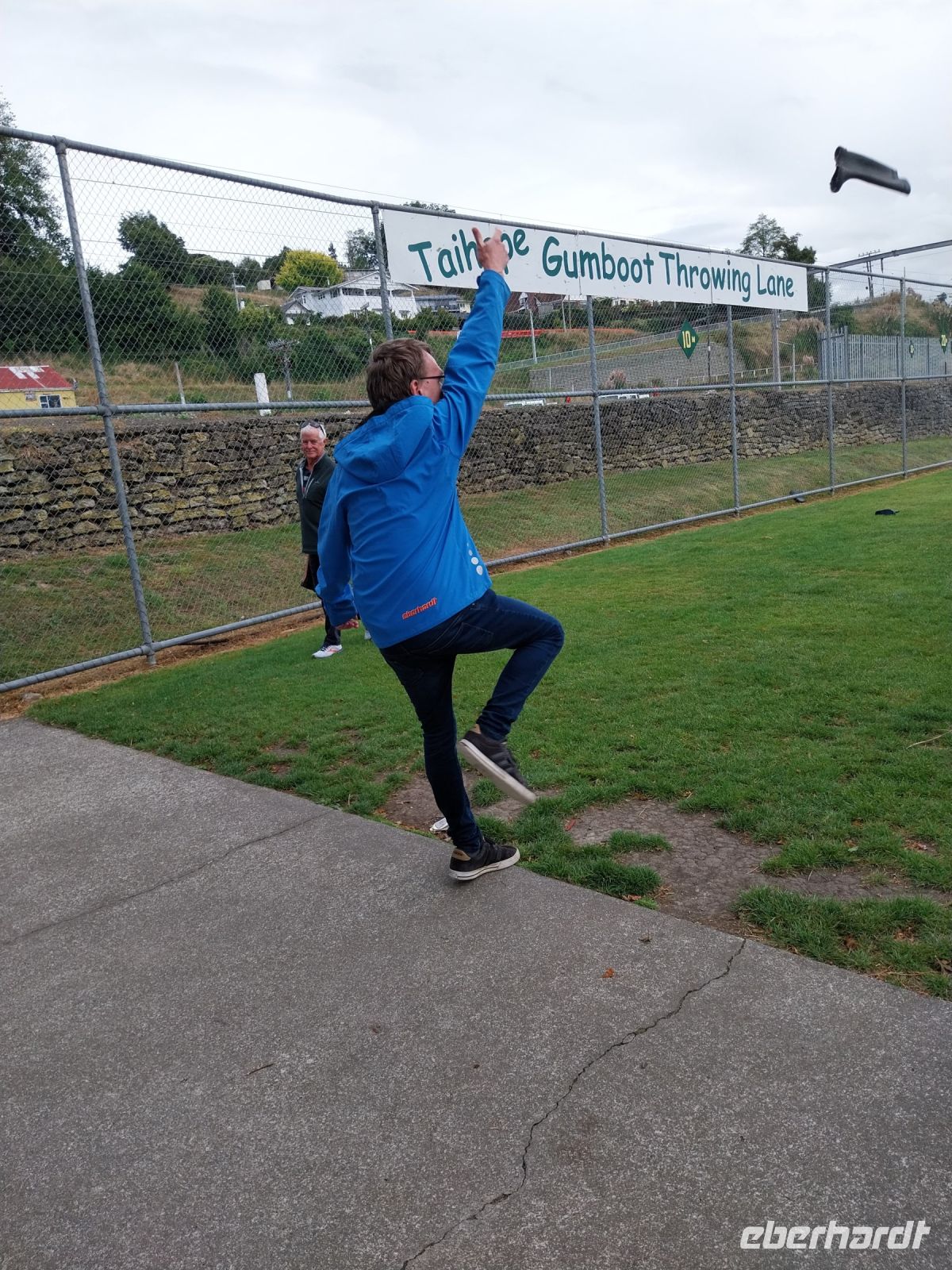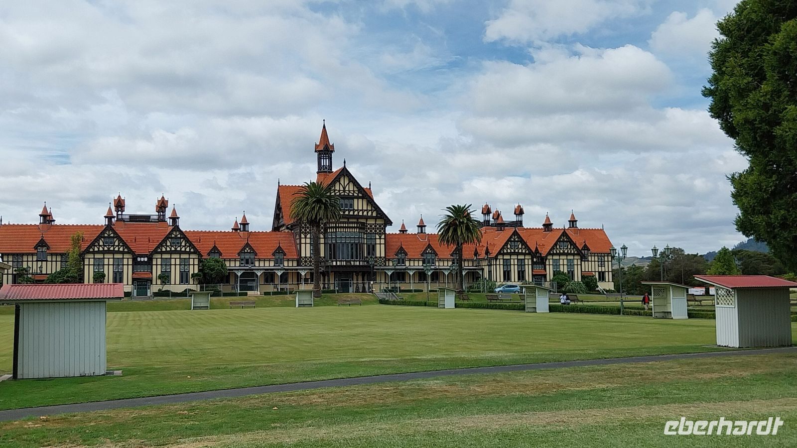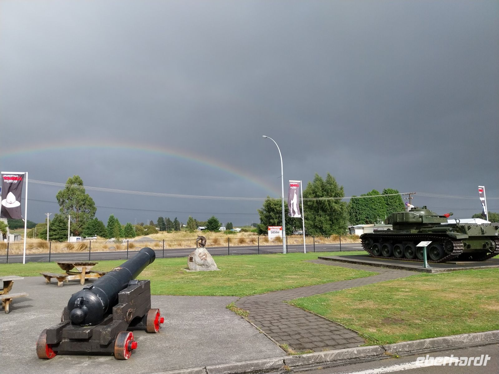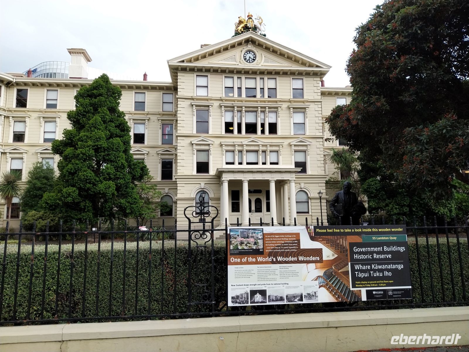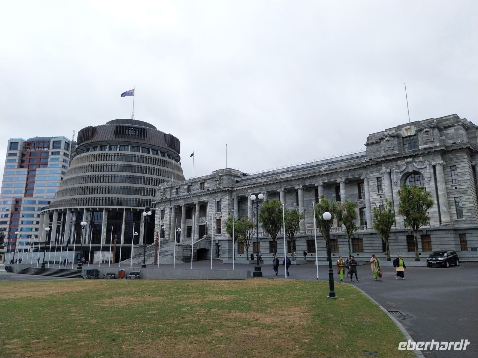 Anschließend führte unsere Fahrt über Waiouru und Taihape. Hier sahen wir uns im Nationalen Armeemuseum alte ausgemusterte Panzer an und versuchten uns im Gummistiefel-Weitwurf. Den Rekord von 56,65m erreichten wir jedoch nicht. Das Wetter war sehr wechselhaft. Zwischenzeitlich war es stürmisch und schüttete aus Kannen, aber bei unserer Ankunft in Wellington war es wieder angenehm. Wir sahen das alte Government Building, welches eines der größten Holzgebäude der Welt ist, das Parlament aus neuseeländischem Marmor und besichtigten die hübsche anglikanische Kirche Old St. Paul. Vom Mount Victoria genossen wir die Aussicht auf Stadt und Flughafen und fuhren an zwei Schildern, welche zur Vorsicht, wegen eventuell dort brütender Pinguine baten, zum Hotel.