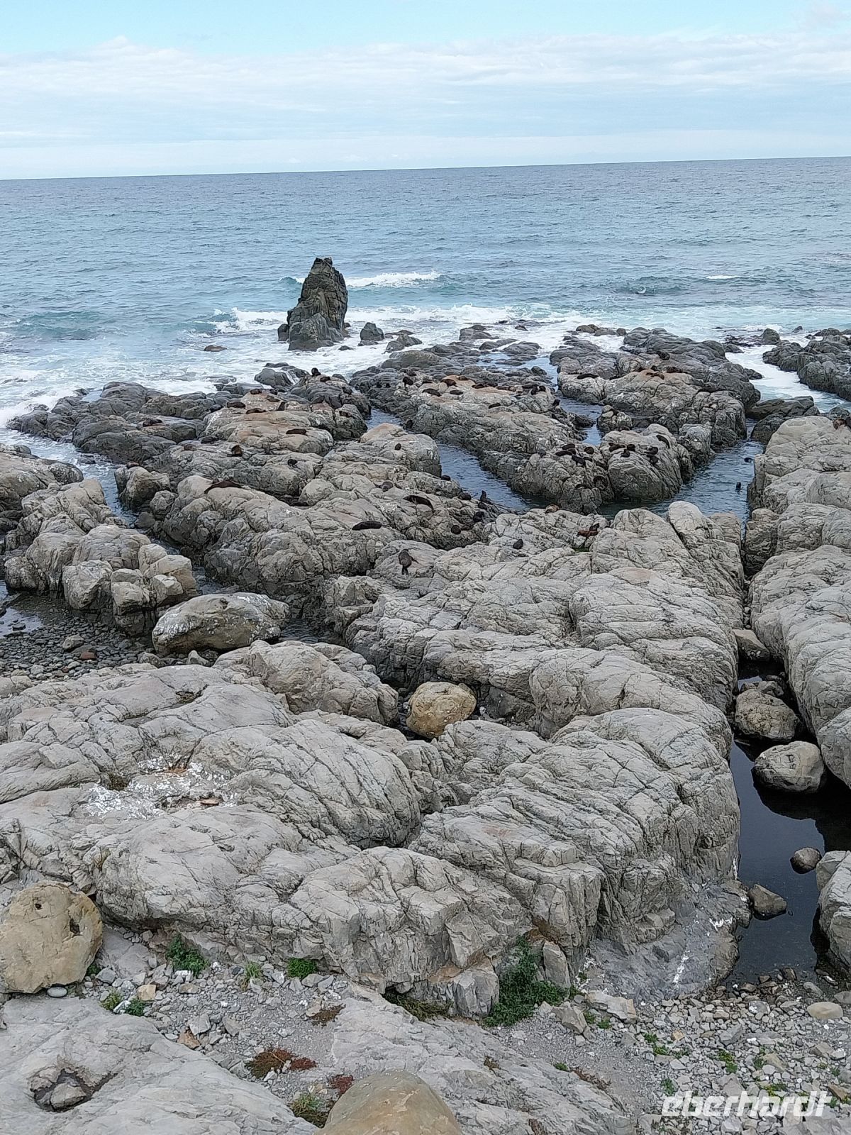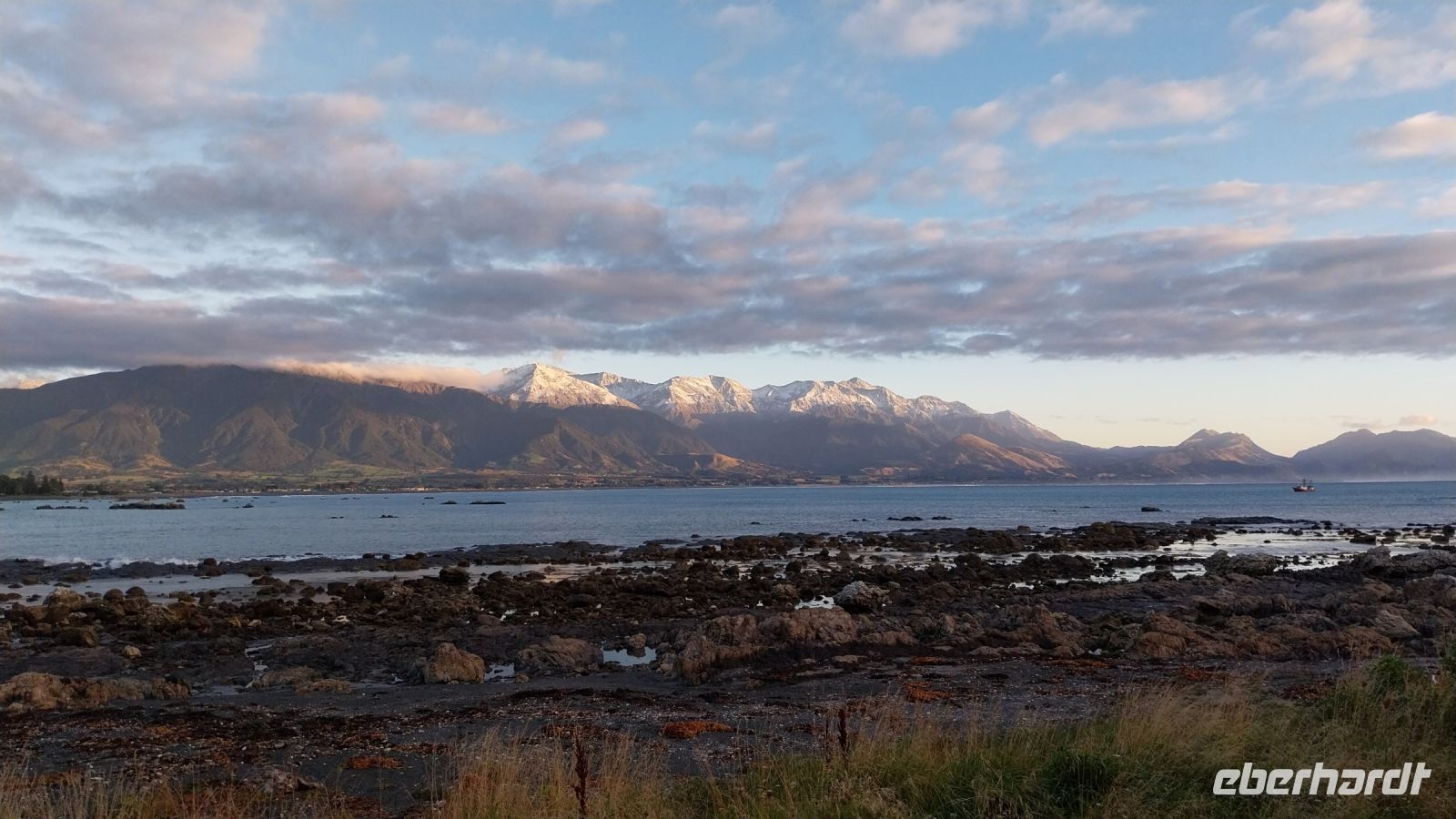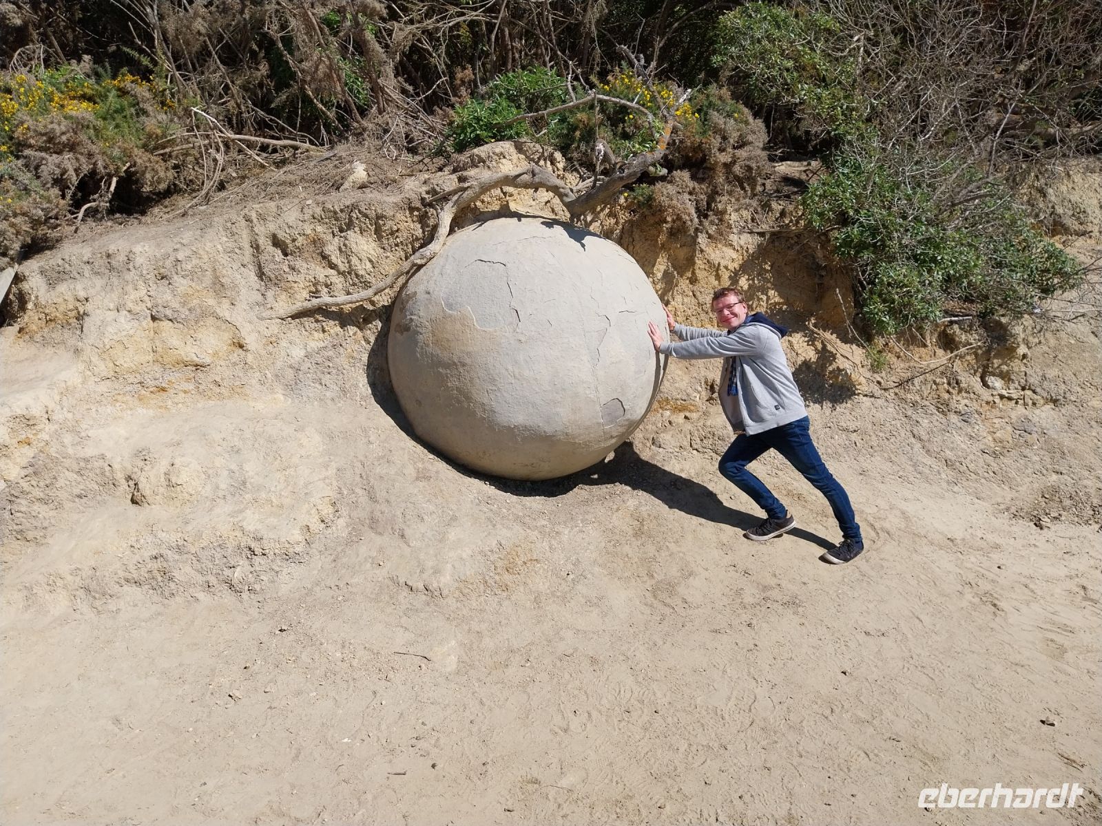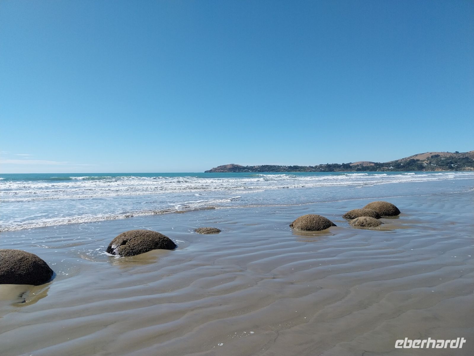 Am Morgen herrschte wieder gute Sicht, so dass wir nochmals die schneebedeckten Gipfel der Südalpen sahen. Anschließend fuhren wir wieder in Richtung Pazifik zur Straße Nummer 1 und hielten an den Moeraki Boulders. Wir staunten über die teils riesigen Steinkugeln, welche aus Ton, Lehm und Schlamm entstanden. Einige sahen wie Schildkrötenpanzer aus.